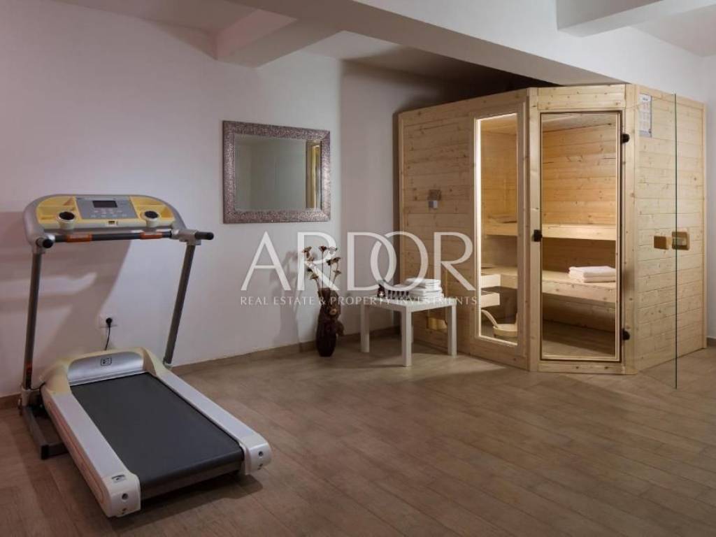 In addition to its luxurious interiors, the villa boasts outstanding outdoor amenities: a private spa area with sauna and jacuzzi, a heated pool, an automatic garden irrigation system, central pellet heating, and five air conditioning units. The landscaped courtyard with a large outdoor grill further enhances the villa’s appeal.