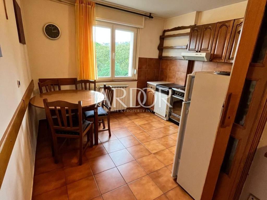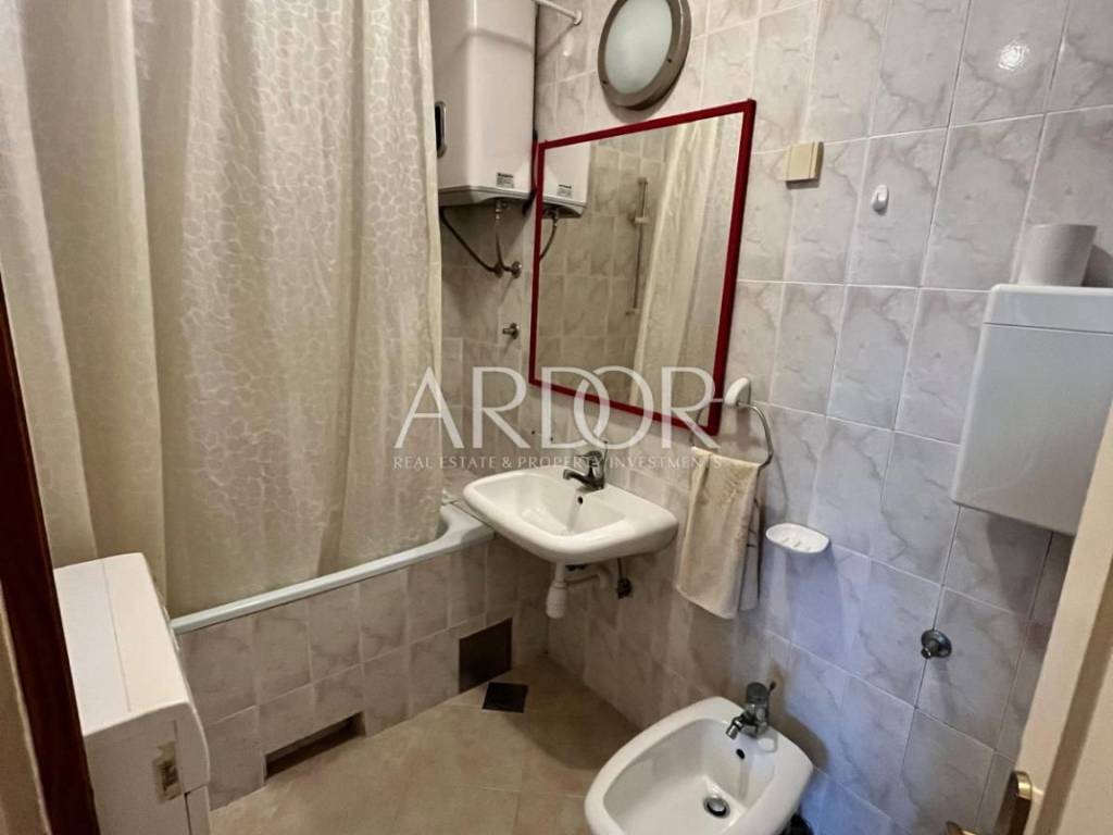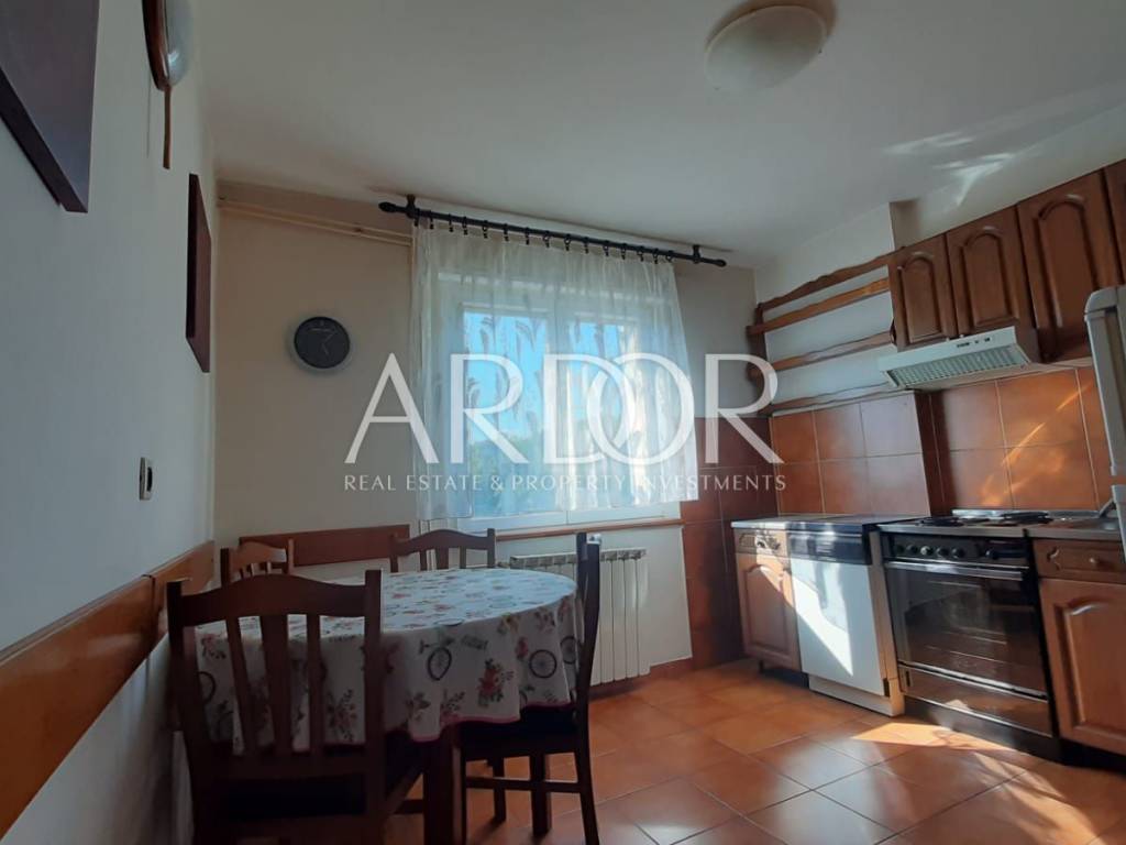 The apartment consists of three spacious rooms facing south, ensuring plenty of natural light throughout the day, while the kitchen and dining room are west-facing. The balcony offers a beautiful sea view, ideal for relaxing and enjoying sunsets.