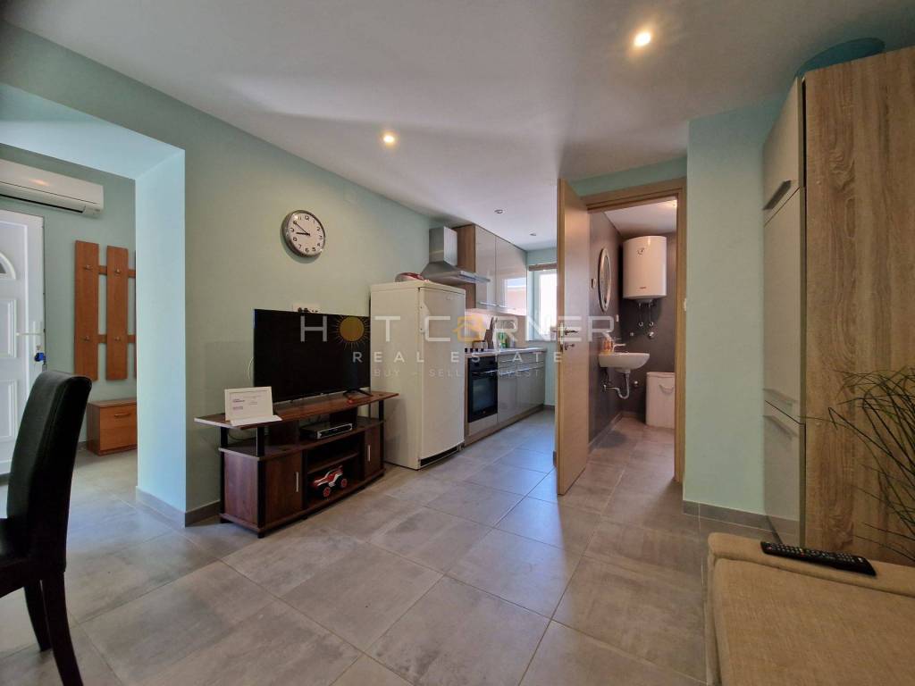 The house consists of 2 separate apartments. The ground floor features a 45 m² apartment with entrance hall, bathroom, bedroom, kitchen and dining area with living space, and an outdoor terrace.