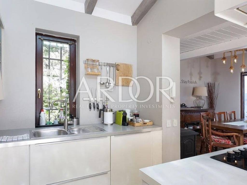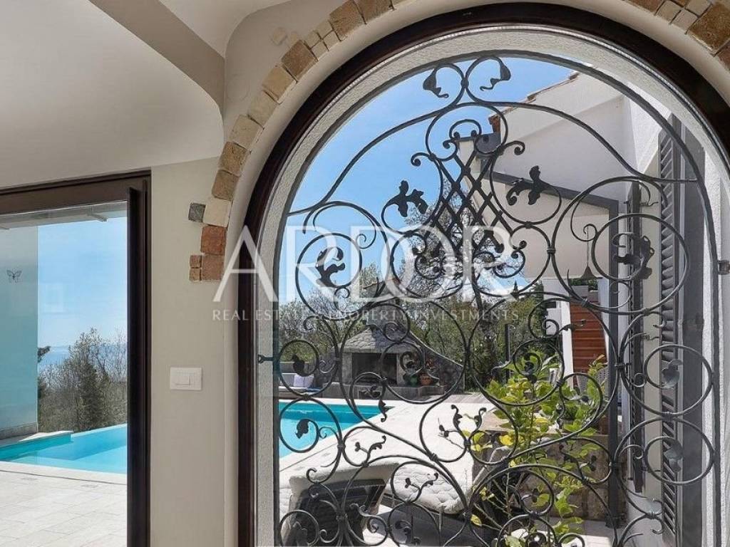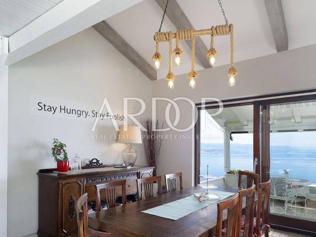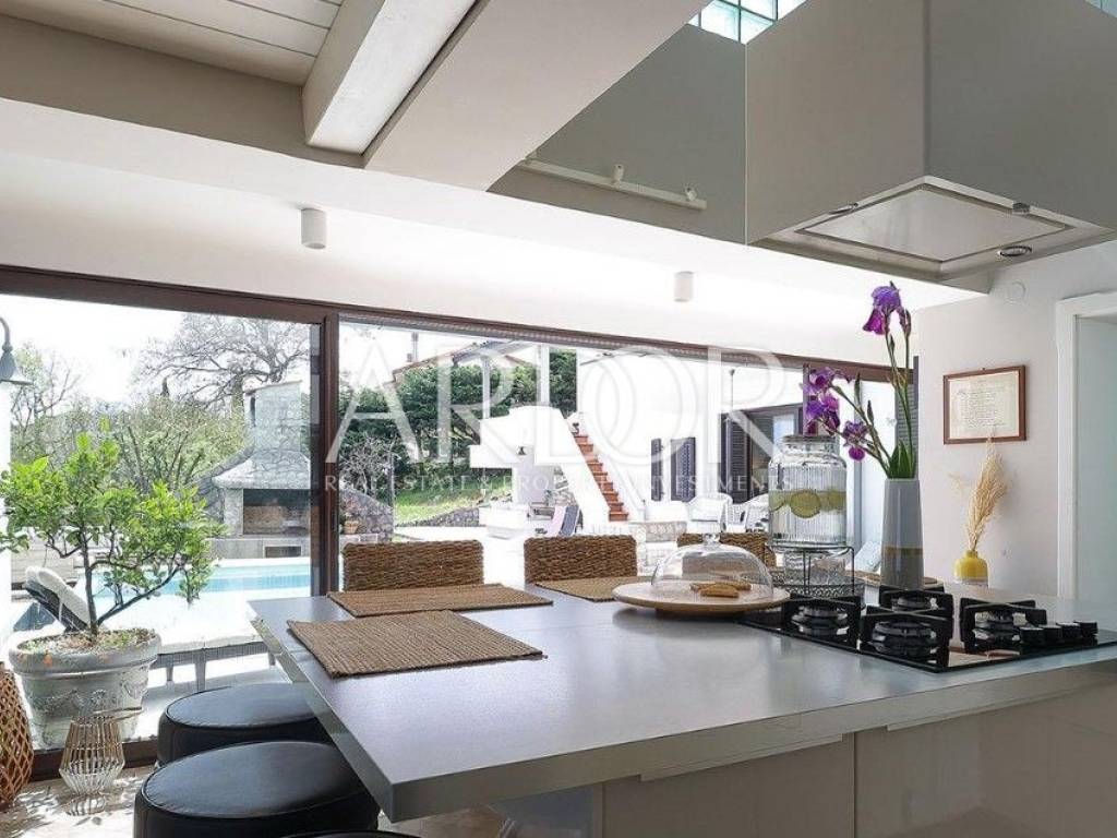 The beautiful main living room is connected to the spacious dining room and kitchen, while the entire space has an unobstructed view of the Kvarner Bay, and from the dining room you can exit to a charming balcony where the view is breathtaking. From the beautifully decorated and fully equipped kitchen you can exit to the terrace with a swimming pool. In addition to this, there is another living room with a kitchen and dining room, which ensures functionality and convenience in everyday life.