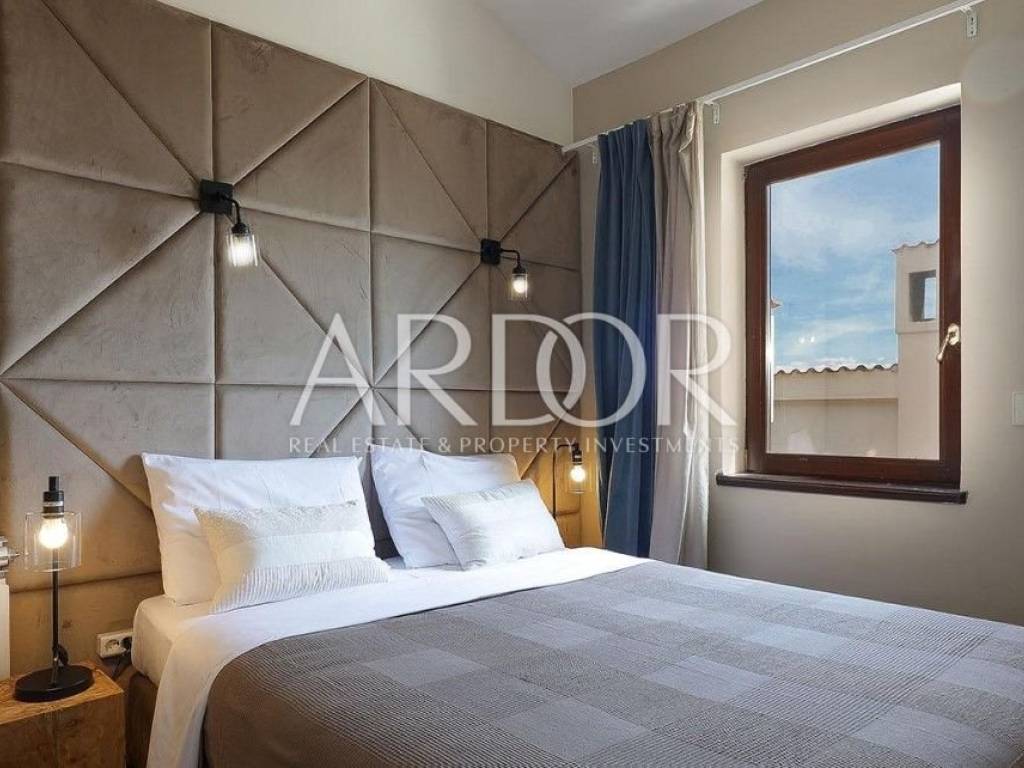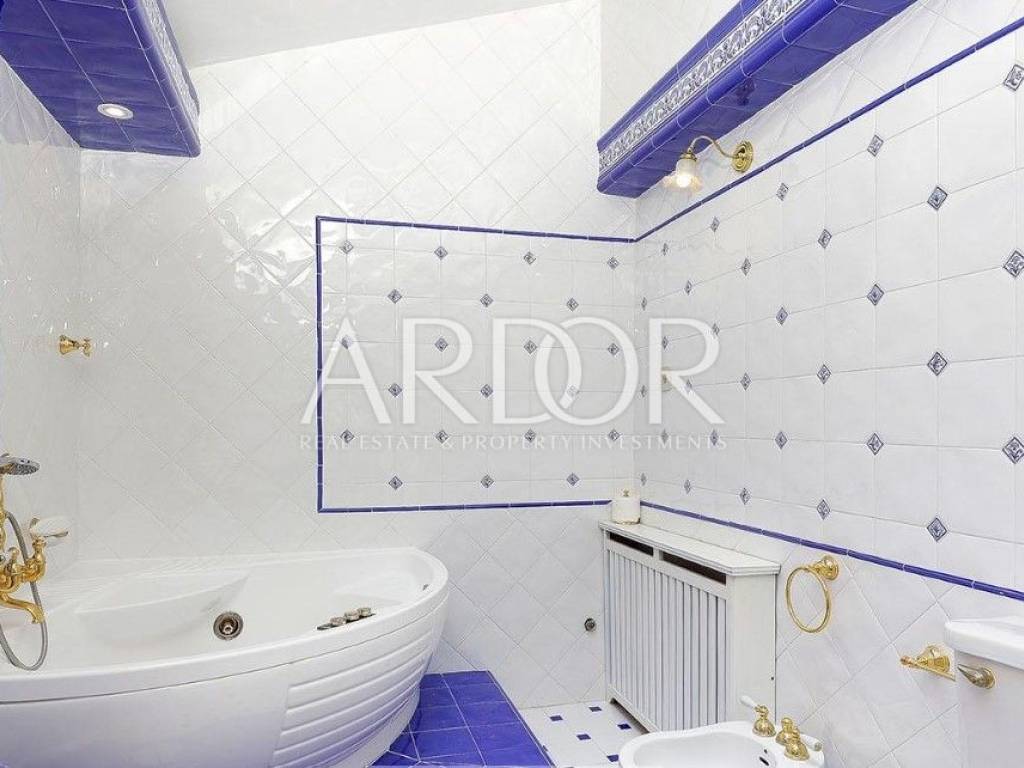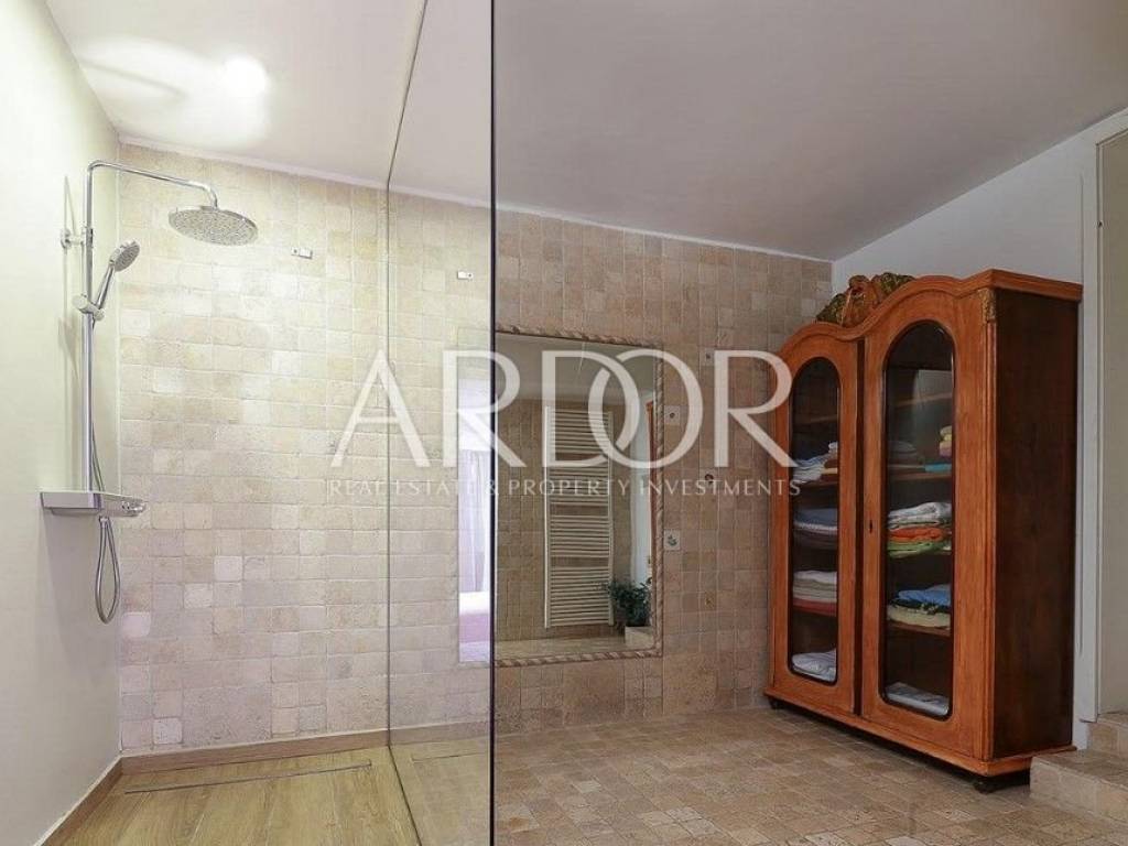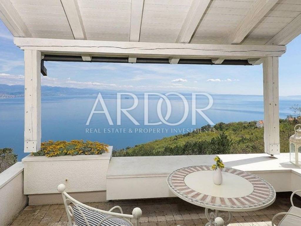 The beautiful main living room is connected to the spacious dining room and kitchen, while the entire space has an unobstructed view of the Kvarner Bay, and from the dining room you can exit to a charming balcony where the view is breathtaking. From the beautifully decorated and fully equipped kitchen you can exit to the terrace with a swimming pool. In addition to this, there is another living room with a kitchen and dining room, which ensures functionality and convenience in everyday life.