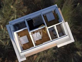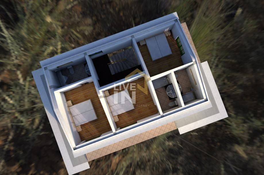 Unutarnje stepenice vode na kat gdje su planirane tri spavaće sobe svaka sa svojom kupaonicom te balkonom sa pogledom na more.
