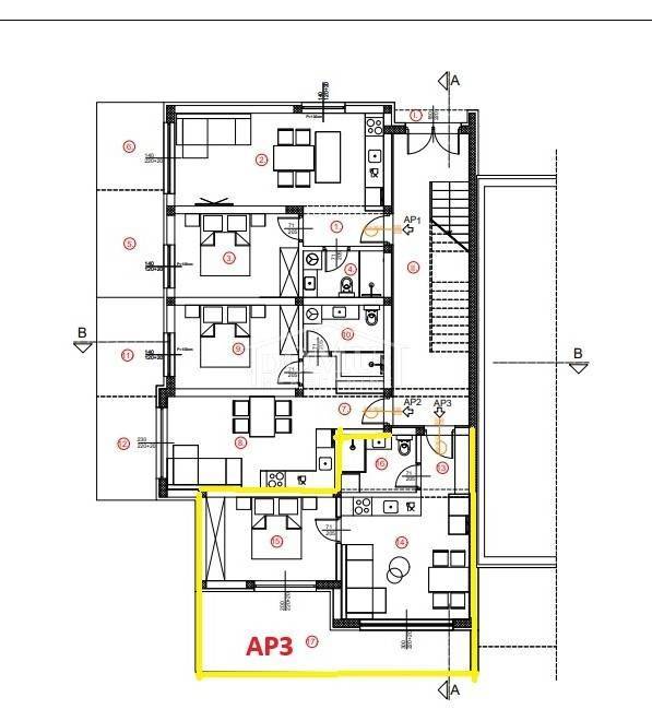 Residential unit AP3 is located on the ground floor of the building and has a total surface area of 55.53 m². The apartment consists of an entrance hall, kitchen, dining area, living room, bathroom, and one bedroom. The apartment features a terrace with a total surface area of 17.5 m², partially covered and partially uncovered, with direct access from both the living room and the bedroom.