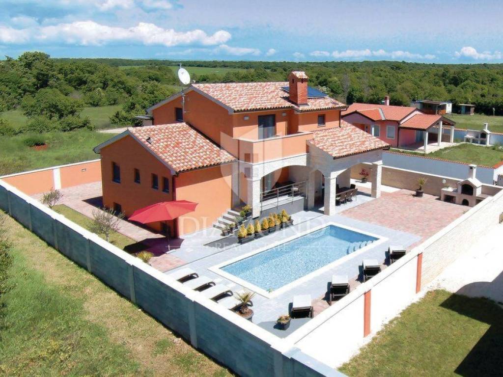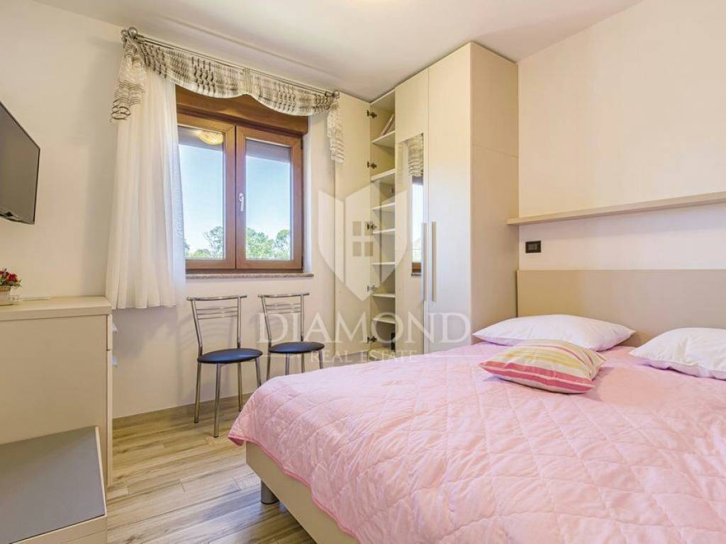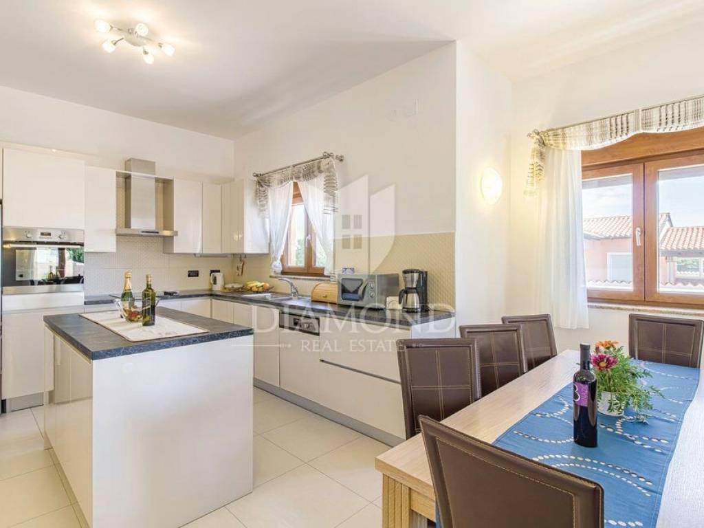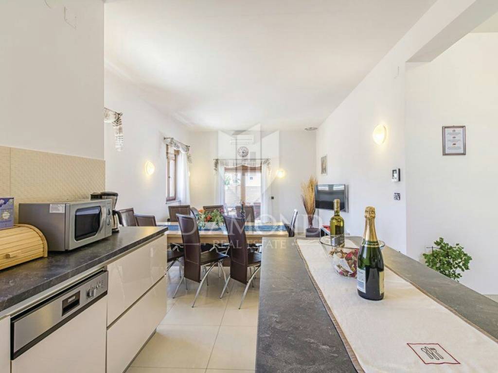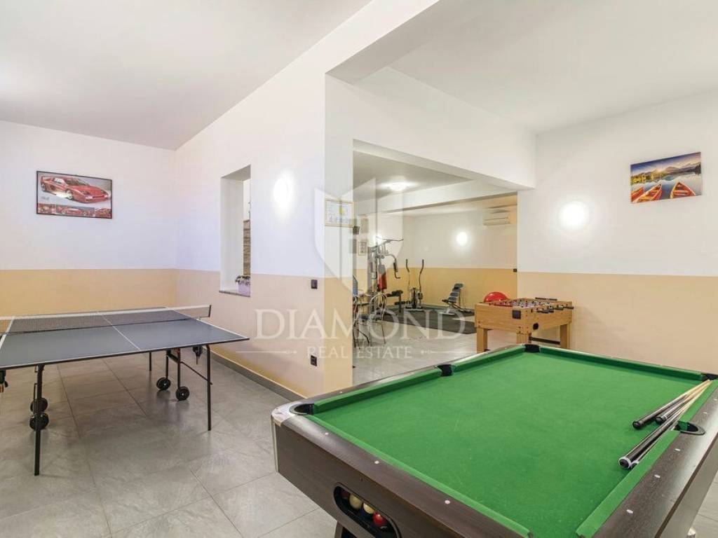 We are selling a beautiful holiday house in the vicinity of Šišan. The house is a two-storey house, measuring 330 square meters, and consists of a basement with a large playroom with a billiard table, table football, table tennis and darts. There are also several exercise equipment and a toilet and shower. The ground floor combines two bedrooms with bathrooms, walk in closet and exit to the balcony, large living room with kitchen and dining room which also has a direct connection to the pool, and one guest toilet. Upstairs are two bedrooms and a storage space. All rooms in the house have air conditioning, and each room is equipped with a TV. The garden contains 550 square meters, is fully fenced and under video surveillance. The entrance to the plot is through an automated gate to a spacious parking lot where five cars fit. The garden is beautifully decorated and maintained, and special attention is drawn to the beautiful mosaic pool of 25 m2. The house is for sale fully furnished and is located in a very nice and quiet location 5 kilometers from Medulin and beautiful beaches. Facilities such as shops, restaurants and cafés are even closer, 3 kilometers away. This beautiful house is in tourist rent throughout the season and achieves a very nice yield, and the new owner has the opportunity to take a well-established business. It is also ideal as a family house or your own cottage because of its excellent position.