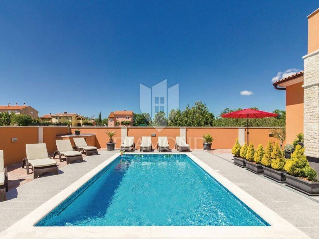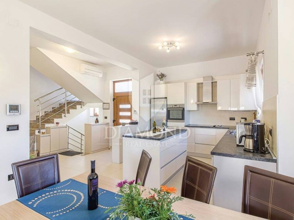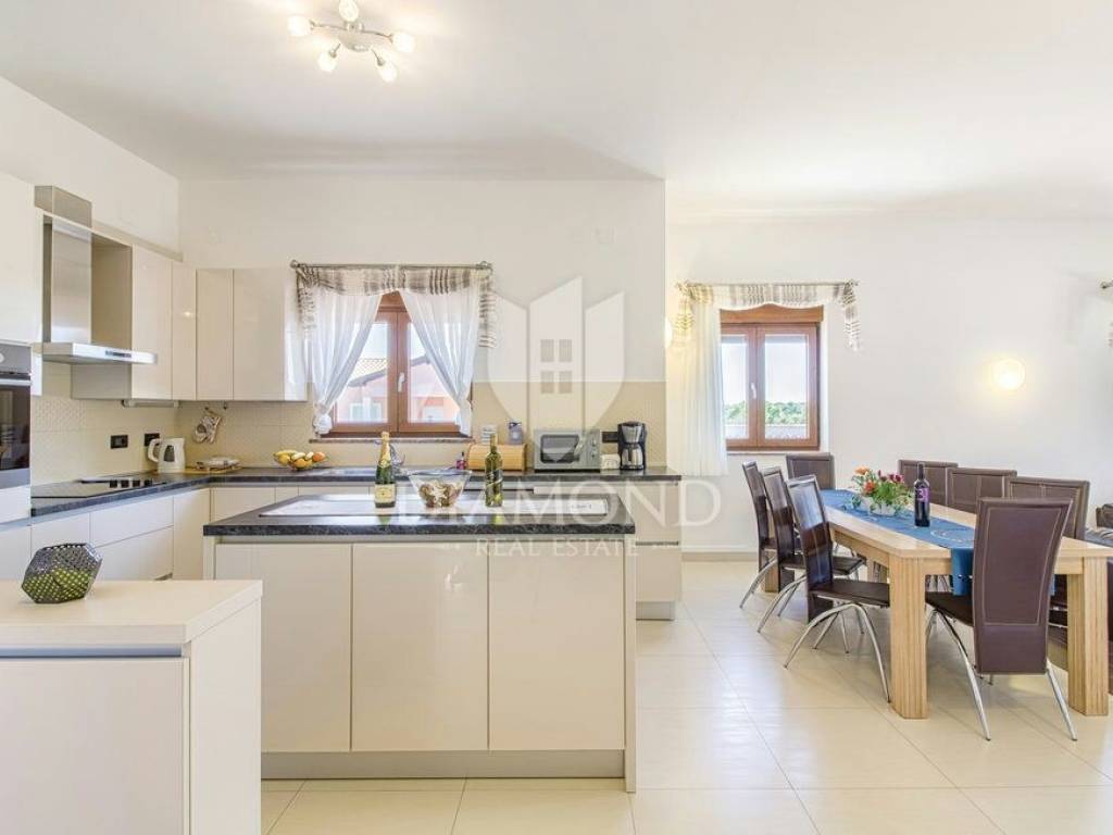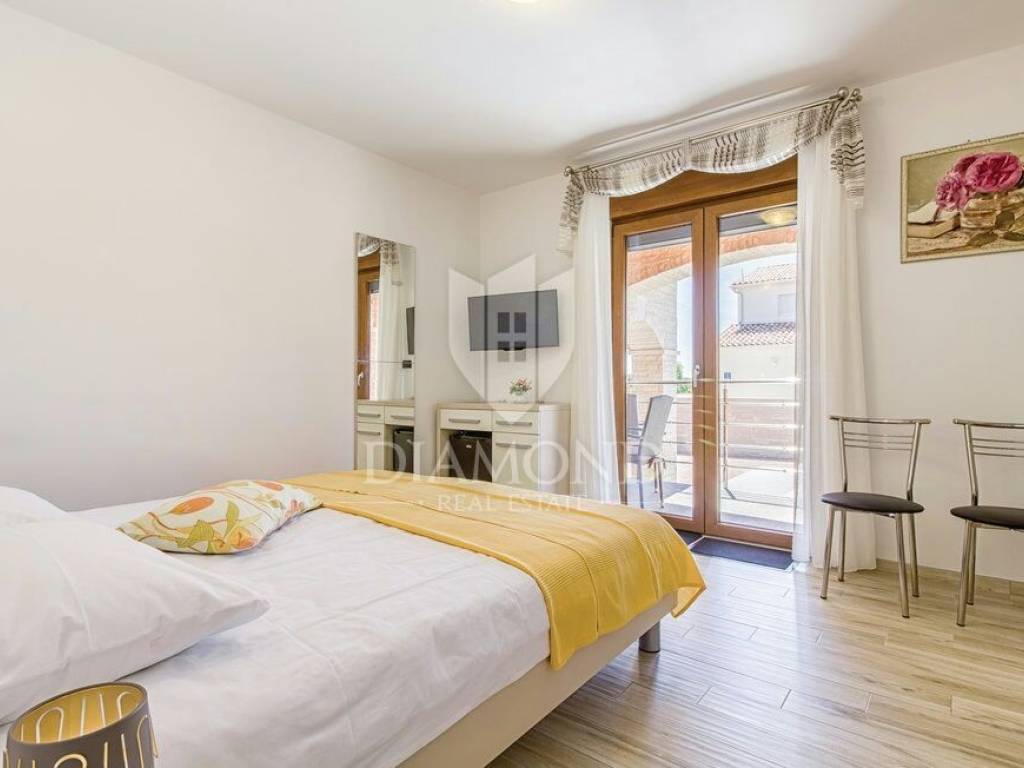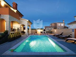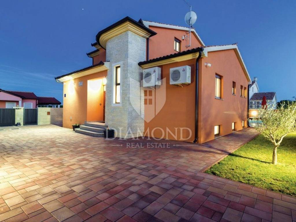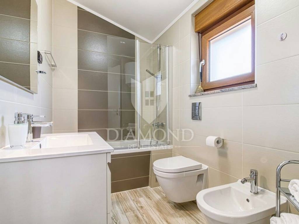 We are selling a beautiful holiday house in the vicinity of Šišan. The house is a two-storey house, measuring 330 square meters, and consists of a basement with a large playroom with a billiard table, table football, table tennis and darts. There are also several exercise equipment and a toilet and shower. The ground floor combines two bedrooms with bathrooms, walk in closet and exit to the balcony, large living room with kitchen and dining room which also has a direct connection to the pool, and one guest toilet. Upstairs are two bedrooms and a storage space. All rooms in the house have air conditioning, and each room is equipped with a TV. The garden contains 550 square meters, is fully fenced and under video surveillance. The entrance to the plot is through an automated gate to a spacious parking lot where five cars fit. The garden is beautifully decorated and maintained, and special attention is drawn to the beautiful mosaic pool of 25 m2. The house is for sale fully furnished and is located in a very nice and quiet location 5 kilometers from Medulin and beautiful beaches. Facilities such as shops, restaurants and cafés are even closer, 3 kilometers away. This beautiful house is in tourist rent throughout the season and achieves a very nice yield, and the new owner has the opportunity to take a well-established business. It is also ideal as a family house or your own cottage because of its excellent position.