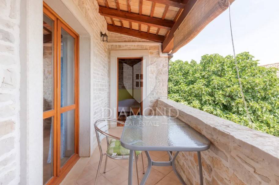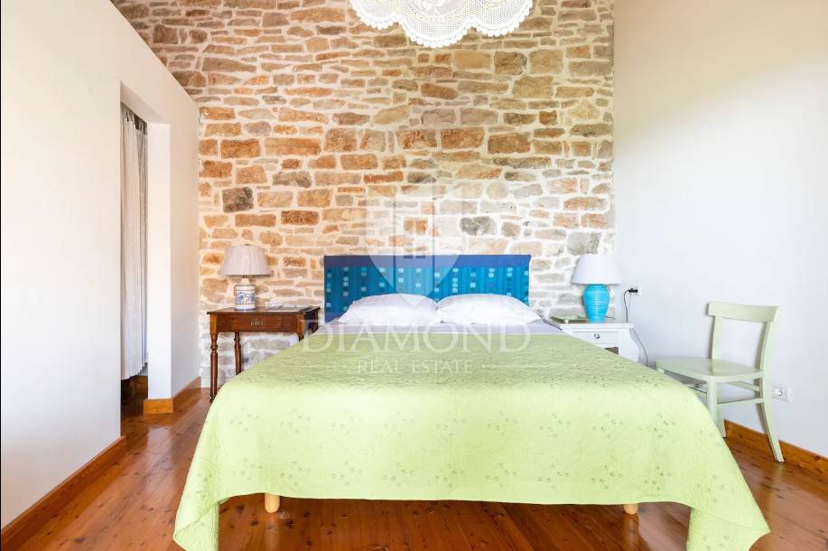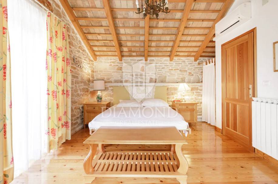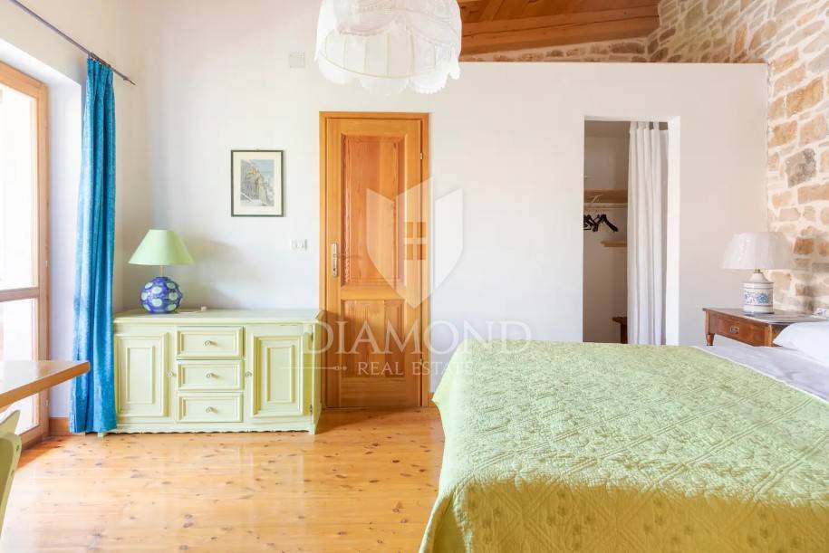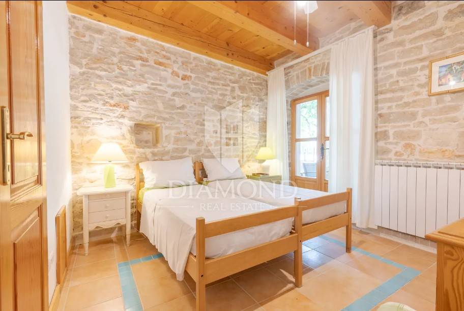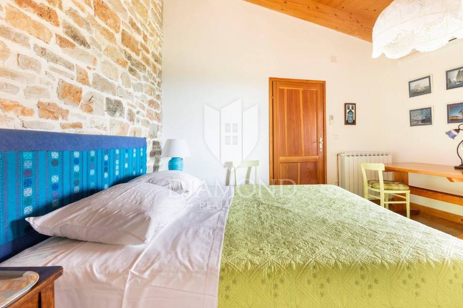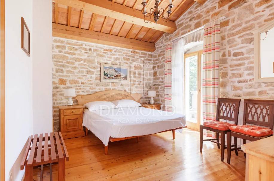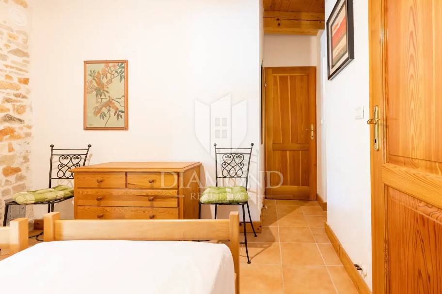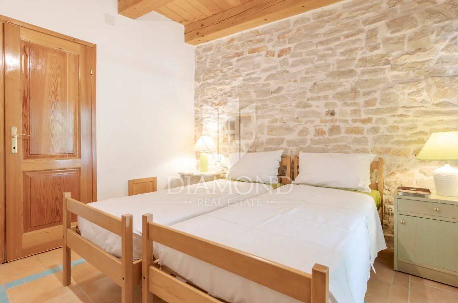 Only 5 kilometers from the small and special town of Krnica, in a small village is located this beautiful property with two indigenous stone Istrian holiday homes. On a plot of 500 m2, two stone Istrian houses have been renovated and converted into holiday homes with a swimming pool. They were completely renovated and equipped in 2015 and have been in operation as holiday homes ever since. The first house, 140 m2, consists of ground floor and first floor. The ground floor includes a comfortable living room, dining room and kitchen. There is one guest toilet with shower and a bedroom with private bathroom. Upstairs are two bedrooms with private bathrooms and one has access to a balcony with a beautiful view. On the first floor in the rooms there are air conditioners and the house has prepared installations and radiators for central heating. The second house, slightly larger than 160 m2, is also designed as a two-storey building. The ground floor consists of a living room, kitchen and dining room, a smaller service room, pantry, guest toilet and there is one bedroom with private bathroom. The first floor combines three bedrooms also with private bathrooms and access to a beautiful covered terrace overlooking the sea and surrounding nature. Air conditioners are installed in all three bedrooms upstairs and in the living room there is a functional wood stove. There are also ready-made installations for central heating. The garden is fully fenced and offers perfect peace and privacy. It is arranged and maintained and there is a beautiful pool of 22 m2 with a beautifully landscaped pool beach. Beautiful green areas and old fruit trees guarantee the comfort of staying and enough natural shade and additionally protect from the view of potential passers-by. Parking for two cars is provided on the plot. The property has a well-established rental business during the summer season and since the property is in the VAT system, the future owner does not pay real estate transfer tax. The house is an excellent investment in tourism, located in a great location just 2.5 kilometers from the first beach. The beautiful Duga Uvala is 5 kilometers away, and the first shop, restaurant and cafe are within walking distance.