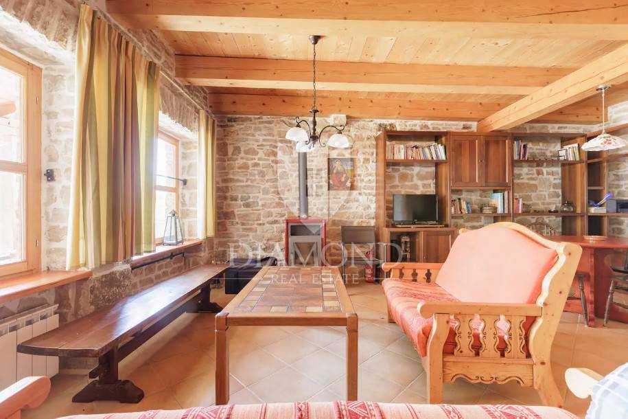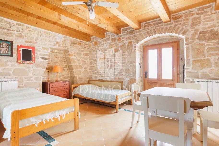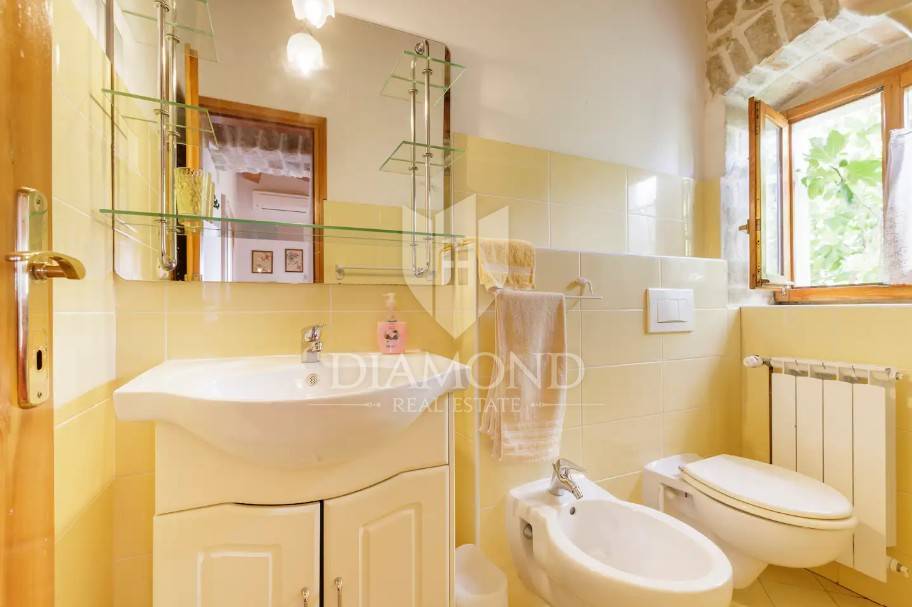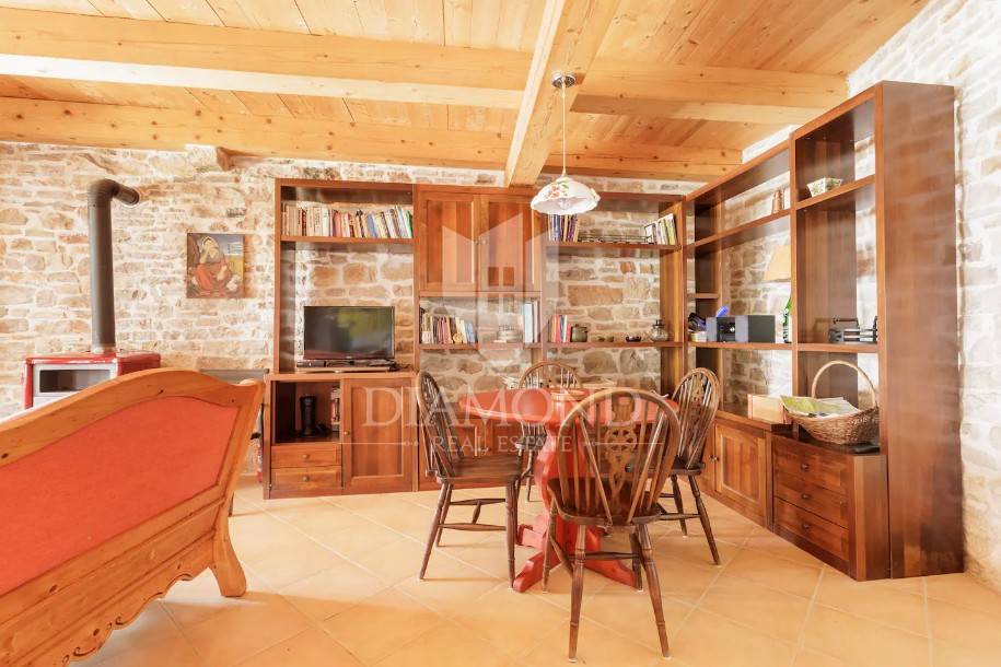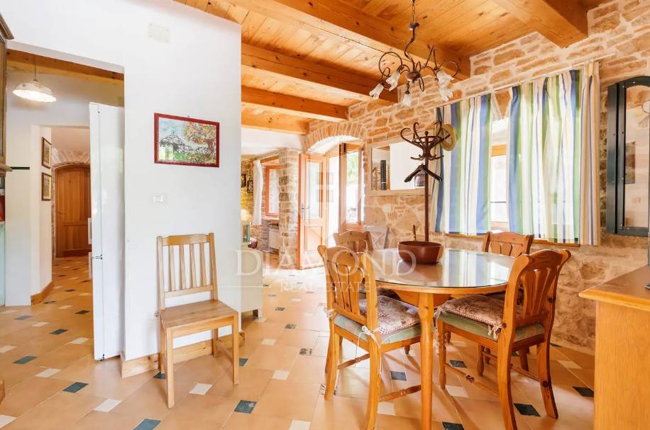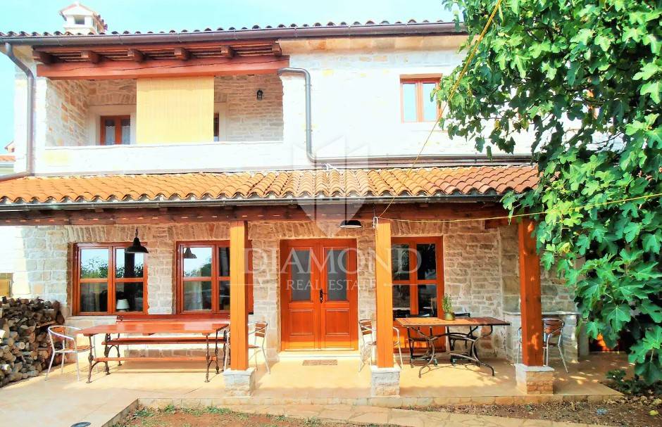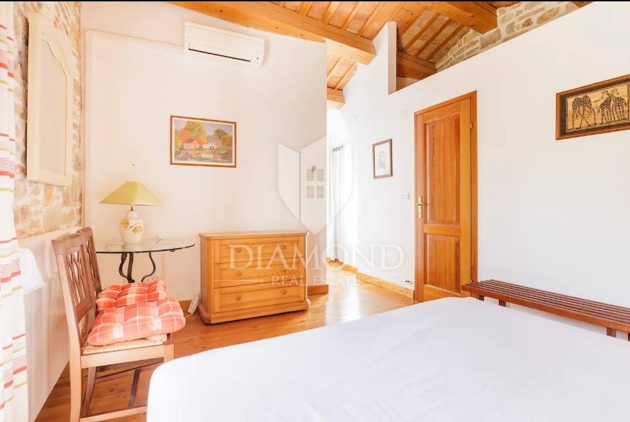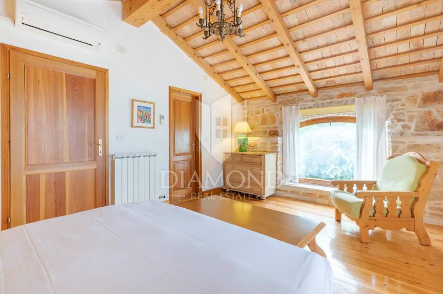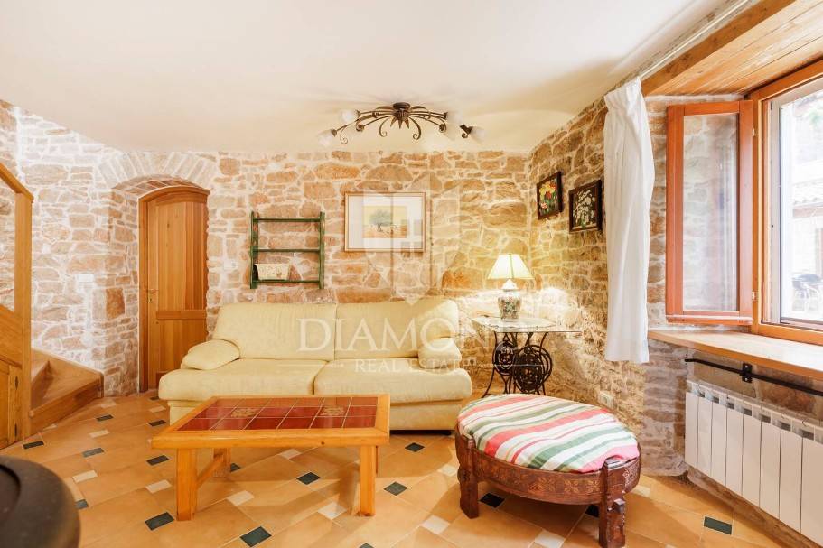Only 5 kilometers from the small and special town of Krnica, in a small village is located this beautiful property with two indigenous stone Istrian holiday homes. On a plot of 500 m2, two stone Istrian houses have been renovated and converted into holiday homes with a swimming pool. They were completely renovated and equipped in 2015 and have been in operation as holiday homes ever since. The first house, 140 m2, consists of ground floor and first floor. The ground floor includes a comfortable living room, dining room and kitchen. There is one guest toilet with shower and a bedroom with private bathroom. Upstairs are two bedrooms with private bathrooms and one has access to a balcony with a beautiful view. On the first floor in the rooms there are air conditioners and the house has prepared installations and radiators for central heating. The second house, slightly larger than 160 m2, is also designed as a two-storey building. The ground floor consists of a living room, kitchen and dining room, a smaller service room, pantry, guest toilet and there is one bedroom with private bathroom. The first floor combines three bedrooms also with private bathrooms and access to a beautiful covered terrace overlooking the sea and surrounding nature. Air conditioners are installed in all three bedrooms upstairs and in the living room there is a functional wood stove. There are also ready-made installations for central heating. The garden is fully fenced and offers perfect peace and privacy. It is arranged and maintained and there is a beautiful pool of 22 m2 with a beautifully landscaped pool beach. Beautiful green areas and old fruit trees guarantee the comfort of staying and enough natural shade and additionally protect from the view of potential passers-by. Parking for two cars is provided on the plot. The property has a well-established rental business during the summer season and since the property is in the VAT system, the future owner does not pay real estate transfer tax. The house is an excellent investment in tourism, located in a great location just 2.5 kilometers from the first beach. The beautiful Duga Uvala is 5 kilometers away, and the first shop, restaurant and cafe are within walking distance.