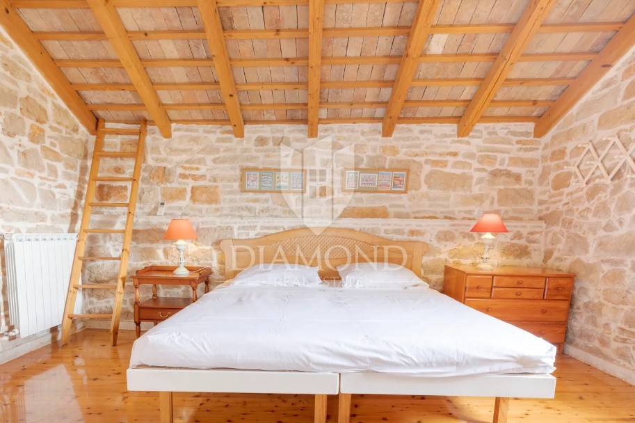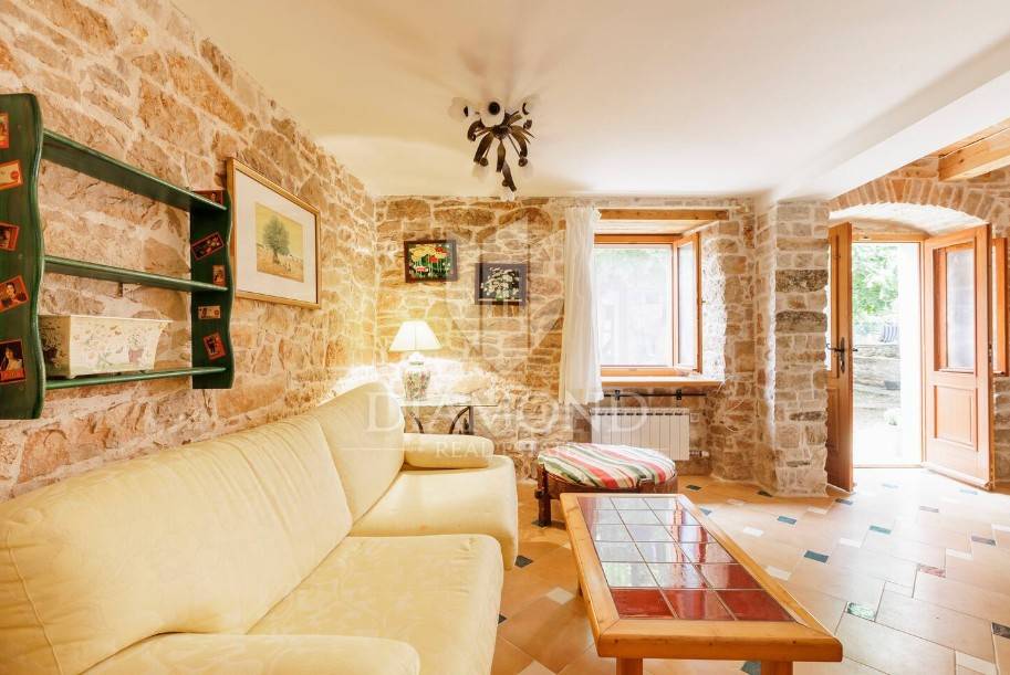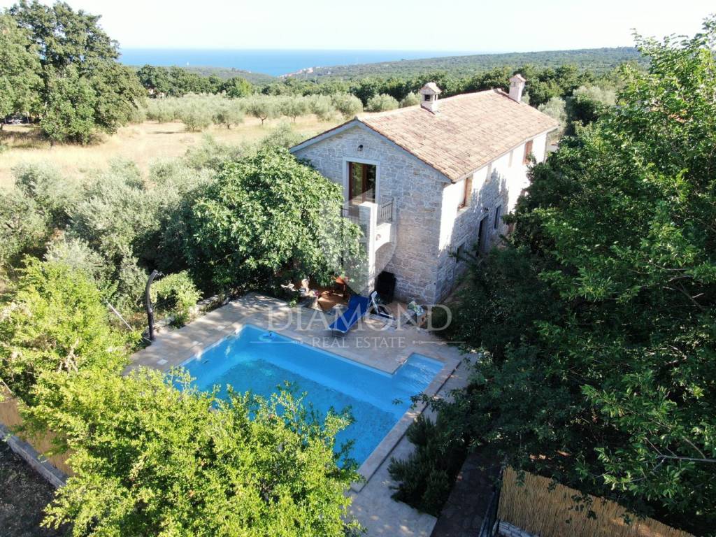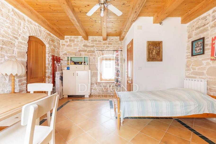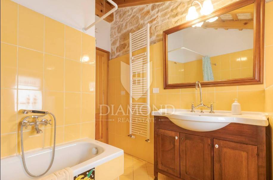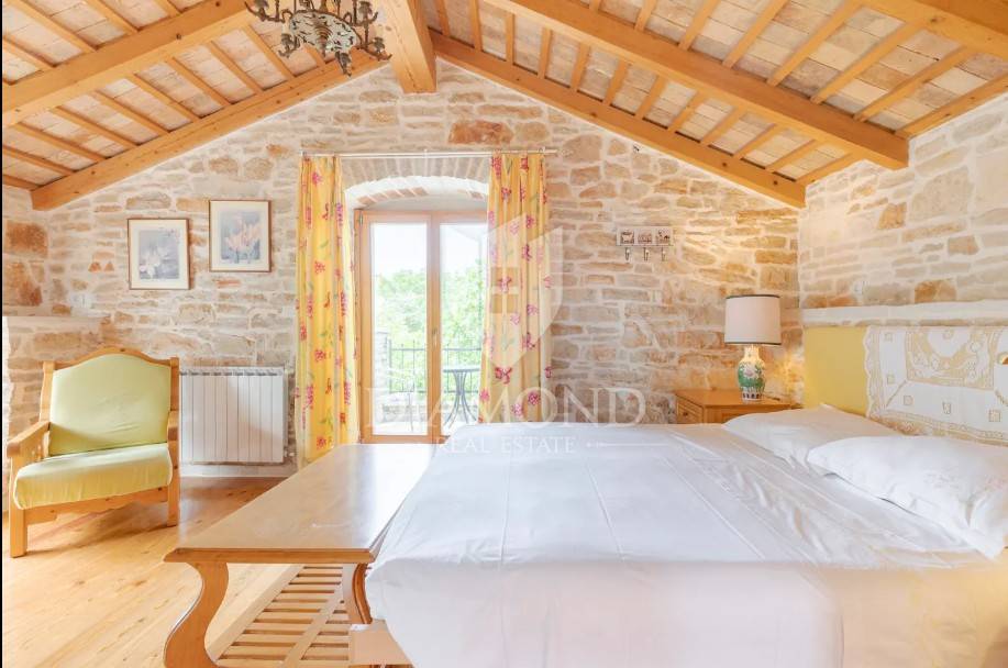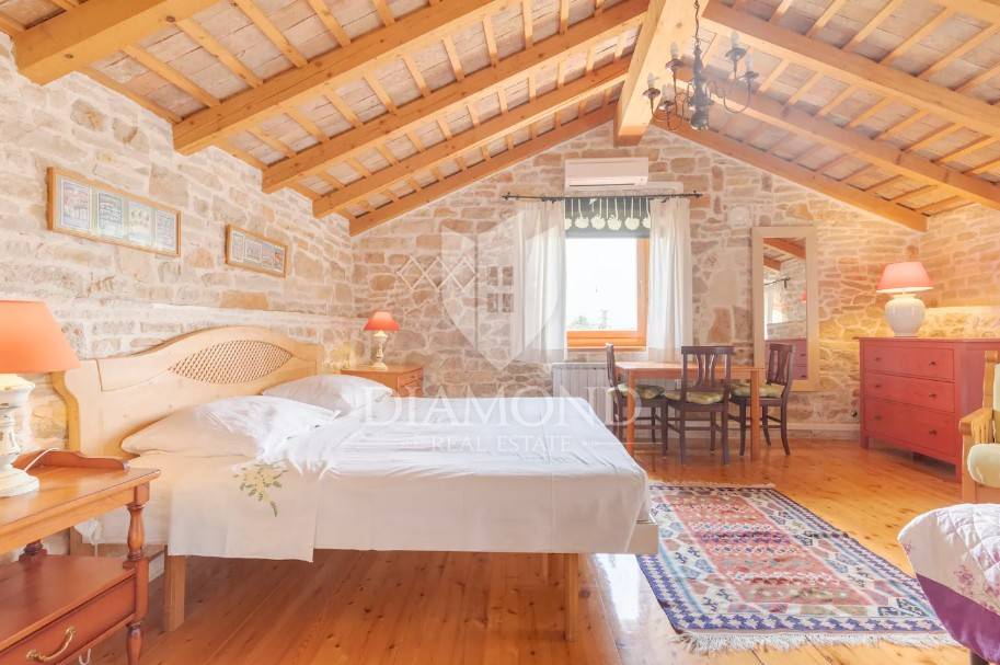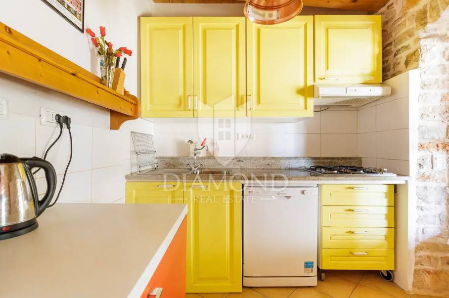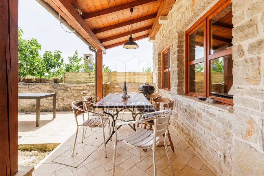 Only 5 kilometers from the small and special town of Krnica, in a small village is located this beautiful property with two indigenous stone Istrian holiday homes. On a plot of 500 m2, two stone Istrian houses have been renovated and converted into holiday homes with a swimming pool. They were completely renovated and equipped in 2015 and have been in operation as holiday homes ever since. The first house, 140 m2, consists of ground floor and first floor. The ground floor includes a comfortable living room, dining room and kitchen. There is one guest toilet with shower and a bedroom with private bathroom. Upstairs are two bedrooms with private bathrooms and one has access to a balcony with a beautiful view. On the first floor in the rooms there are air conditioners and the house has prepared installations and radiators for central heating. The second house, slightly larger than 160 m2, is also designed as a two-storey building. The ground floor consists of a living room, kitchen and dining room, a smaller service room, pantry, guest toilet and there is one bedroom with private bathroom. The first floor combines three bedrooms also with private bathrooms and access to a beautiful covered terrace overlooking the sea and surrounding nature. Air conditioners are installed in all three bedrooms upstairs and in the living room there is a functional wood stove. There are also ready-made installations for central heating. The garden is fully fenced and offers perfect peace and privacy. It is arranged and maintained and there is a beautiful pool of 22 m2 with a beautifully landscaped pool beach. Beautiful green areas and old fruit trees guarantee the comfort of staying and enough natural shade and additionally protect from the view of potential passers-by. Parking for two cars is provided on the plot. The property has a well-established rental business during the summer season and since the property is in the VAT system, the future owner does not pay real estate transfer tax. The house is an excellent investment in tourism, located in a great location just 2.5 kilometers from the first beach. The beautiful Duga Uvala is 5 kilometers away, and the first shop, restaurant and cafe are within walking distance.