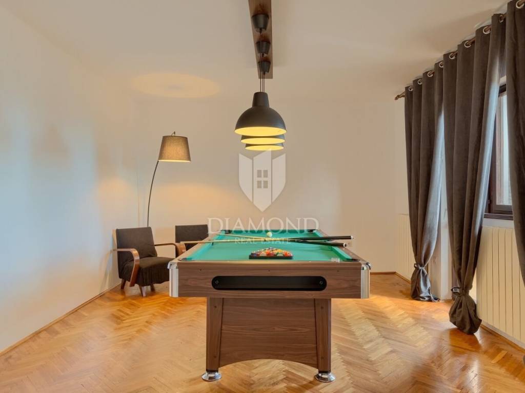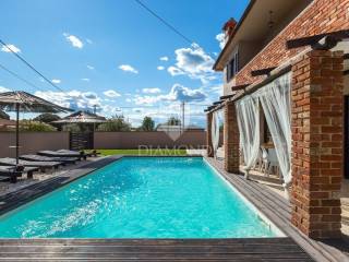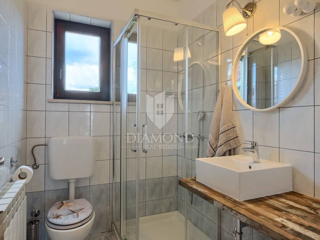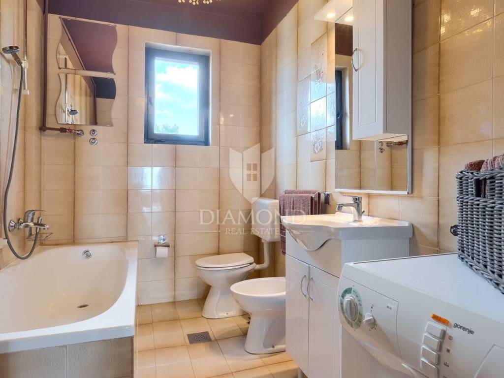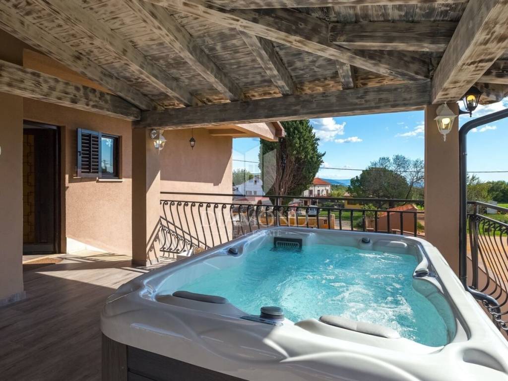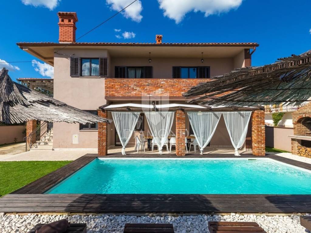 Barban, surroundings, we are selling a holiday house in a quiet location only 4 kilometers from the first beach. The house consists of a basement, ground floor and first floor with a total area of 250 m2. Upstairs there are three bedrooms, two bathrooms, a wellness area with a hydromassage tub and sauna, and a billiards room. From the wellness room, we go out to a spacious covered terrace where there is a jacuzzi tub and a lounge area with a beautiful view of the surrounding landscape and part of the sea. The ground floor includes a comfortable living room, fully equipped kitchen and dining room. There are also three bedrooms, three bathrooms and a guest toilet. The issue of heating and cooling is solved with air conditioners and pellet central heating. The basement is currently used as a storage area, and there is also a pool engine room and a boiler room. The yard is fenced and landscaped with secured parking and a garage. The 32 m2 swimming pool with an arranged sunbathing area is certainly the main place for socializing during the summer months, and the garden concept offers complete privacy, which guarantees a perfect rest and escape from the busy city life. There is also a nice covered terrace with a brick fireplace and a dining table. The house was newly renovated in 2018 and since then has been rented out for tourists, which provides the owners with excellent income every year. The house has a great location, in a small, quiet settlement, yet close to the beautiful clean sea and well-kept beaches. The first store is a 3-minute easy drive away, and there are also restaurants and cafes and numerous tourist attractions nearby. Quality real estate as an investment in the tourist rental business, close to all necessary facilities for both relaxing and active vacations and escape from everyday life.