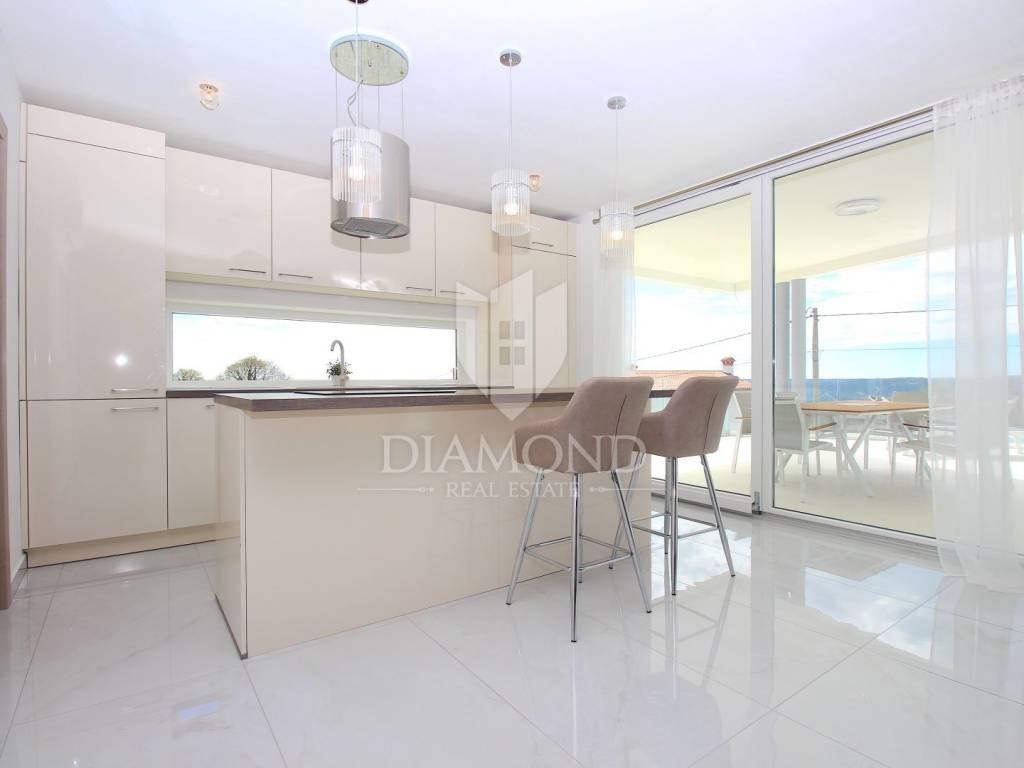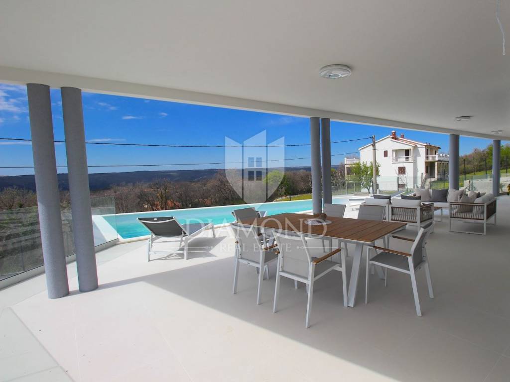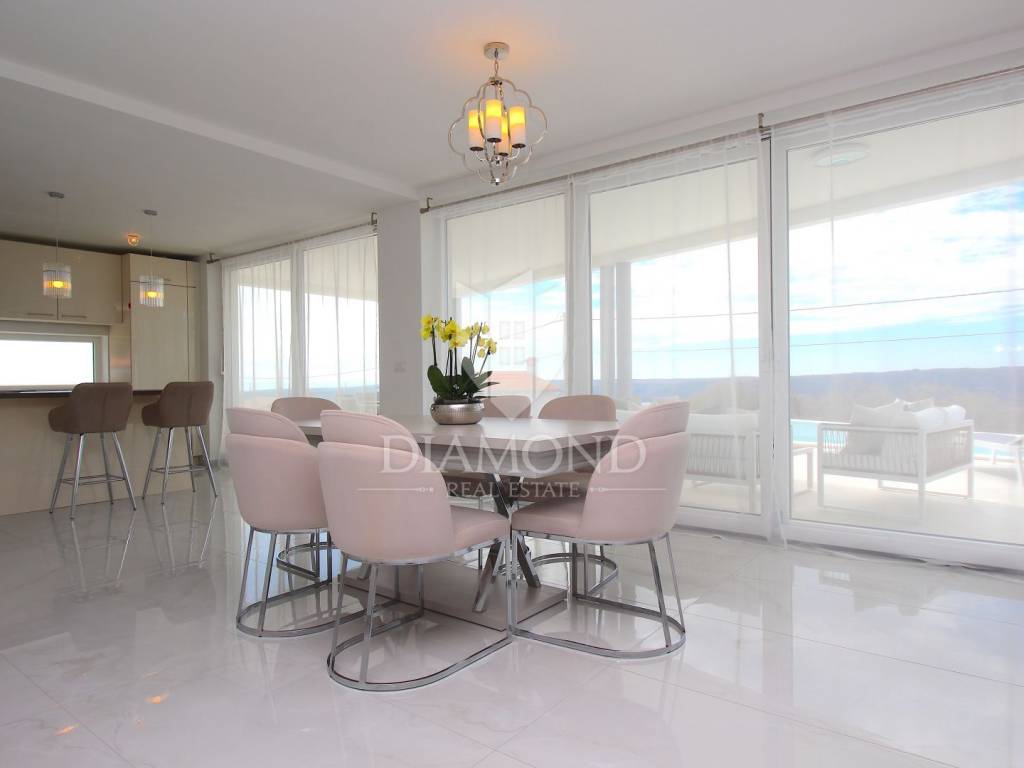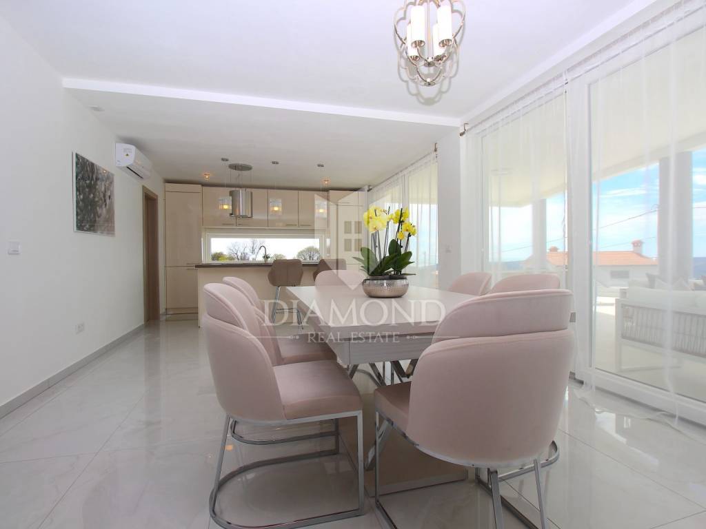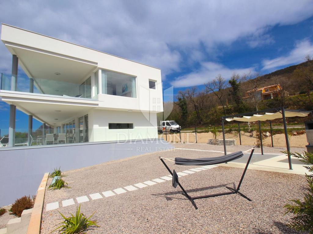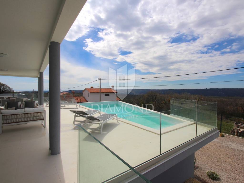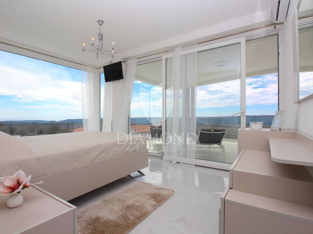 Labin, surroundings, luxury house of 223 m2. Not far from the historic town of Labin is this newly built house with a swimming pool and a large garden area of 1545 m2. The ground floor consists of a living room connected to the kitchen and dining room, a toilet and a storage room. The lower floor is built in the style of an open space where there is an exit to a spacious terrace with a swimming pool. The first floor consists of three bedrooms and each room has its own bathroom and access to the terrace. The issue of heating and cooling is solved by installed air conditioners in each room, and there is the possibility of heating with wood and pellets due to the built-in chimney. The property is positioned so that every room has a view of the sea and the surrounding area. It is surrounded by family houses and holiday homes. Due to its location, the house is an ideal investment for tourism or family life. All necessary facilities for life are in the immediate vicinity.