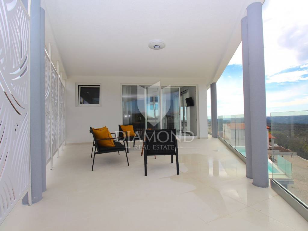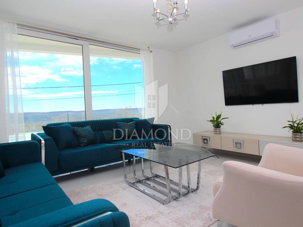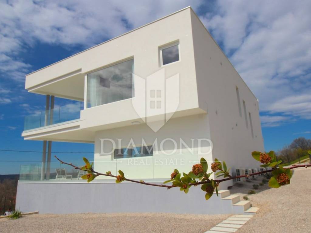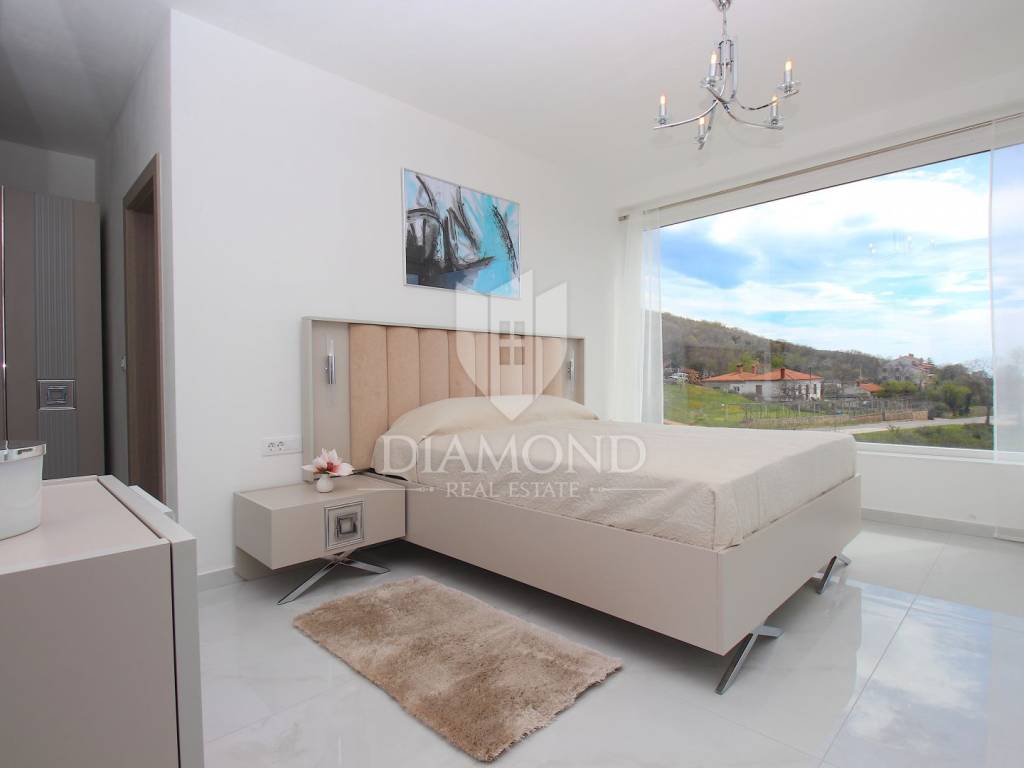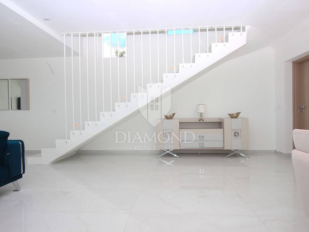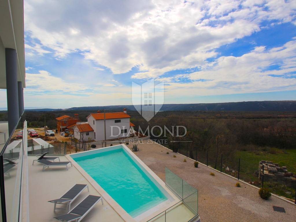 Labin, surroundings, luxury house of 223 m2. Not far from the historic town of Labin is this newly built house with a swimming pool and a large garden area of 1545 m2. The ground floor consists of a living room connected to the kitchen and dining room, a toilet and a storage room. The lower floor is built in the style of an open space where there is an exit to a spacious terrace with a swimming pool. The first floor consists of three bedrooms and each room has its own bathroom and access to the terrace. The issue of heating and cooling is solved by installed air conditioners in each room, and there is the possibility of heating with wood and pellets due to the built-in chimney. The property is positioned so that every room has a view of the sea and the surrounding area. It is surrounded by family houses and holiday homes. Due to its location, the house is an ideal investment for tourism or family life. All necessary facilities for life are in the immediate vicinity.