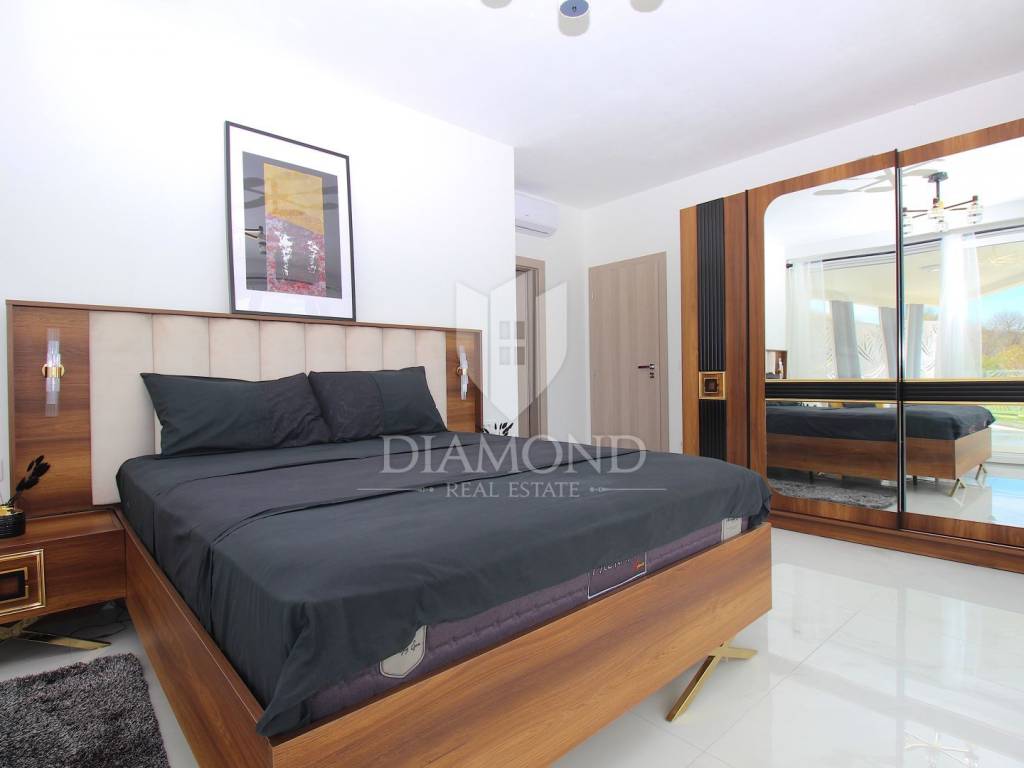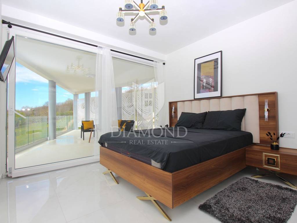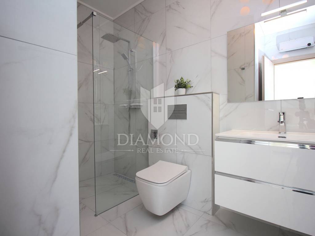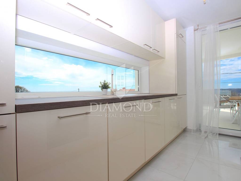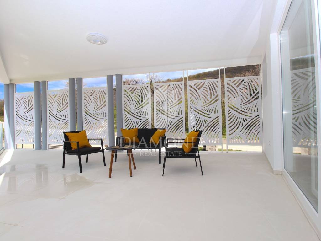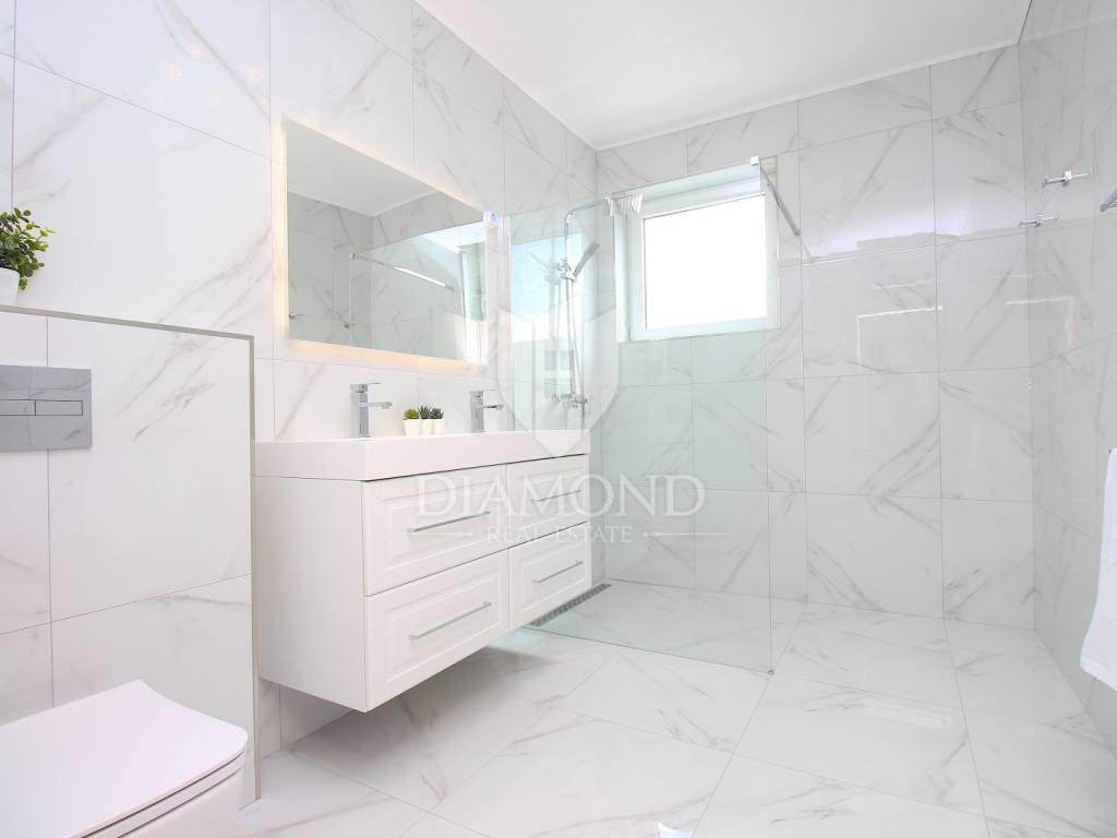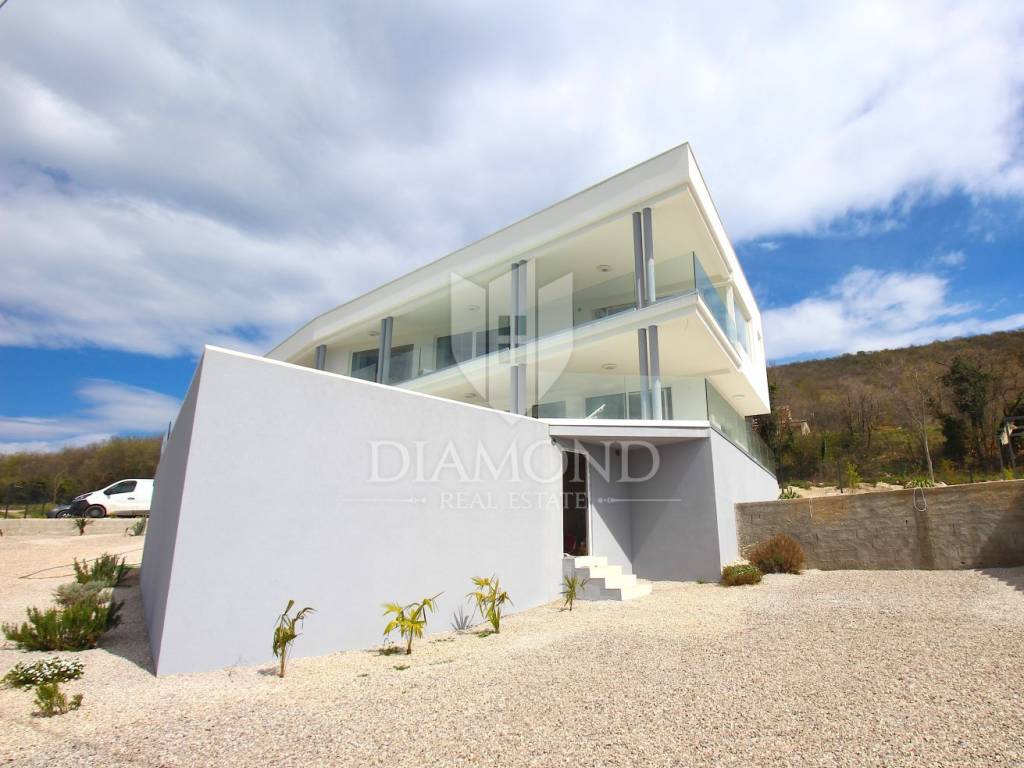 Labin, surroundings, luxury house of 223 m2. Not far from the historic town of Labin is this newly built house with a swimming pool and a large garden area of 1545 m2. The ground floor consists of a living room connected to the kitchen and dining room, a toilet and a storage room. The lower floor is built in the style of an open space where there is an exit to a spacious terrace with a swimming pool. The first floor consists of three bedrooms and each room has its own bathroom and access to the terrace. The issue of heating and cooling is solved by installed air conditioners in each room, and there is the possibility of heating with wood and pellets due to the built-in chimney. The property is positioned so that every room has a view of the sea and the surrounding area. It is surrounded by family houses and holiday homes. Due to its location, the house is an ideal investment for tourism or family life. All necessary facilities for life are in the immediate vicinity.