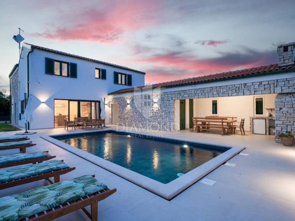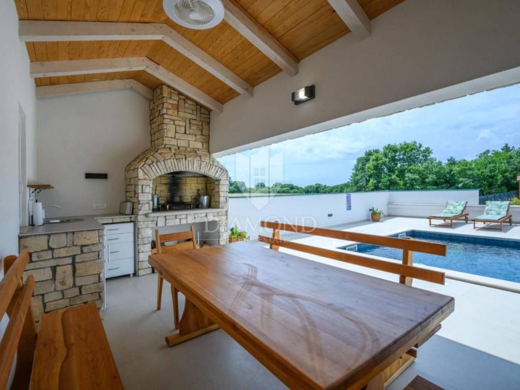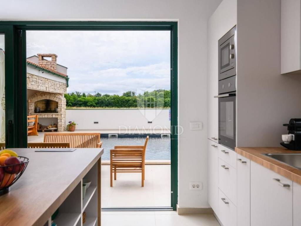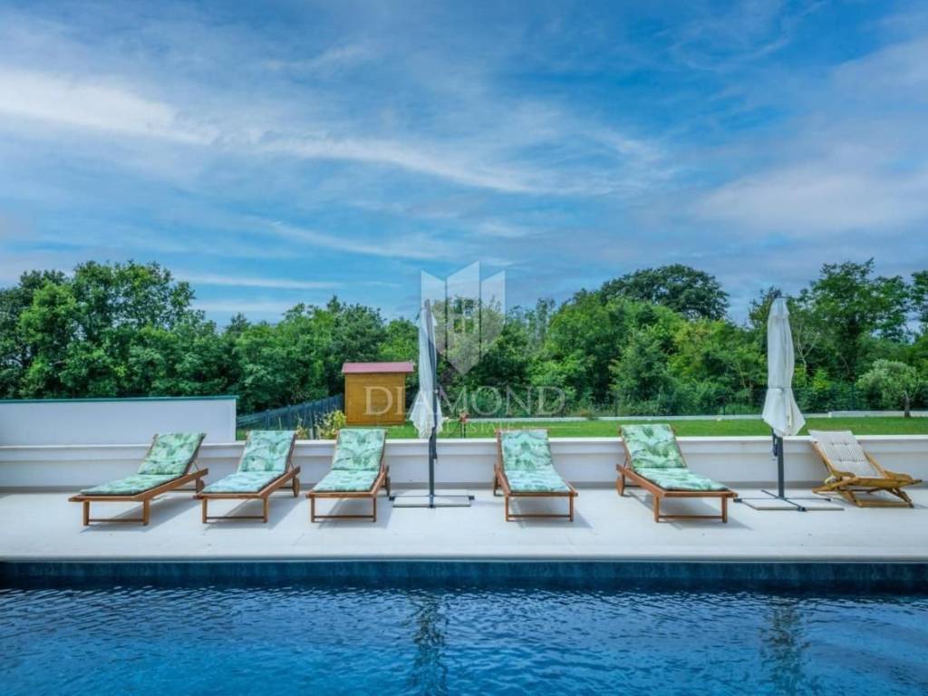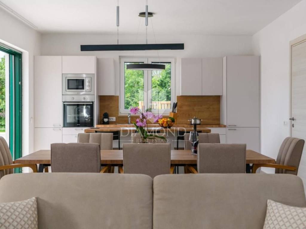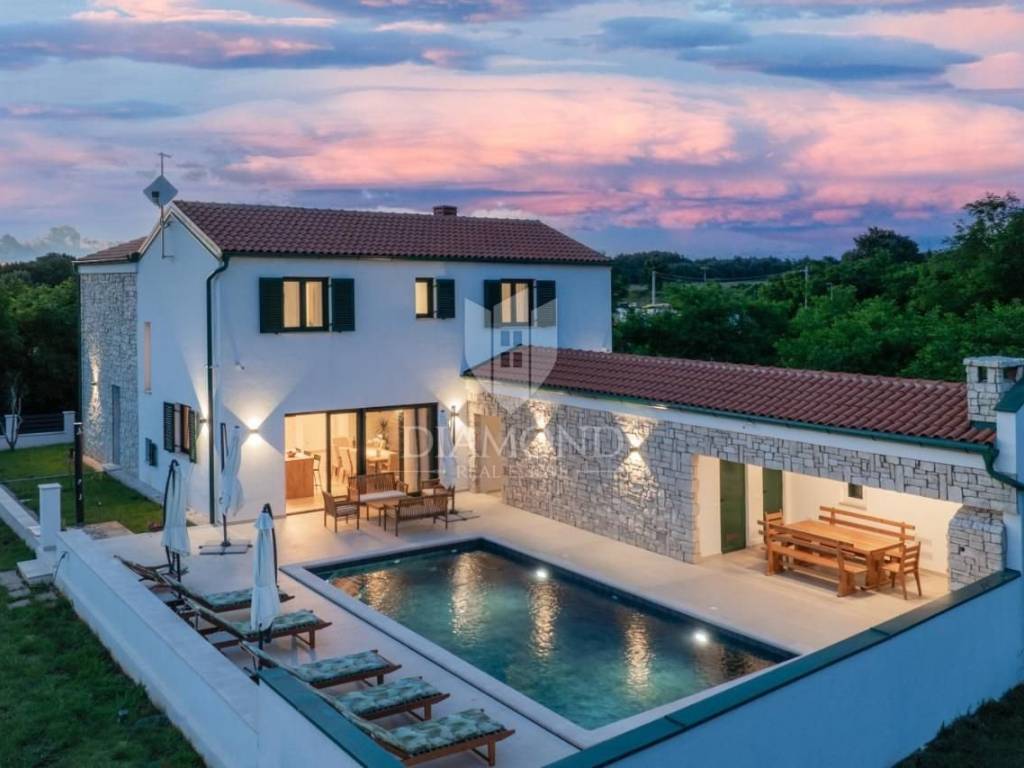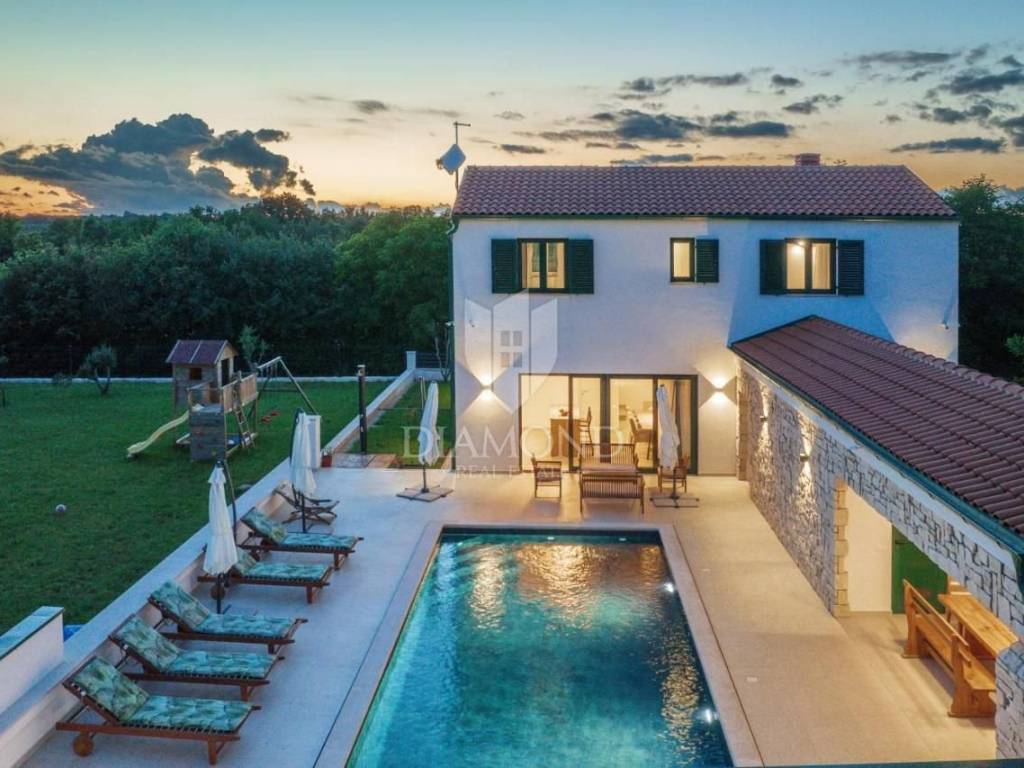 Marčana, surroundings, we are selling a newly built holiday house only 4 kilometers from the sea. This beautiful property of quality construction is designed as a two-story house with a total square footage of 286 m2. The first floor represents the night area and consists of three comfortable bedrooms, each of which has its own bathroom and an additional room that is used as a laundry room. The ground floor consists of an open space that combines a pleasant living room, a dining room and a fully equipped kitchen with a pantry. There is also one bathroom and a room that is used as a game room with social facilities. The living room is abundant with lots of natural light and the large glass walls blur the border between interior and exterior and represent a link to the outdoor area where there is a swimming pool with an arranged sunbathing area and a summer kitchen with an outdoor toilet and a covered dining area with a view of the pool and garden. The fully fenced garden area covers 1154 m2 and offers secured parking, beautiful green areas with a small children's playground, a spacious sunbathing area and a nice 32 m2 swimming pool. On the outer part, there is an auxiliary building where there is a summer kitchen, and where, in addition to the outdoor toilet, there is also the engine room of the swimming pool and another additional room in which there is an outdoor laundry room and a laundry room. The location of the house is also excellent, it is within walking distance to shops, restaurants and cafes, and the first beach is only a 5-minute drive away. The property is located in a quiet location at the entrance to a small tourist town on the east coast of Istria, where vacation homes and luxury villas predominate. It represents an excellent opportunity for investment in the tourist rental business where, due to the location, quality and contents of the house, the return of the invested money is guaranteed through the tourist rent.