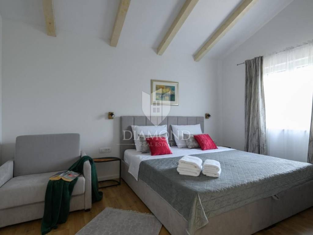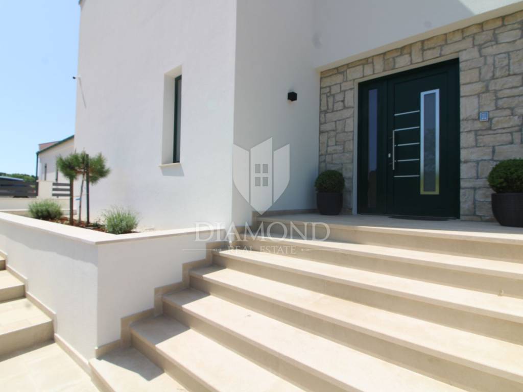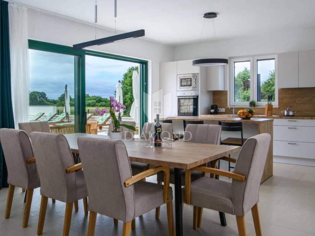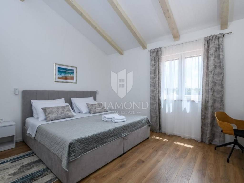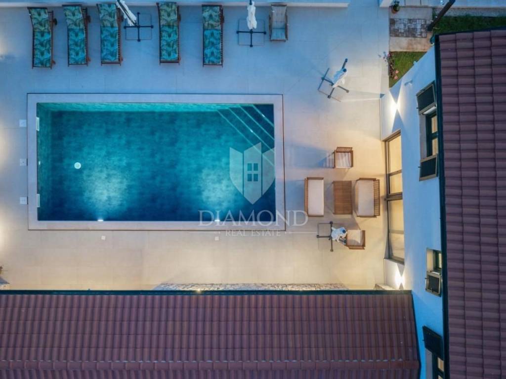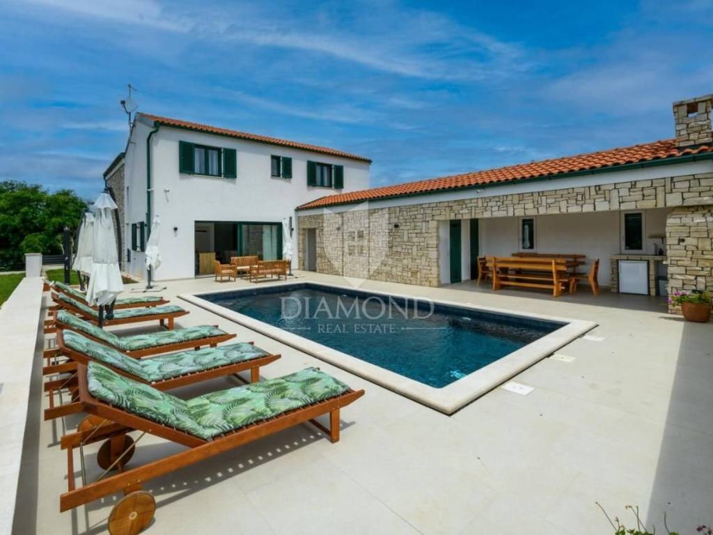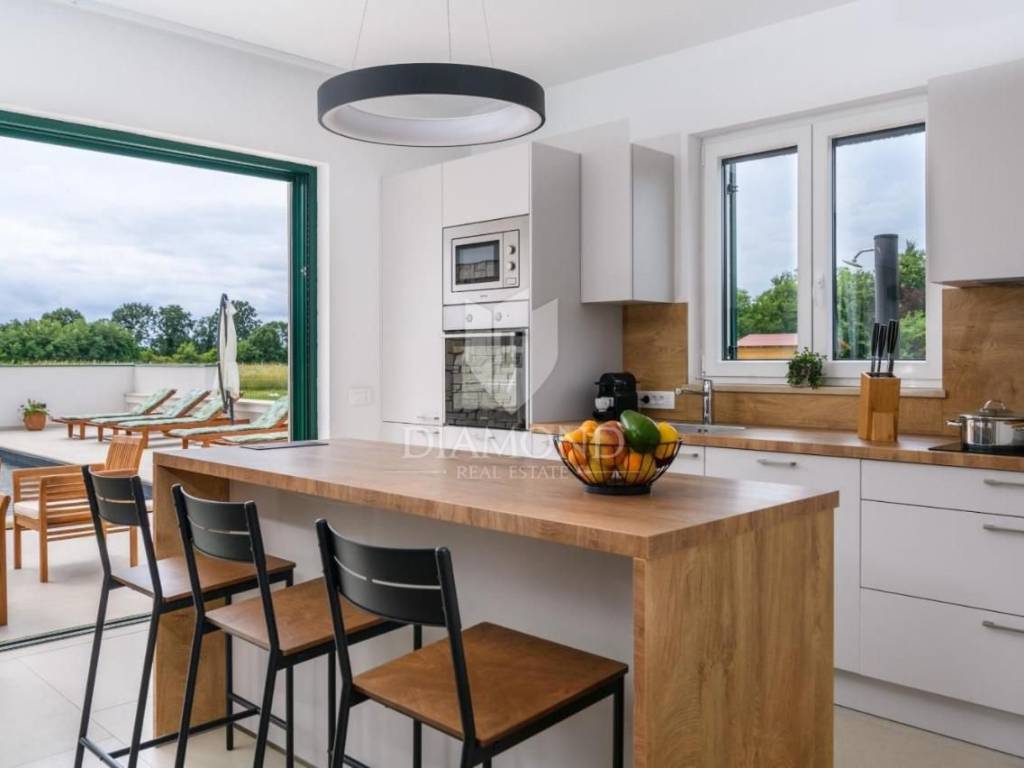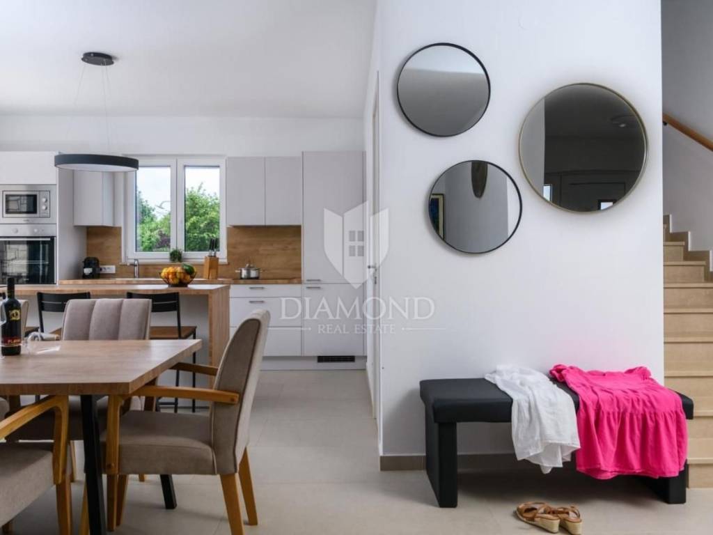 Marčana, surroundings, we are selling a newly built holiday house only 4 kilometers from the sea. This beautiful property of quality construction is designed as a two-story house with a total square footage of 286 m2. The first floor represents the night area and consists of three comfortable bedrooms, each of which has its own bathroom and an additional room that is used as a laundry room. The ground floor consists of an open space that combines a pleasant living room, a dining room and a fully equipped kitchen with a pantry. There is also one bathroom and a room that is used as a game room with social facilities. The living room is abundant with lots of natural light and the large glass walls blur the border between interior and exterior and represent a link to the outdoor area where there is a swimming pool with an arranged sunbathing area and a summer kitchen with an outdoor toilet and a covered dining area with a view of the pool and garden. The fully fenced garden area covers 1154 m2 and offers secured parking, beautiful green areas with a small children's playground, a spacious sunbathing area and a nice 32 m2 swimming pool. On the outer part, there is an auxiliary building where there is a summer kitchen, and where, in addition to the outdoor toilet, there is also the engine room of the swimming pool and another additional room in which there is an outdoor laundry room and a laundry room. The location of the house is also excellent, it is within walking distance to shops, restaurants and cafes, and the first beach is only a 5-minute drive away. The property is located in a quiet location at the entrance to a small tourist town on the east coast of Istria, where vacation homes and luxury villas predominate. It represents an excellent opportunity for investment in the tourist rental business where, due to the location, quality and contents of the house, the return of the invested money is guaranteed through the tourist rent.