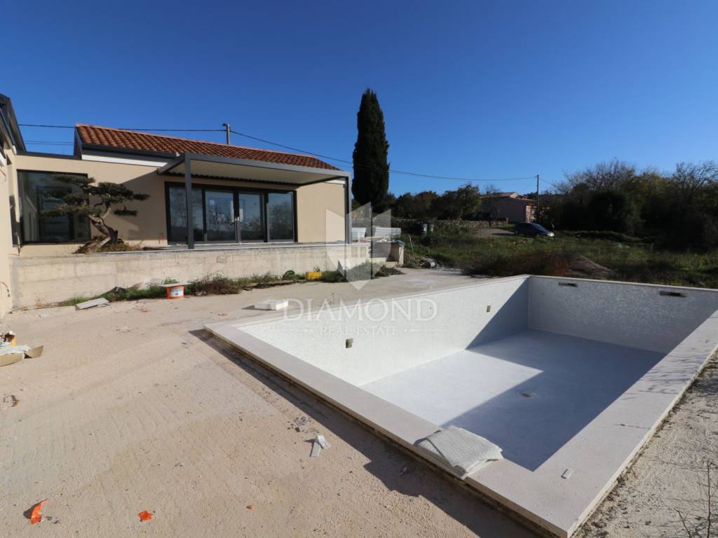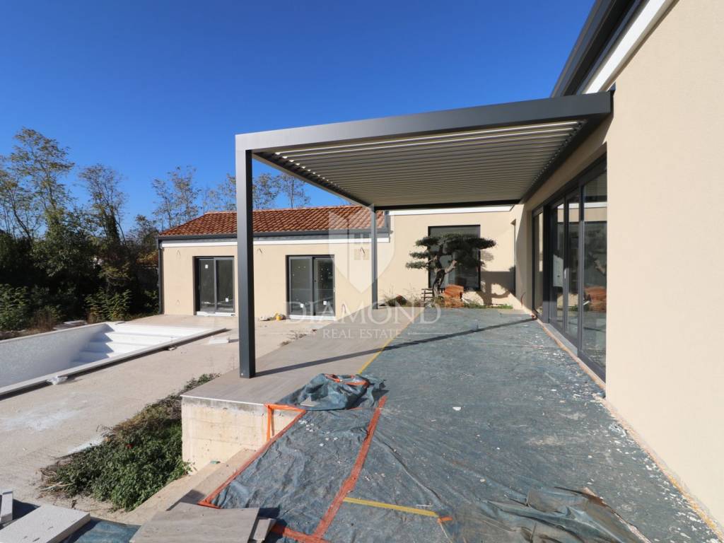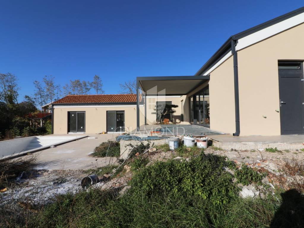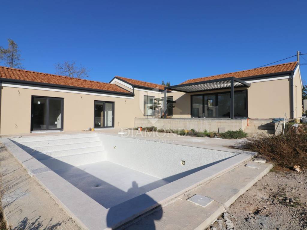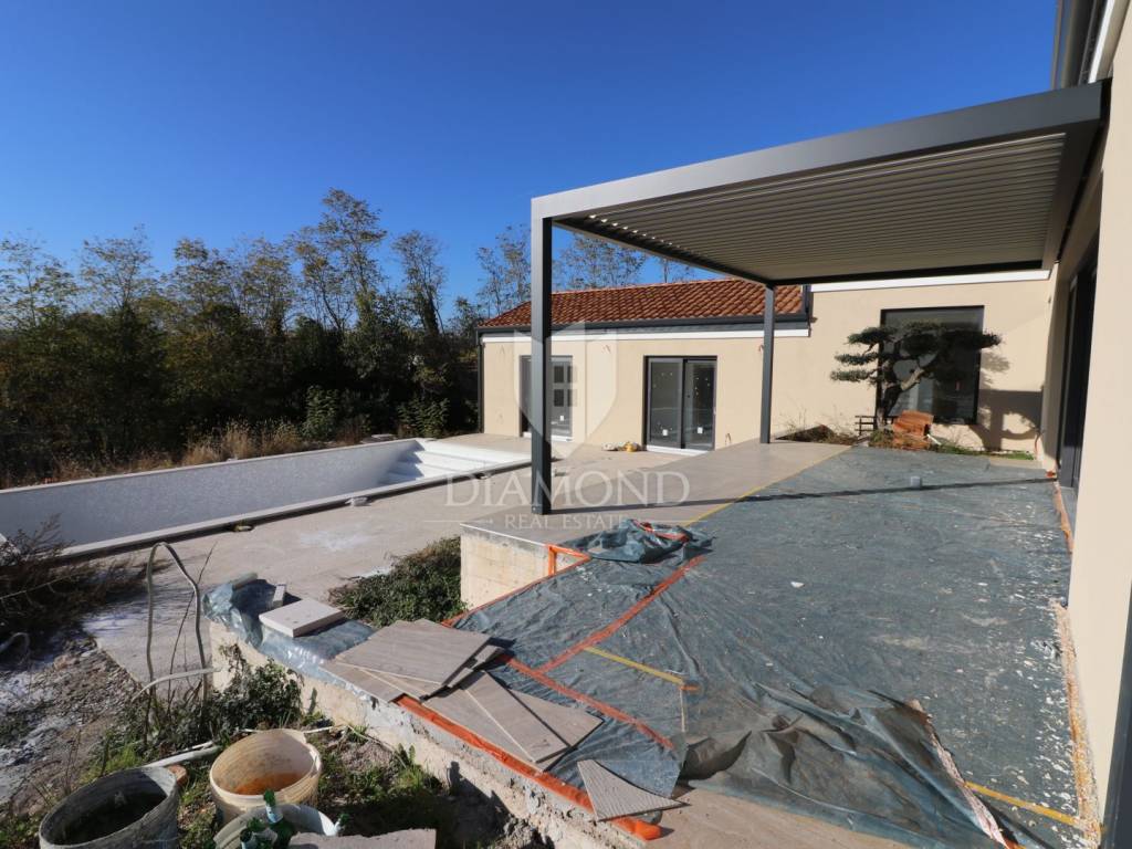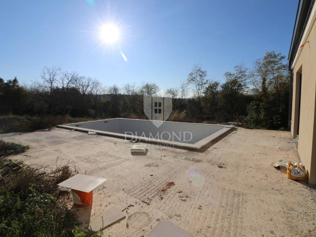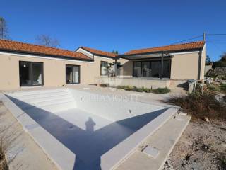 Labin, surroundings, we are selling an excellent new construction - a modern holiday house with a swimming pool in a quiet location. The modern one-story house has a total square footage of 182 m2 and consists of an open space living area that includes a kitchen, dining room and living room, a guest toilet, a storage room and three bedrooms with their own bathrooms. Within the house there is also a garage of 19 m2 and a machine room for pool equipment. The excellent layout of the property separates the living area from the night area and ensures a beautifully connected whole - each bedroom has access directly to the pool beach and the living area is connected by large glass walls to an outdoor covered terrace where there is a dining area with a view of the pool and landscaped garden. In terms of technology and heating and cooling systems, the installation of modern systems is planned - air-conditioned rooms via a heat pump, and preparations will be made for a photovoltaic power plant and solar panels for hot water. In the living room, there is also a built-in fireplace for additional atmosphere during the winter months. The fenced and horticulturally arranged garden with beautiful green areas and planted centuries-old olive trees further contributes to the feeling of well-being on this beautiful estate. The center of the property is decorated with a beautiful heated swimming pool of 50 m2 with an arranged sunbathing area. The house is currently under construction and the planned completion is in the spring of 2024. It is sold as a turnkey system or completely furnished and equipped, depending on the wishes of the future buyer, who at the current stage can adapt the property to a large extent to his own tastes, wishes and needs. The location of the property is very suitable for tourist rental - it is well connected by traffic and is located in a small settlement in a very quiet location. The house is surrounded by forest and untouched nature with only a few family houses. It is about 10 kilometers away from the city center, where all the necessary amenities are found, and the first store is even closer, only 2 kilometers away.