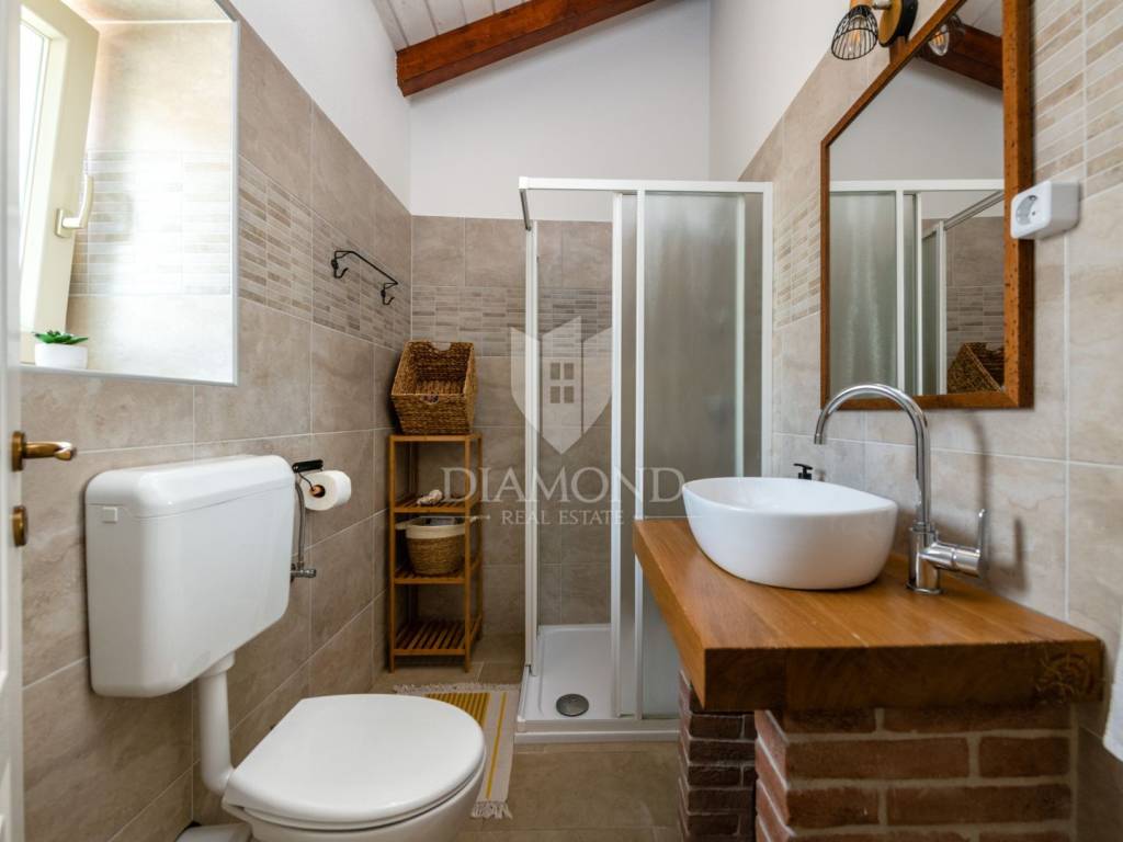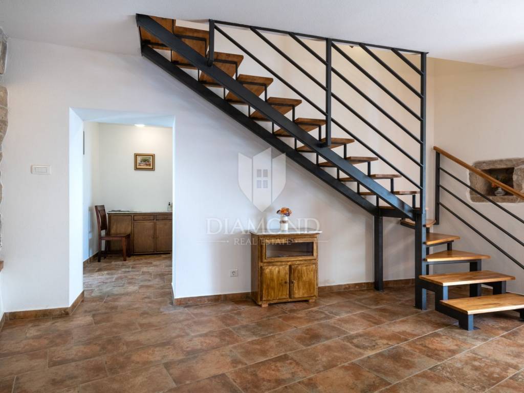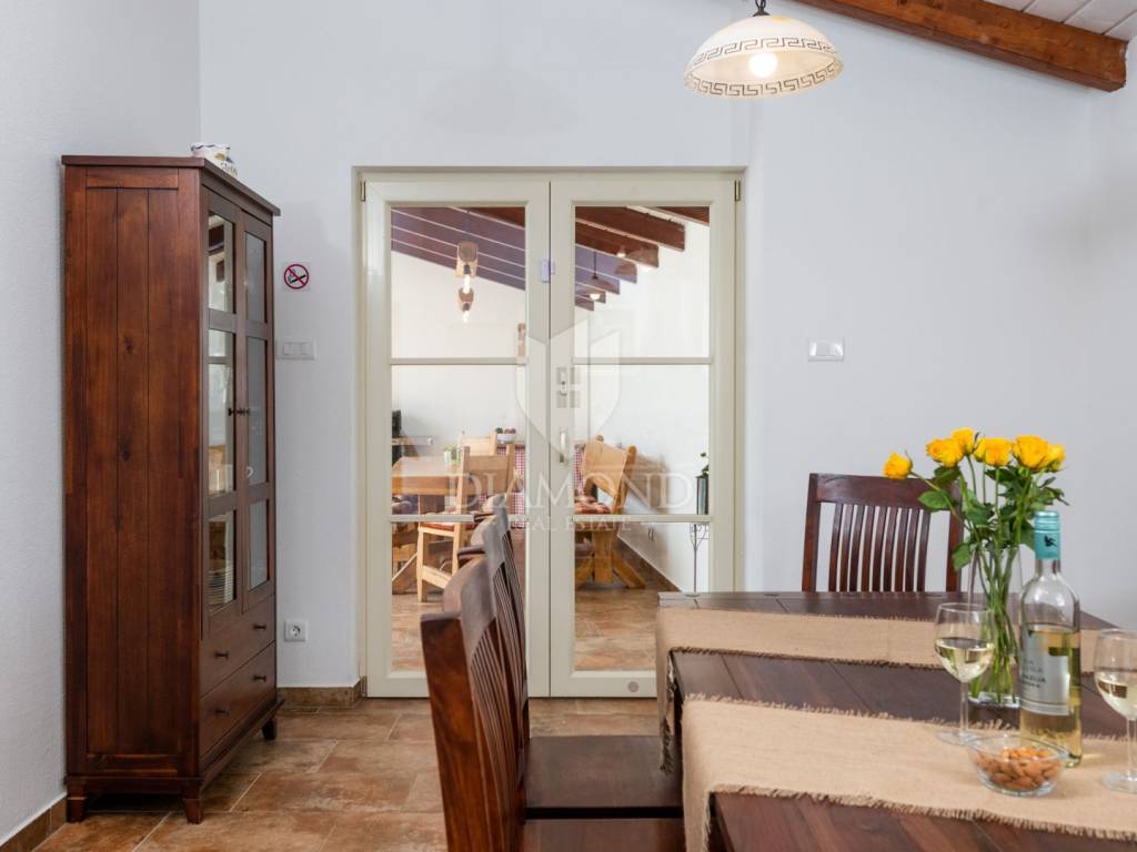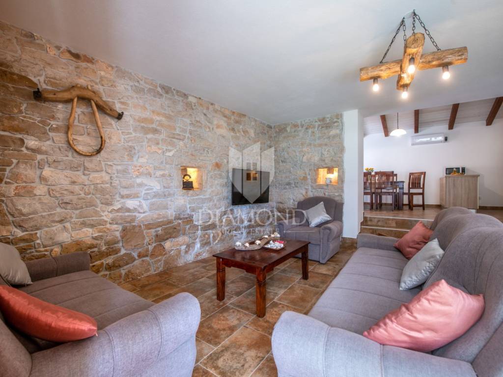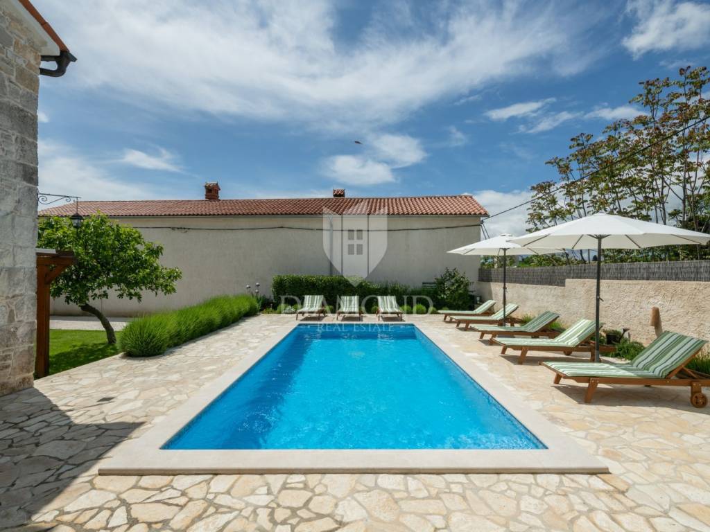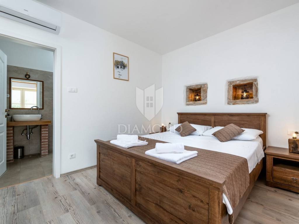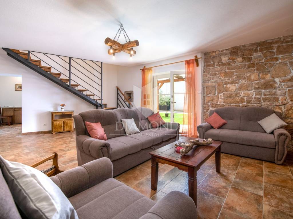 This magical Istrian-style stone house covers 149m2 and is located in a quiet place in the municipality of Krnica. Built on a plot of 530m2, this villa offers an ideal combination of traditional charm and modern comfort. On the ground floor there is a spacious living room with kitchen and dining room and one bedroom with its own bathroom. The living room opens onto a terrace that leads to a landscaped garden with a swimming pool, ideal for relaxing and socializing outdoors. Upstairs there are three additional bedrooms, providing plenty of space for the whole family or guests.