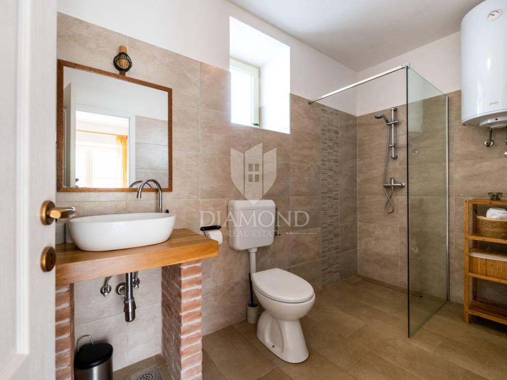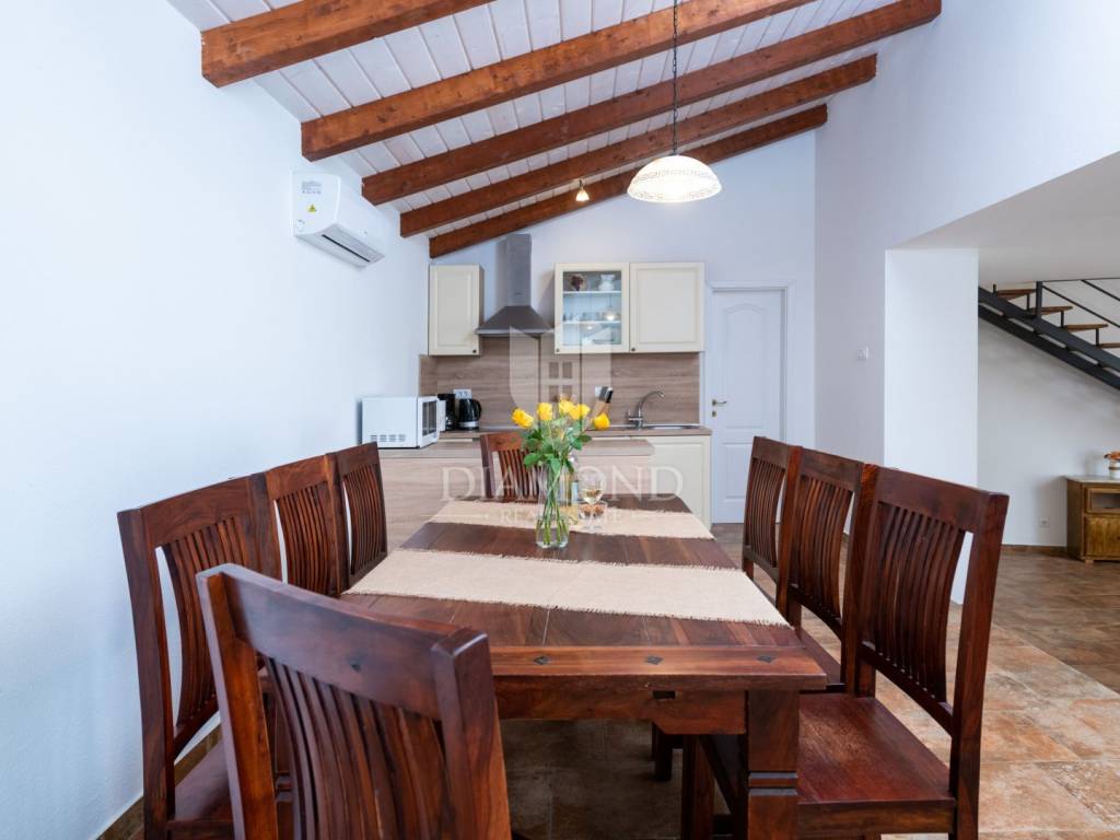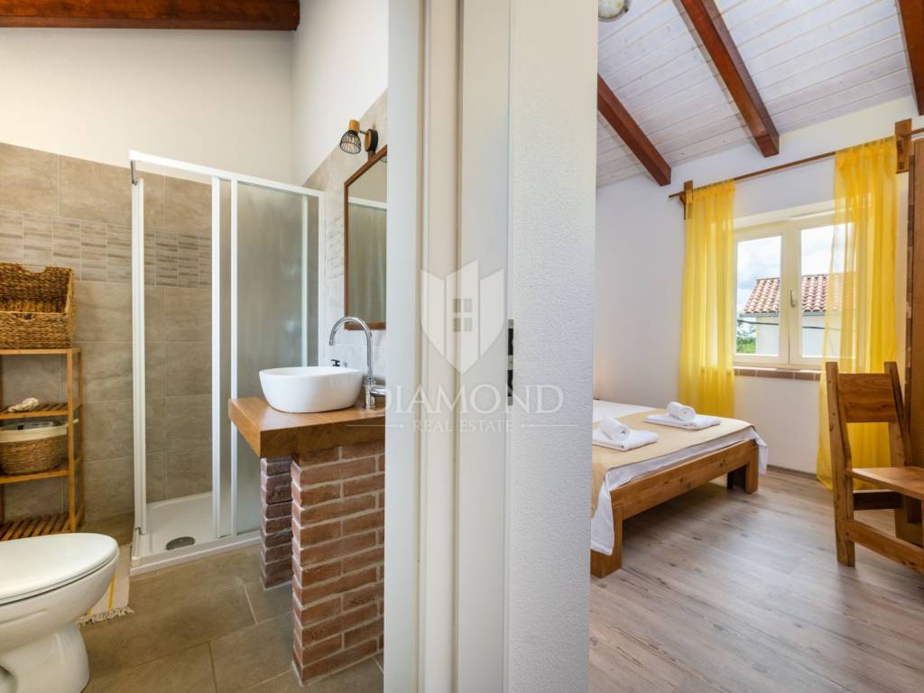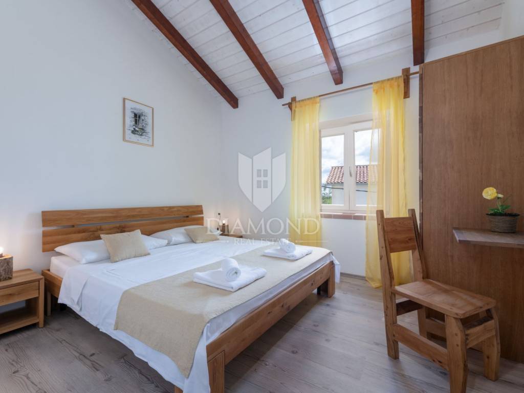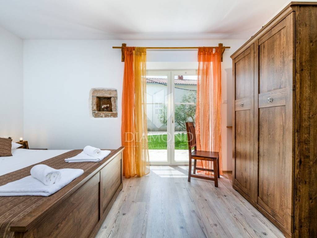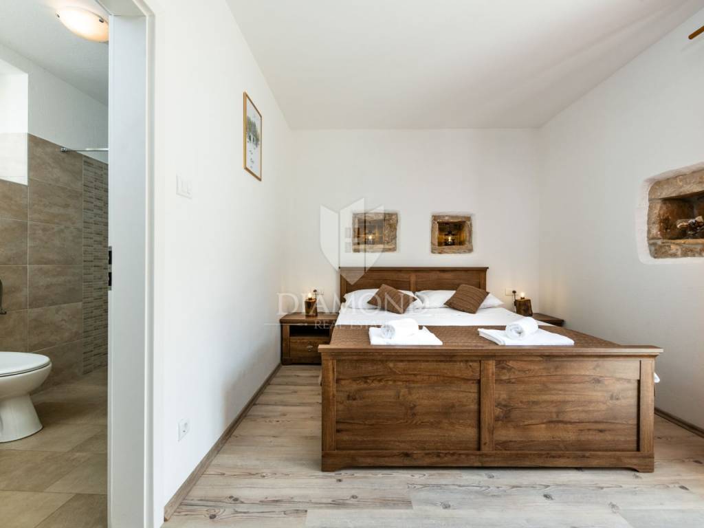 This magical Istrian-style stone house covers 149m2 and is located in a quiet place in the municipality of Krnica. Built on a plot of 530m2, this villa offers an ideal combination of traditional charm and modern comfort. On the ground floor there is a spacious living room with kitchen and dining room and one bedroom with its own bathroom. The living room opens onto a terrace that leads to a landscaped garden with a swimming pool, ideal for relaxing and socializing outdoors. Upstairs there are three additional bedrooms, providing plenty of space for the whole family or guests.