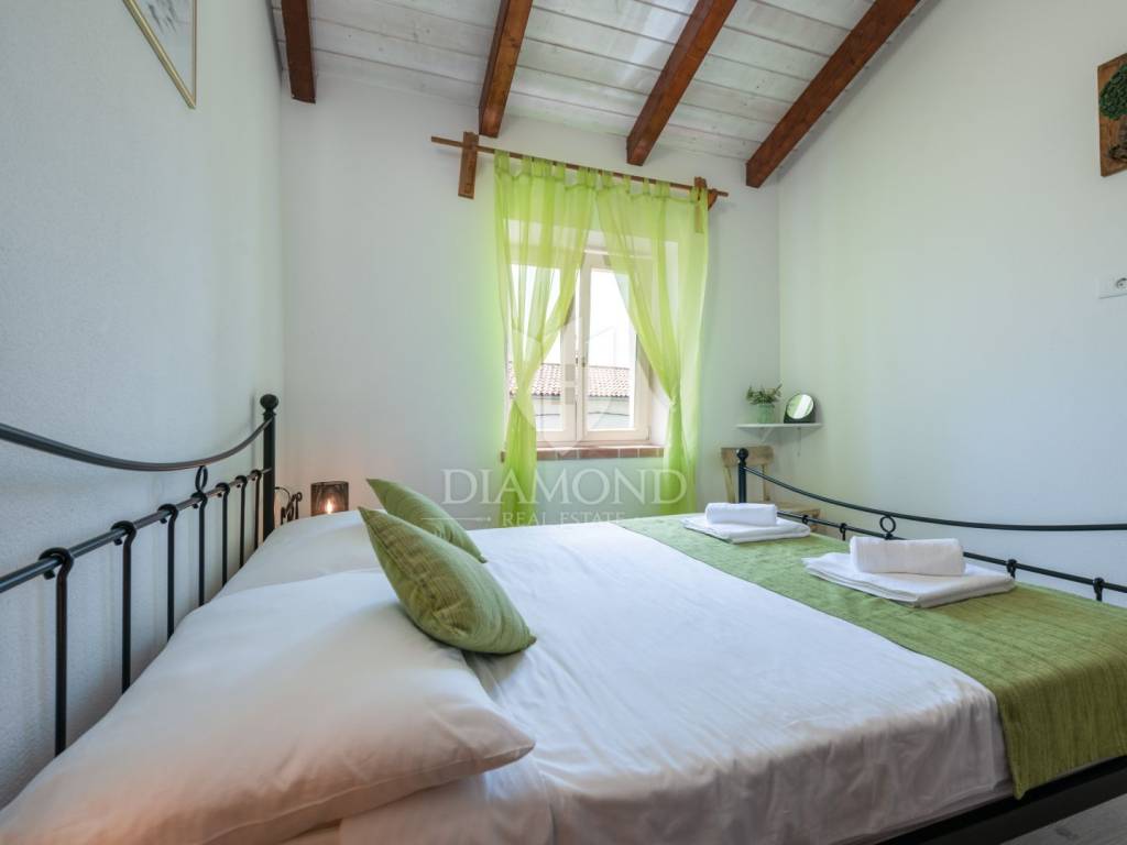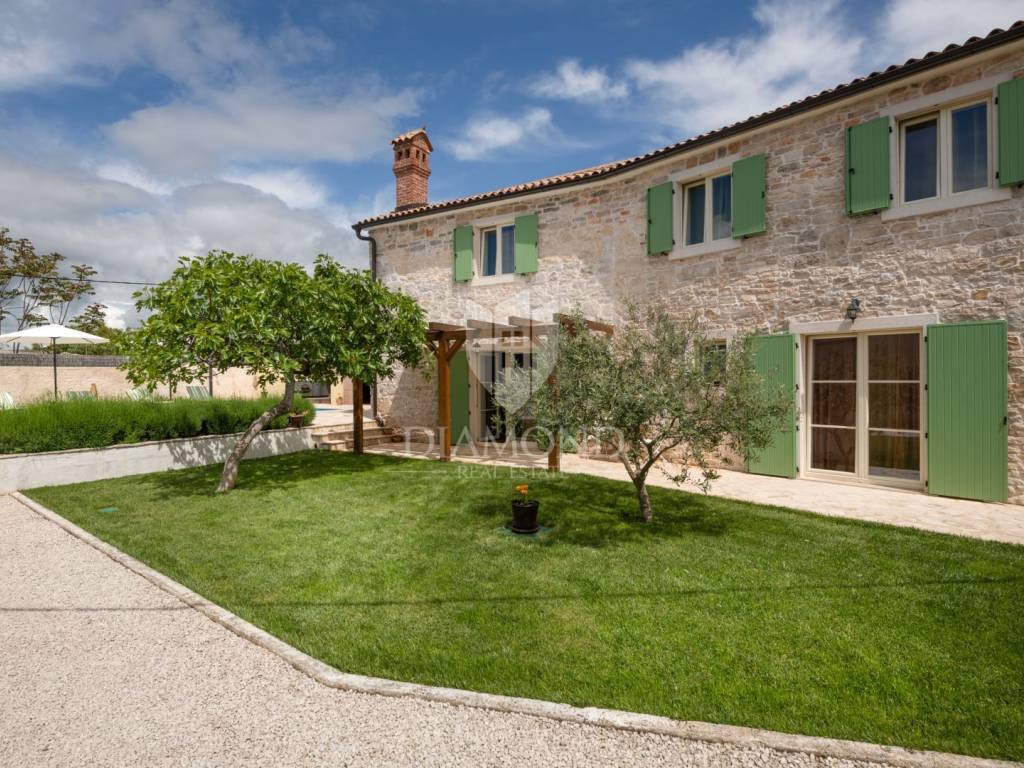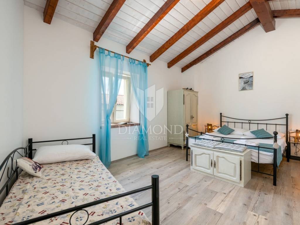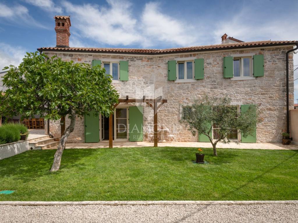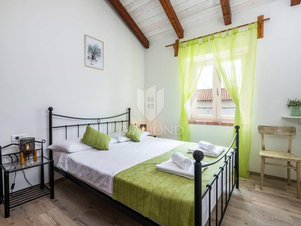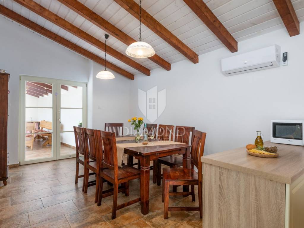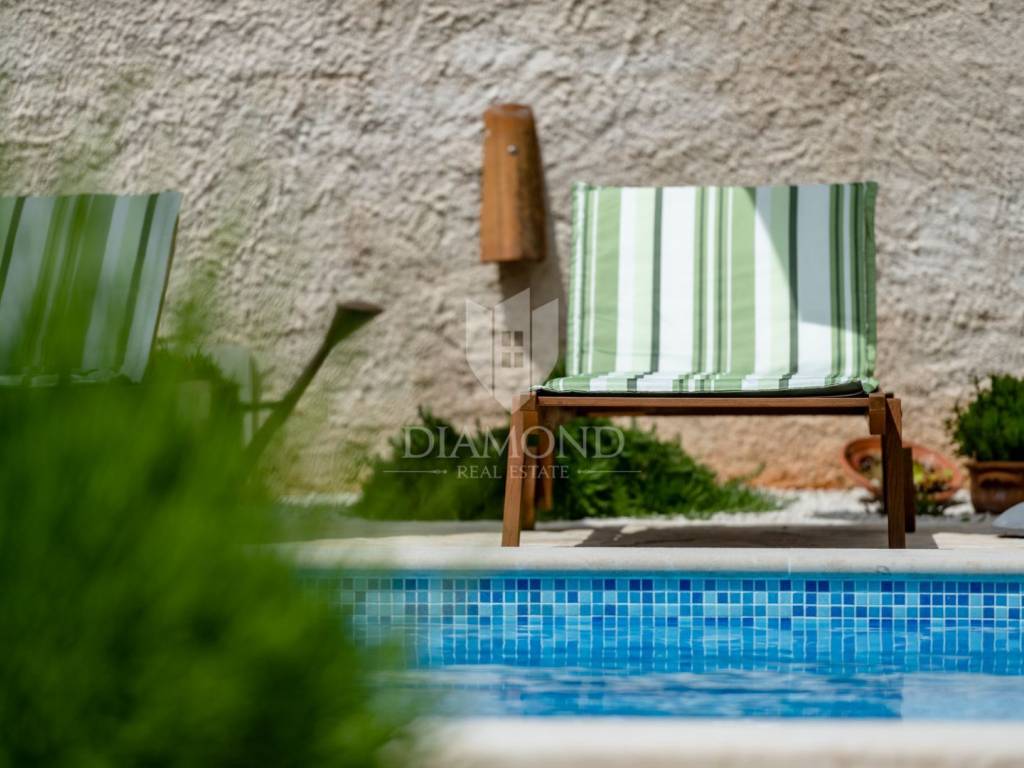This magical Istrian-style stone house covers 149m2 and is located in a quiet place in the municipality of Krnica. Built on a plot of 530m2, this villa offers an ideal combination of traditional charm and modern comfort. On the ground floor there is a spacious living room with kitchen and dining room and one bedroom with its own bathroom. The living room opens onto a terrace that leads to a landscaped garden with a swimming pool, ideal for relaxing and socializing outdoors. Upstairs there are three additional bedrooms, providing plenty of space for the whole family or guests.
