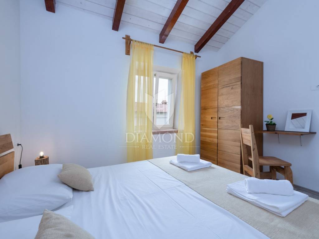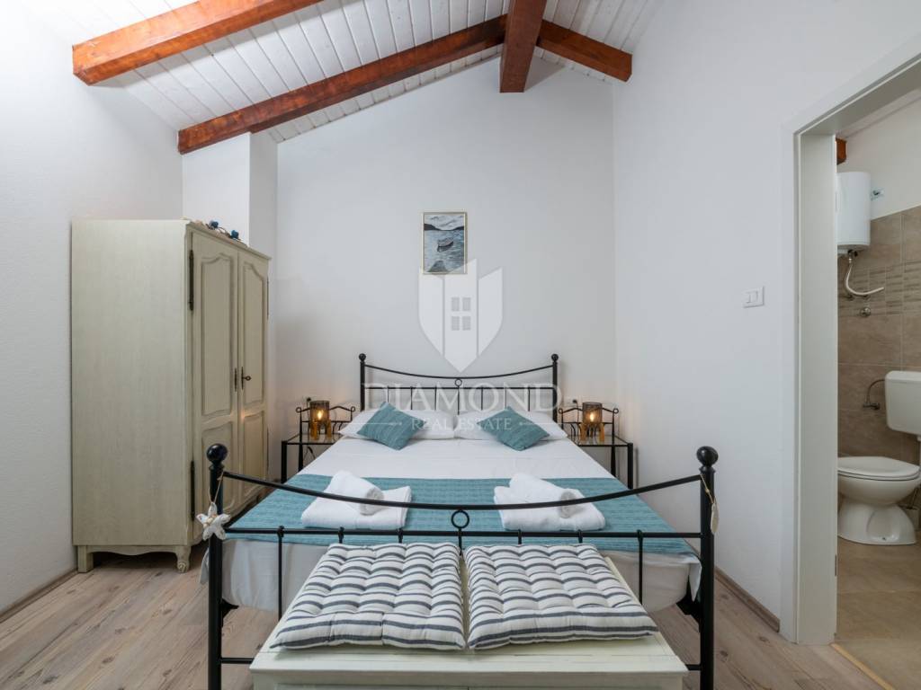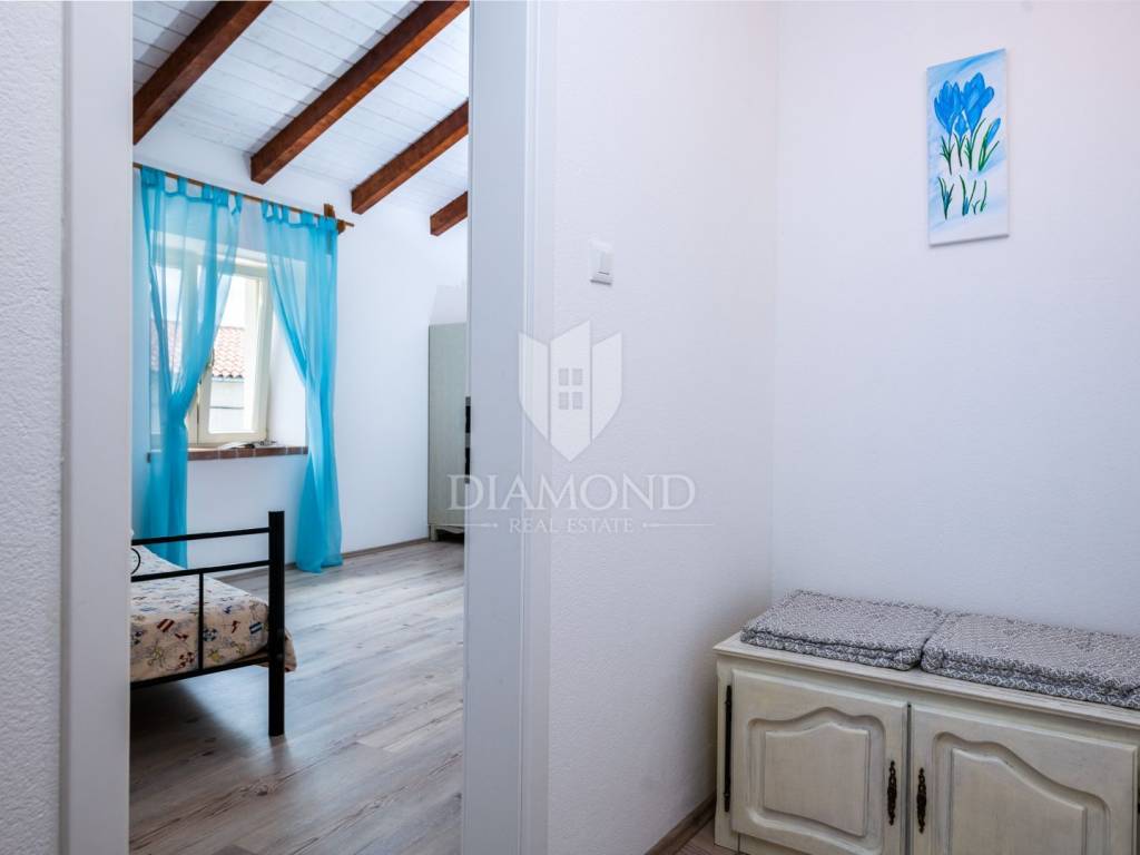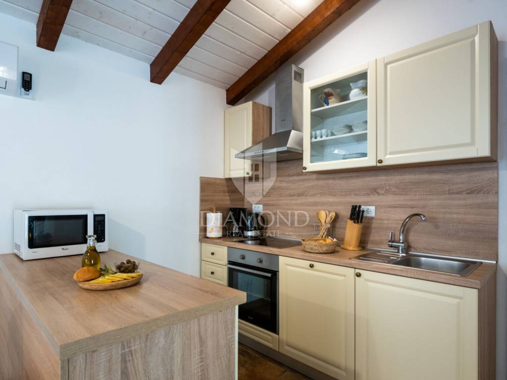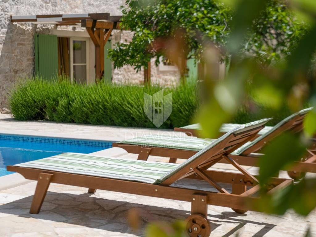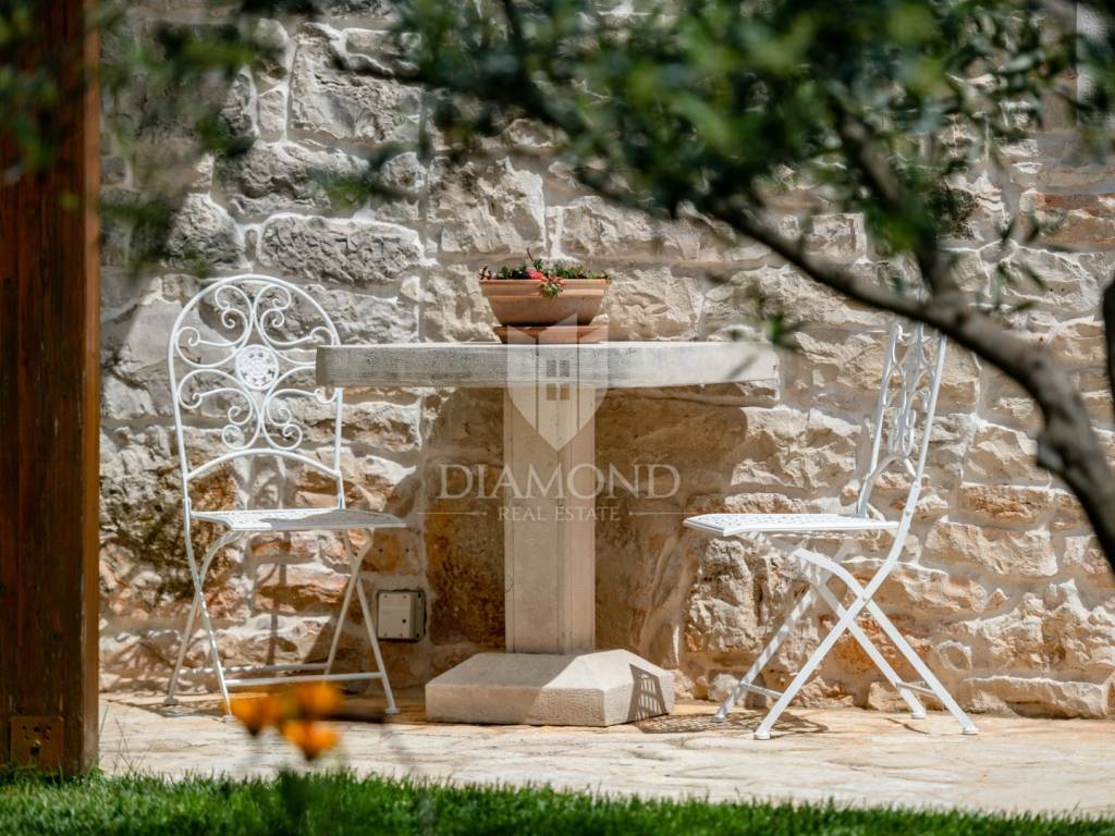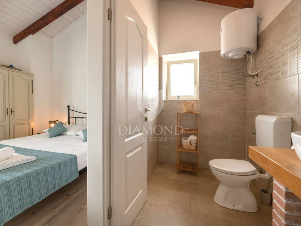 This magical Istrian-style stone house covers 149m2 and is located in a quiet place in the municipality of Krnica. Built on a plot of 530m2, this villa offers an ideal combination of traditional charm and modern comfort. On the ground floor there is a spacious living room with kitchen and dining room and one bedroom with its own bathroom. The living room opens onto a terrace that leads to a landscaped garden with a swimming pool, ideal for relaxing and socializing outdoors. Upstairs there are three additional bedrooms, providing plenty of space for the whole family or guests.