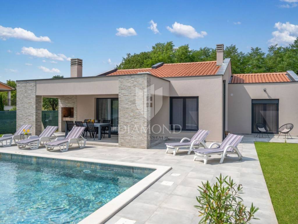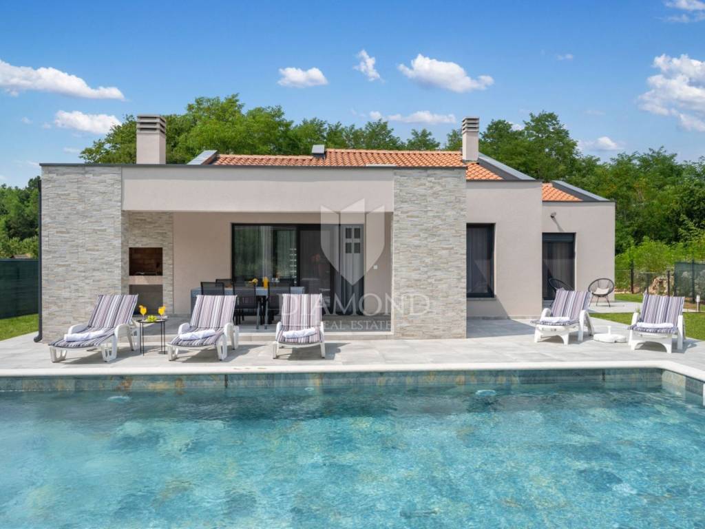 New modern single-storey house with swimming pool for sale, located in a quiet area near Labin, Istria. This holiday home offers the perfect balance between privacy and proximity to all city amenities. The house is surrounded by lush green nature, providing a relaxing ambience and a beautiful view.