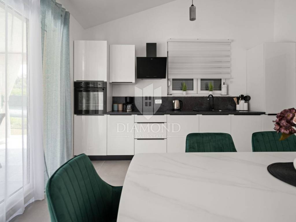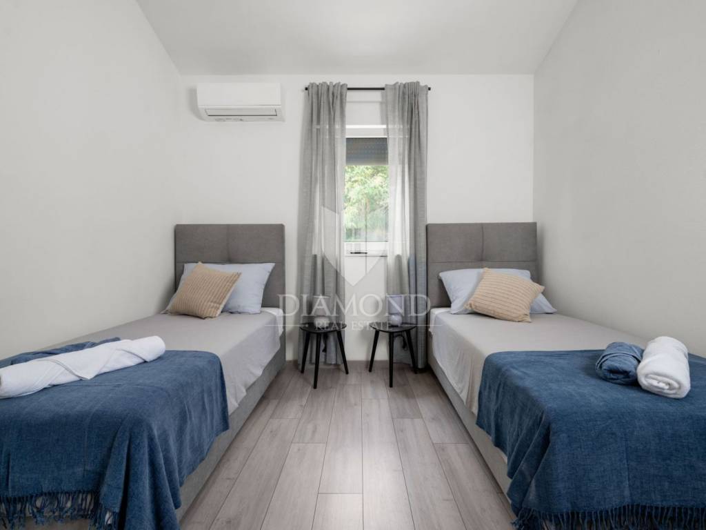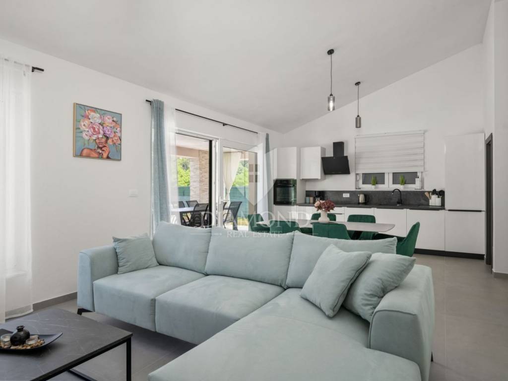 Built on a plot of 1039 m2, the house covers 130 m2 and consists of three bedrooms, each with its own bathroom, and a spacious living room with kitchen and dining room. The living room and the kitchen open onto a spacious covered terrace, ideal for enjoying outdoor meals and relaxing. A large swimming pool with an arranged sunbathing area and barbecue is located in the center of the garden, perfect for summer relaxation and fun. The house is fully air-conditioned, equipped with a modern heating and cooling system (split system), and fully furnished and ready for use.