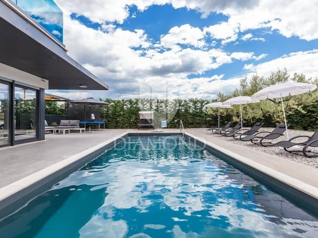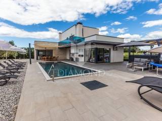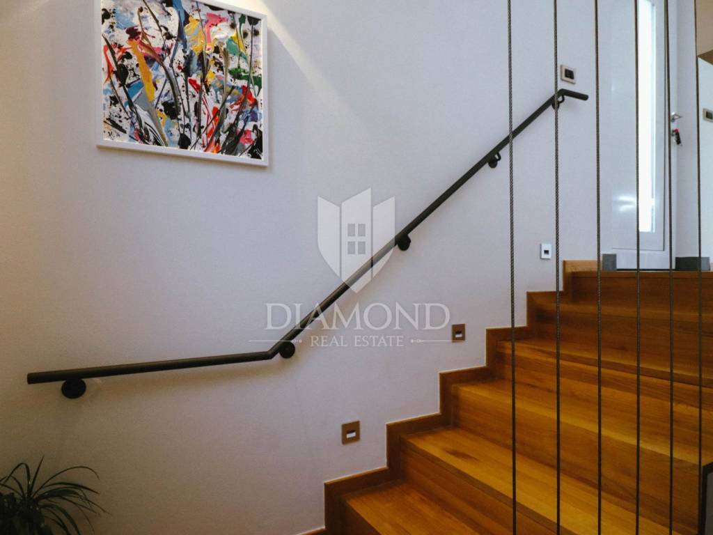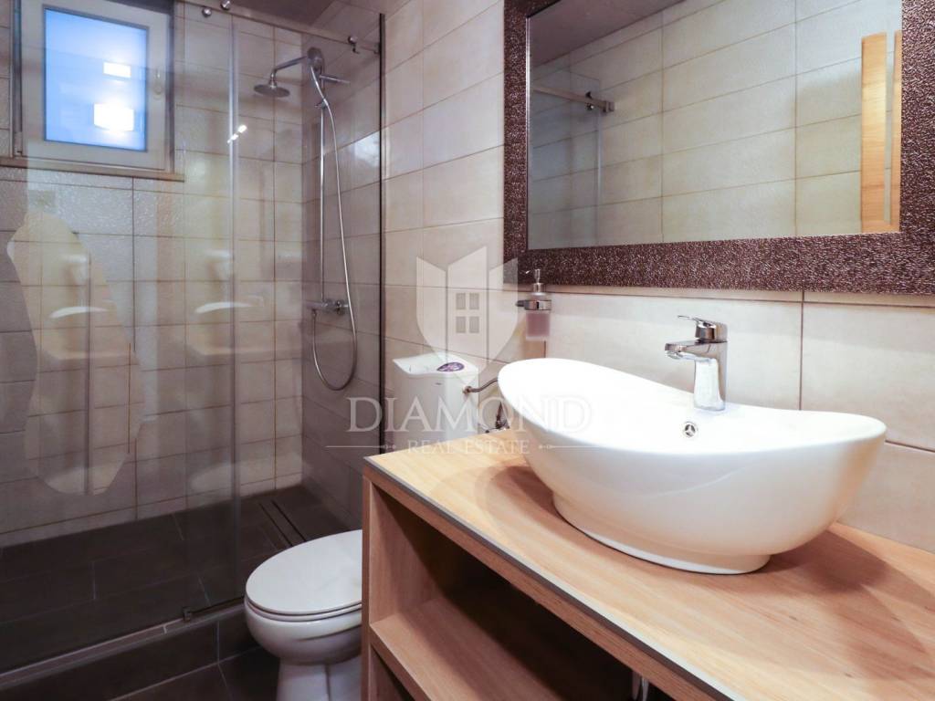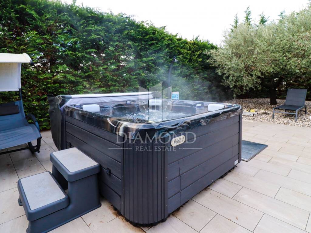A house with a swimming pool in a desirable location is for sale. The property is located in a quiet location and is only 9 km from the sea and the city center. On the ground floor there is a spacious living room, dining room, kitchen, two bedrooms and two bathrooms. On the first floor, there are two more bedrooms and a bathroom, one of which has access to a terrace with a view of the sea. The house is heated by an air conditioner and a fireplace in the living room. Due to the quality of construction and good insulation, the house has a pleasant feeling of the warmth of home. The whole house is equipped with the first stage of central heating. In the basement of the house there is a small storage room, a bathroom, a spacious tavern with a fireplace, a gym and a sauna. Within the fenced yard of 700 m2 there is a swimming pool with a paved beach, a jacuzzi, an outdoor kitchen with a fireplace and 2 covered parking spaces. There are olive trees and Mediterranean plants around the house.