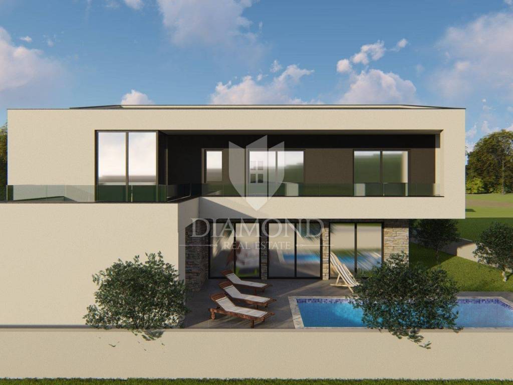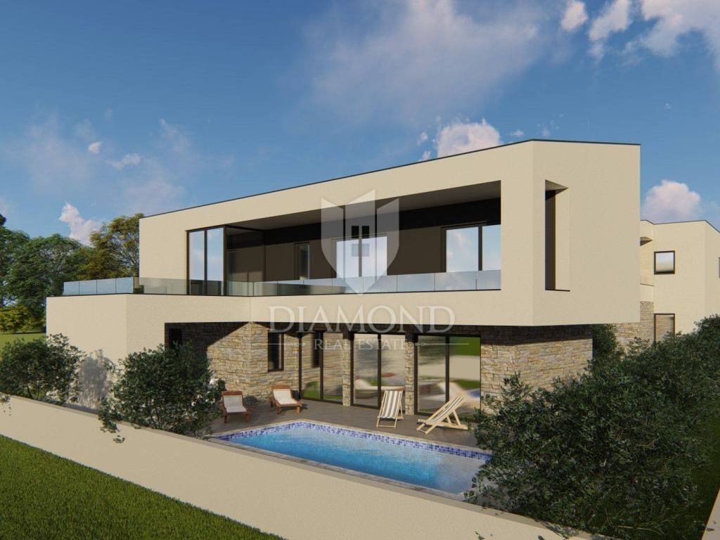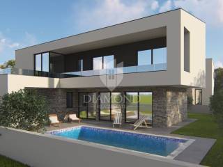 In a quiet neighborhood near Marčana, there is a luxury house with a modern design. The house is located at the end of the village in nature, surrounded by greenery and peace. The beautiful garden has two parking spaces and a swimming pool.