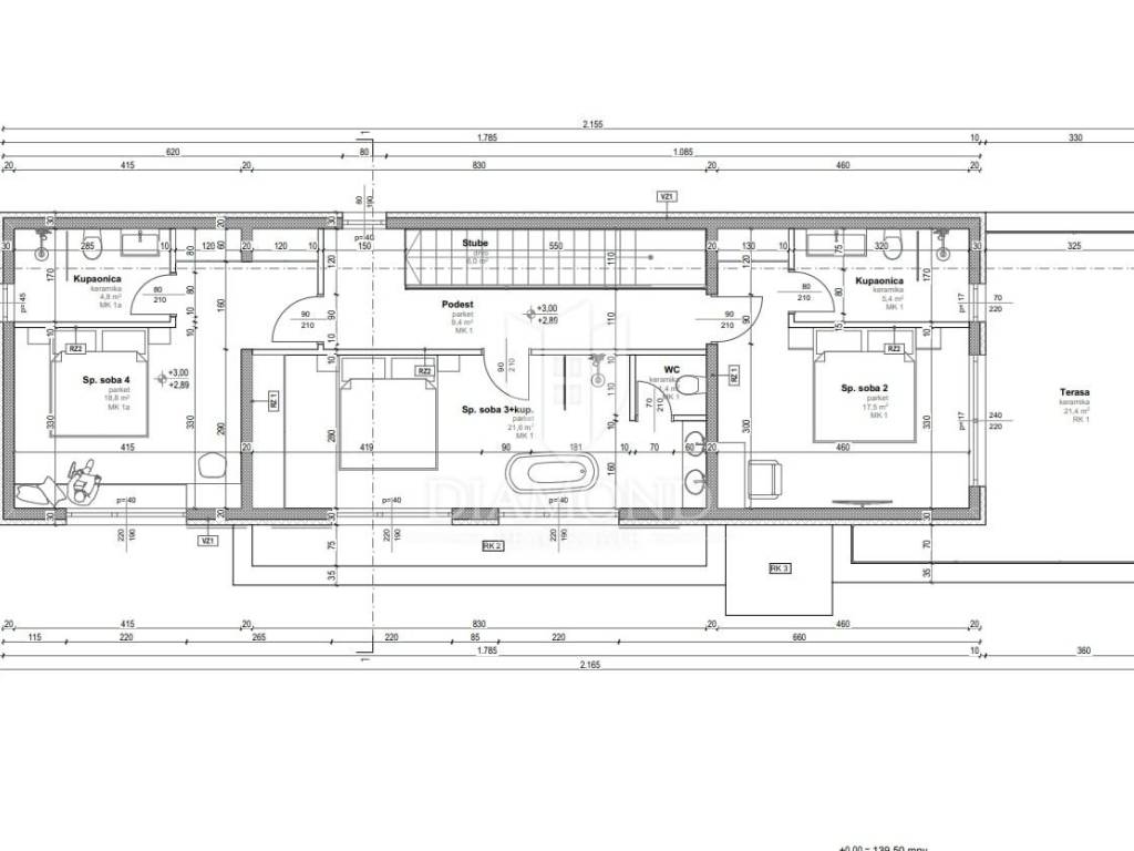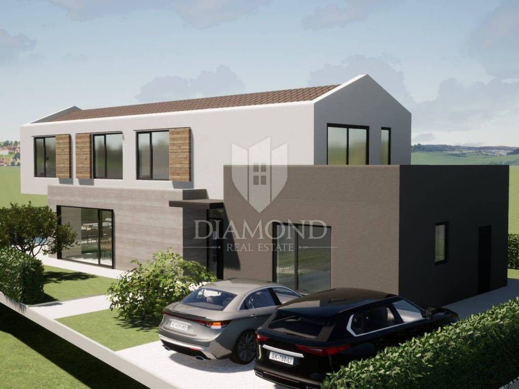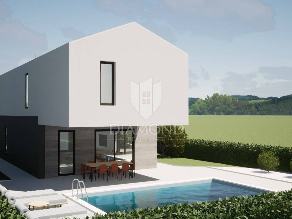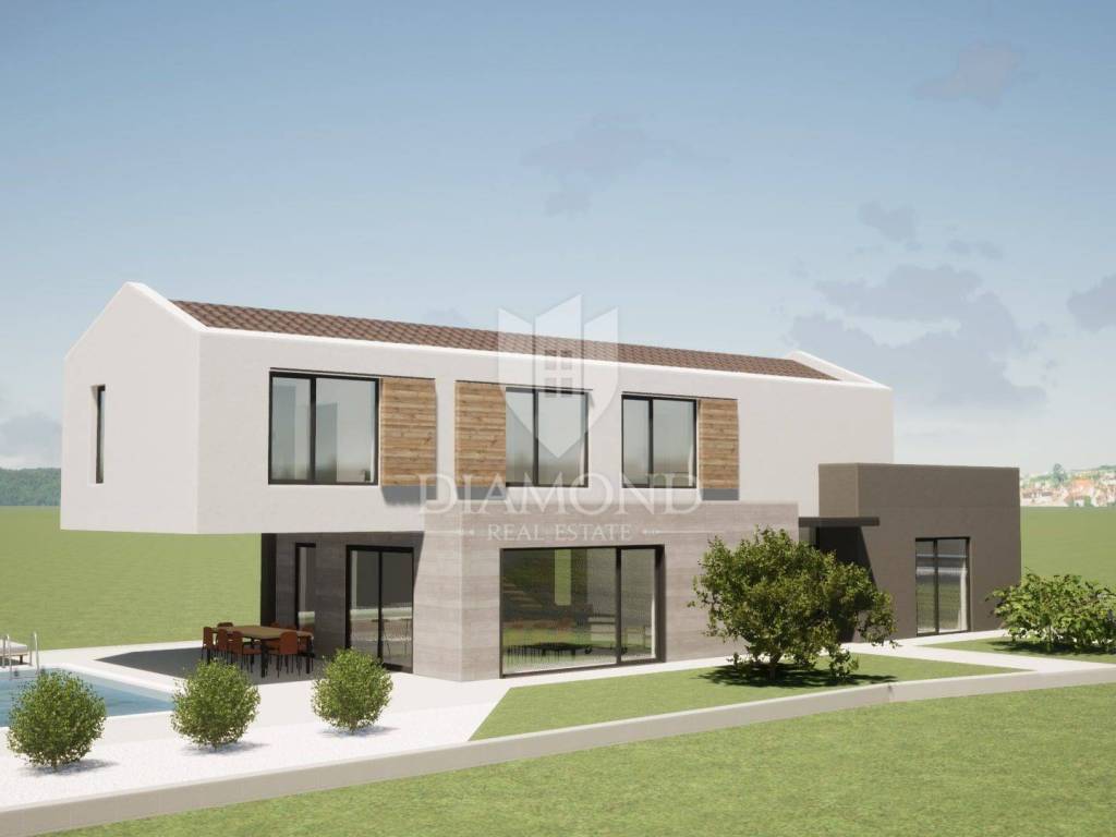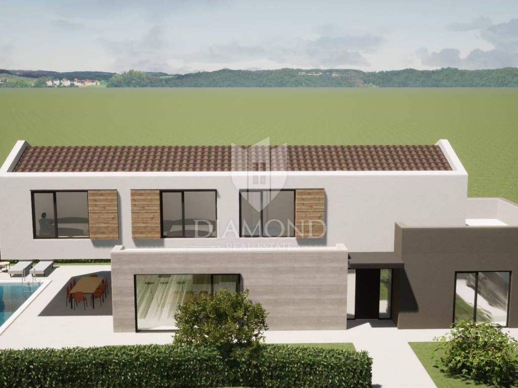 This attractive villa with a modern design will be located in a quiet Istrian place only 15 km from the city of Poreč. The villa is spread over two floors, and on the ground floor of the villa there will be a spacious living room, which is connected to the kitchen and dining room according to the open space concept, a toilet, a bedroom with a bathroom, a technical room. Large glass walls have been installed throughout the living room and dining room, which allow a large influx of sunlight, which gives the space itself a large source of light. An elegant staircase leads to the first floor of this beautiful villa, where there are three comfortable bedrooms, each with its own modernly equipped bathroom and a terrace with a view of the pool and nature that surrounds the villa. The total size of the villa is 231.70 m2. From the living room and the dining room you can go directly to the covered terrace where there is a swimming pool that offers a view of greenery, peace and quiet. The heating of the villa on both floors will be made possible by floor heating on a heat pump and air conditioners in each room. The garden in front of the villa will be planted and decorated with Mediterranean plants, and the central place in the garden is occupied by a large swimming pool with a sunbathing area that allows complete enjoyment on hot summer days. All necessary facilities for life, such as a school, kindergarten, post office, shop, restaurants, nature park and bicycle paths are located near the town itself. The planned completion of construction is winter 2024.
