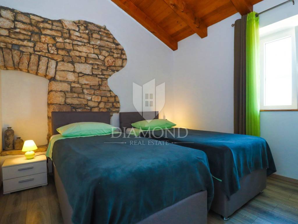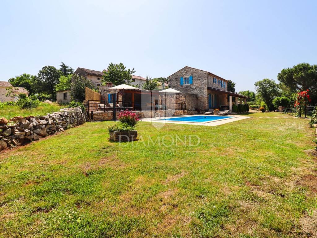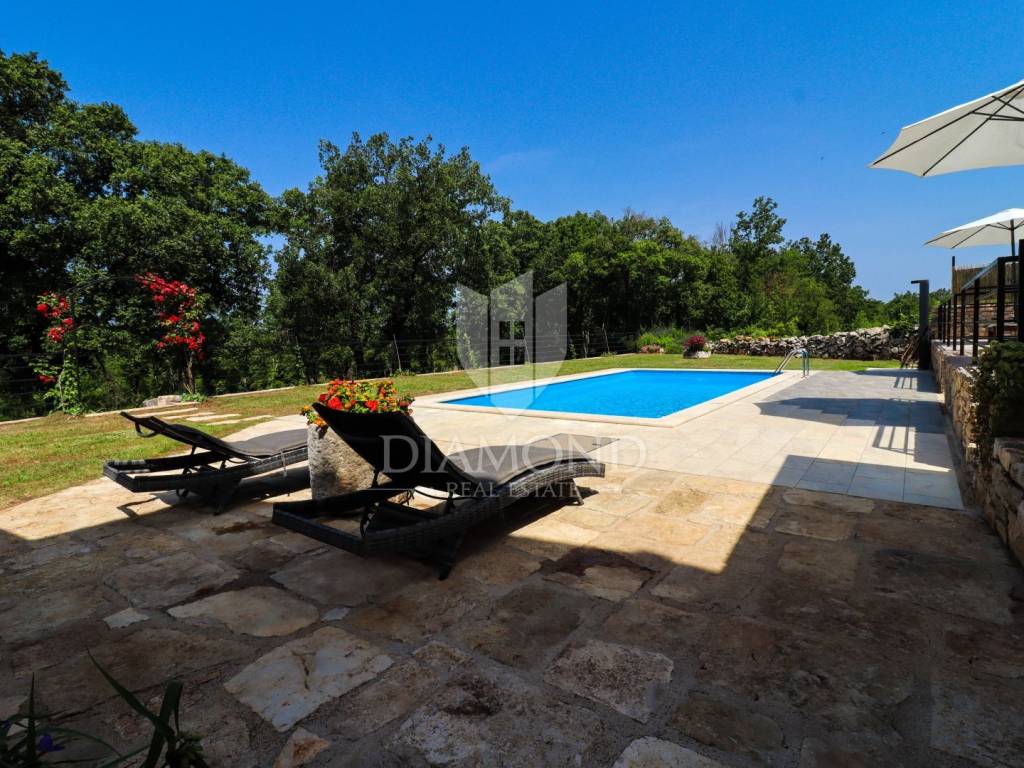 On the edge of the village, only 18 km from the town of Poreč and the beaches, and only 12 km from the first beaches and Vrsar, an autochthonous Istrian villa with a spacious property is for sale! The villa was completely renovated in 2020 and extends over two floors. On the ground floor of the villa there is a spacious living room, kitchen and dining room, bathroom and storage room. An elegant staircase leads to the first floor, where there are three bedrooms, one of which is a master bedroom with its own bathroom, and the other two have a shared bathroom. From the living room, we go directly to the covered terrace of 35 m2, which offers a view of the swimming pool with a sun deck. Next to the pool is the summer kitchen, which was newly built in 2022. The entire renovation was done to a high standard and the villa is equipped with style and quality furniture. In front of the villa there is a spacious plot of land that is part of the property. The villa is surrounded by 9,000 m2 of peaceful walks on its own property. Behind the villa is an Istrian stone house that needs to be completely adapted so that it would be connected to the property and get a real story. It consists of a living room, kitchen, dining room, bathroom and three bedrooms. The yard is completely fenced. In the yard, there are two additional legalized buildings, one building serves as a covered parking lot, and the other has begun to be adapted into a smaller apartment. There is enough space for a swimming pool in the yard, so it will enable the future owners to expand the facilities after renovation. A shop, school, kindergarten, restaurants, post office, pharmacy and a walk in nature are only a few minutes away by car. The place is quiet and decorated with holiday villas.
