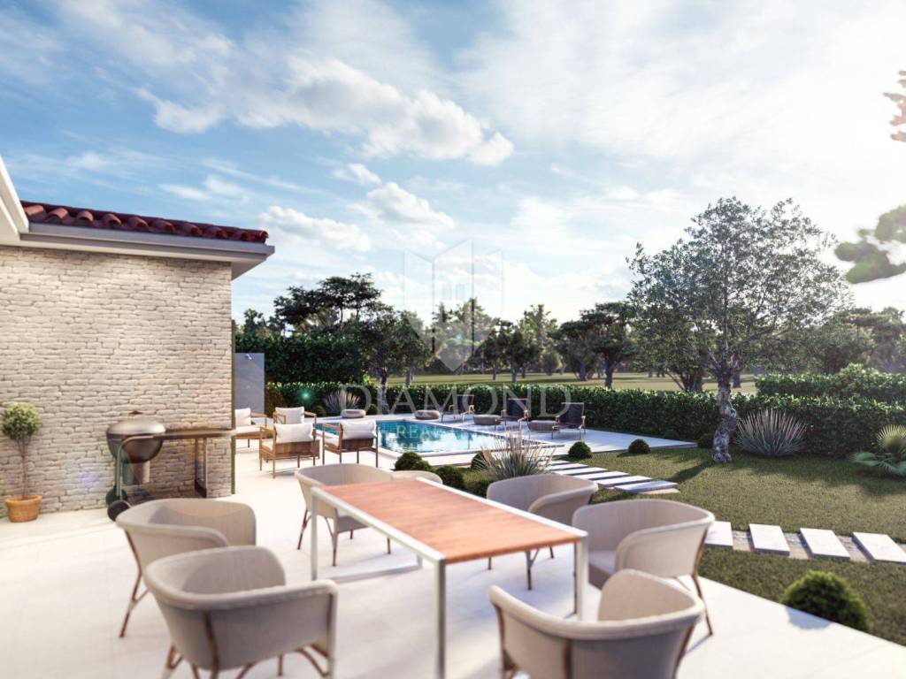 In the idyllic Istrian town, an impressive construction project is being implemented, integrated into the picturesque landscape. A total of five fantastic villas with swimming pools are being built. This unique project combines modern design with traditional architecture, offering future residents a luxurious and comfortable home. Each of the villas enchants with its individual design and high-quality construction. Large window facades allow natural light to enter the rooms and at the same time provide a beautiful view of the surrounding nature. This cluster of five villas offers timeless elegance. Future owners can expect first-class equipment and a well-designed room concept. Spacious living areas create an open and pleasant atmosphere, while quality materials and modern facilities ensure comfort and style. Each villa has a total of three bedrooms, each with its own well-equipped bathroom, offering refuge and privacy. The outdoor facilities are equally impressive. The villas have their own garden with a swimming pool, perfect for relaxing and enjoying the Mediterranean environment. The spacious terrace invites you to socialize outdoors, while the swimming pools, which have the option of heating, offer refreshment on hot summer days as well as on winter days. The planned heating of the villas will be via a heat pump as underfloor heating and air conditioners with central control. Water heating is provided by solar panels. With its successful combination of modern design, traditional architecture and first-class equipment, these houses will undoubtedly become the preferred residence of new owners who are looking for an extraordinary living environment. As these properties are currently under construction, prospective buyers usually have the opportunity to choose and make decisions about various aspects of their future property, including design, materials and additional features. The property is included in the VAT system and the price with VAT is displayed. Due to the ideal location for those looking for a combination of peace, proximity to the sea and bathing bays that are only 6 km away, this is a unique opportunity to buy a luxury villa in the middle of the enchanting Istrian landscape.