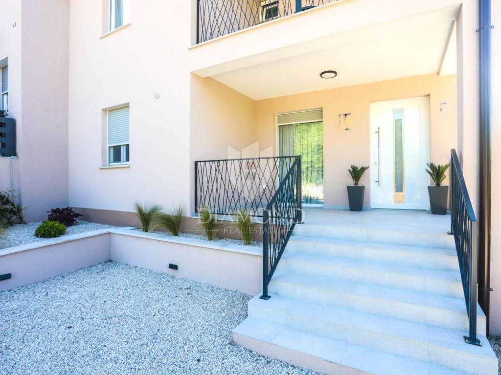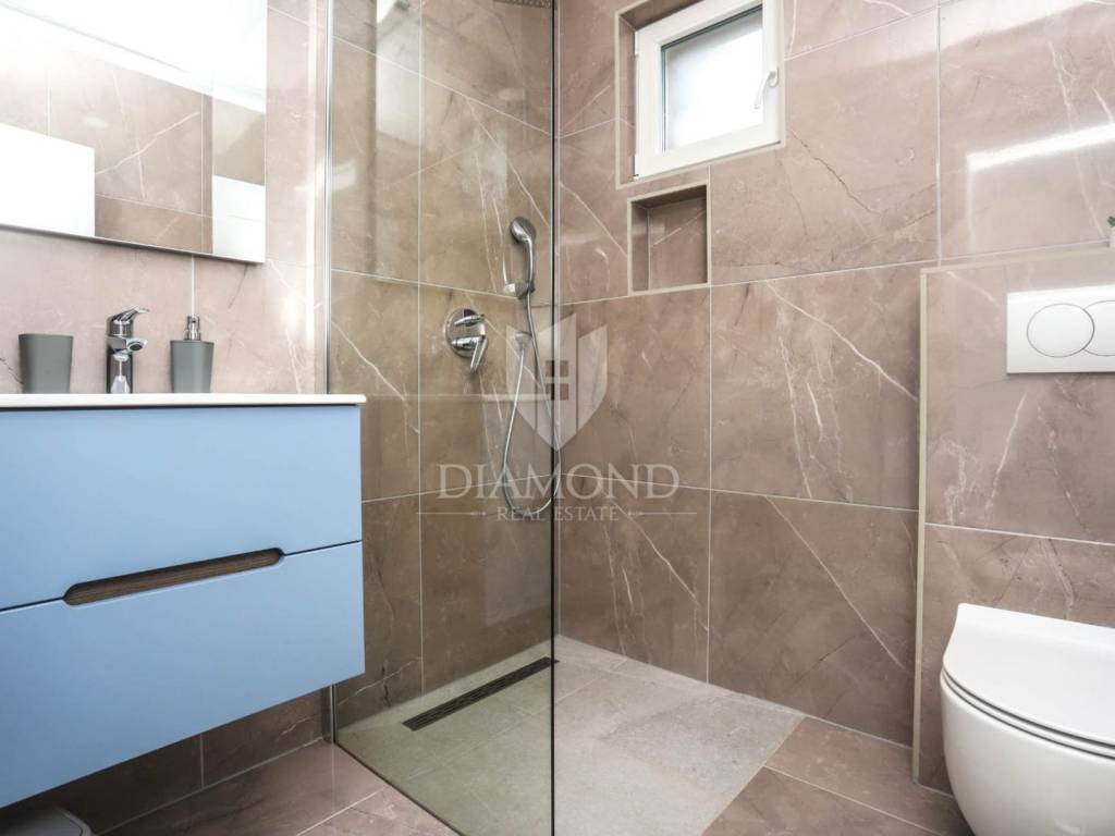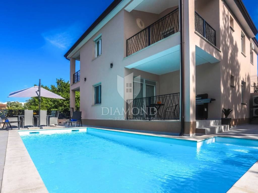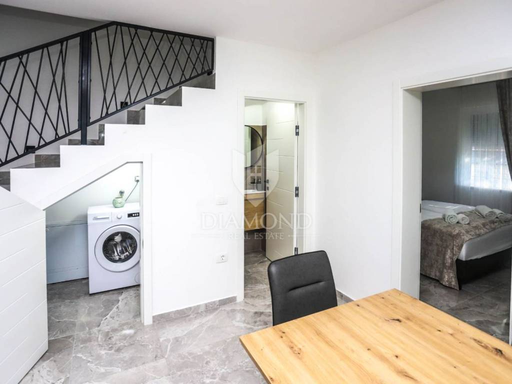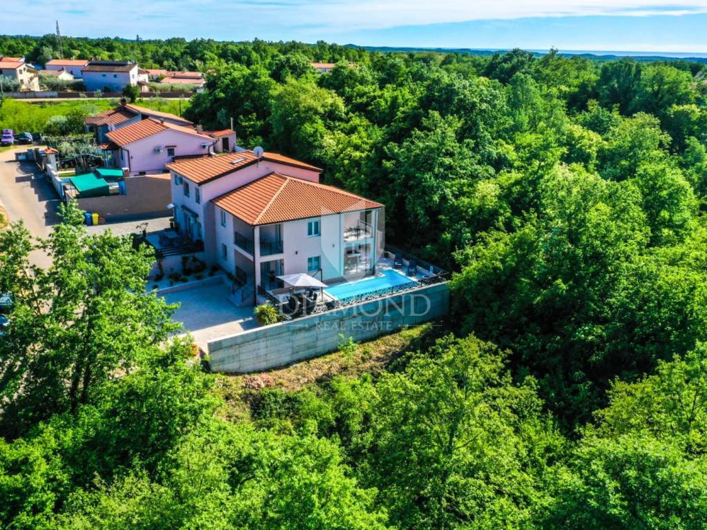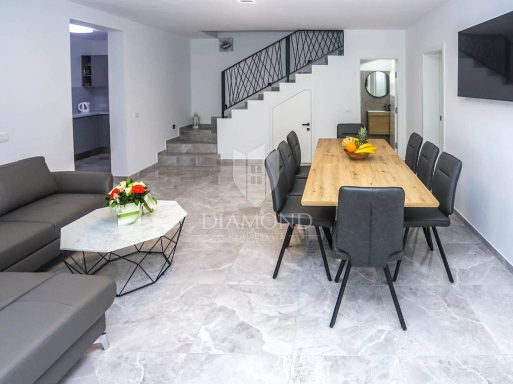 Poreč, surroundings, modern semi-detached house with swimming pool In the suburbs of the city of Poreč, this interesting house with a swimming pool is for sale. On the ground floor there is a beautifully decorated living room, kitchen and dining room, as well as a bathroom and one bedroom with its own toilet. From the bedroom on the ground floor there is direct access to the terrace, the internal staircase leads to the first floor where there are three comfortable bedrooms, each with its own bathroom and terraces. The living room leads directly to the terrace with a sunbathing area and a swimming pool that offers peace and quiet with a view of nature. The total area of the house is 160 m2, and 300 m2 of garden. There is also a practical parking space in the yard. The distance from the house to the first beaches is only 6 km. A school, shop, restaurants and pleasant walks are located near the house. Due to its location and exceptional offer, this property is ideal for both family living and tourist rental.