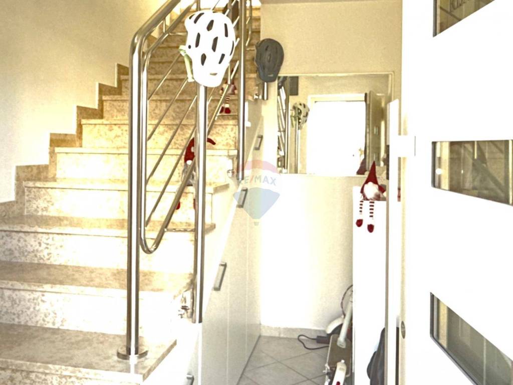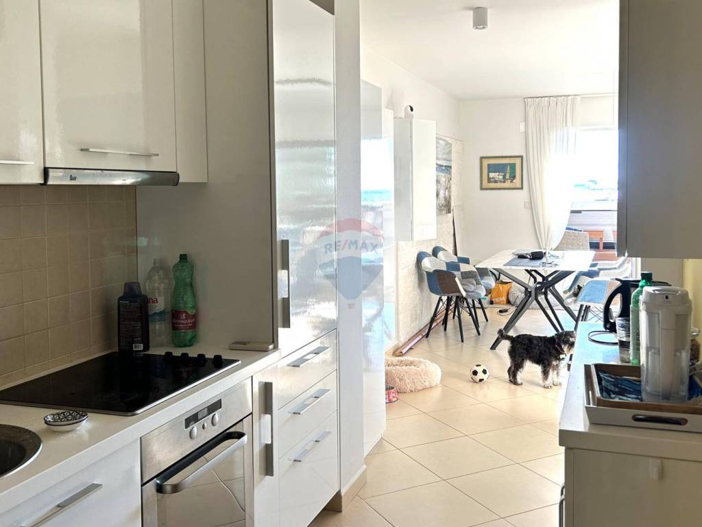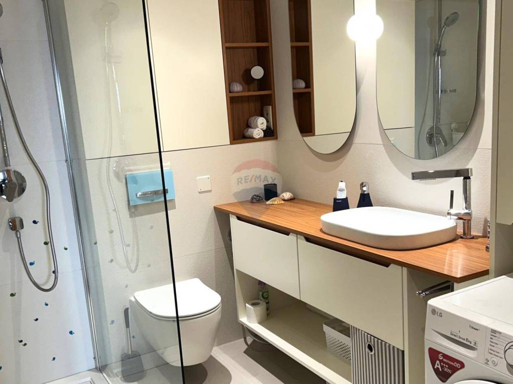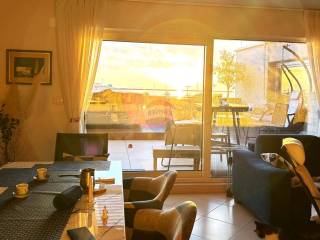 The entrance to the apartment leads through a spacious hallway on the ground floor, equipped with custom-made wardrobes for storage, ensuring both practicality and elegance. Internal stairs lead to the upper level, where a spacious open-plan area opens up, including a living room and dining area. Large glass walls provide an incredible view of the sea and offer a sense of connection to nature. From this space, you can step onto the expansive terrace of 33.56 m2, equipped with a Jacuzzi and outdoor lounge furniture, ideal for relaxation and enjoying the beautiful surroundings.