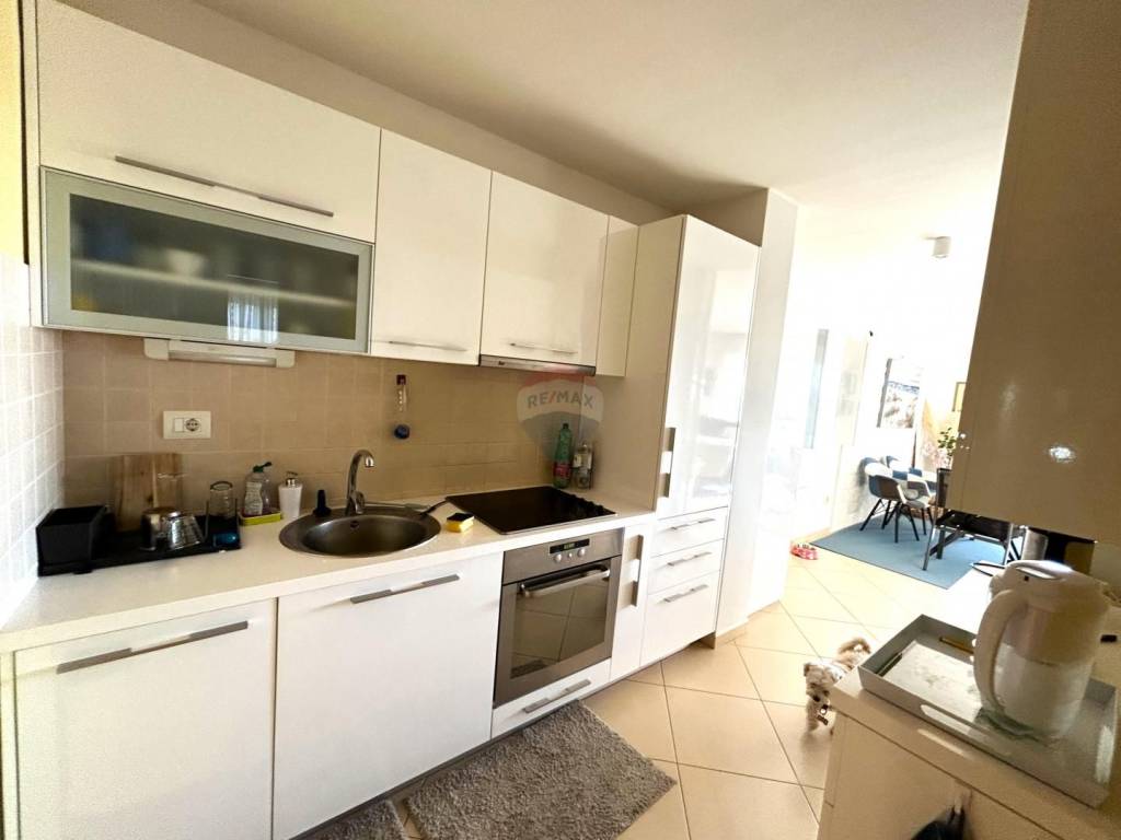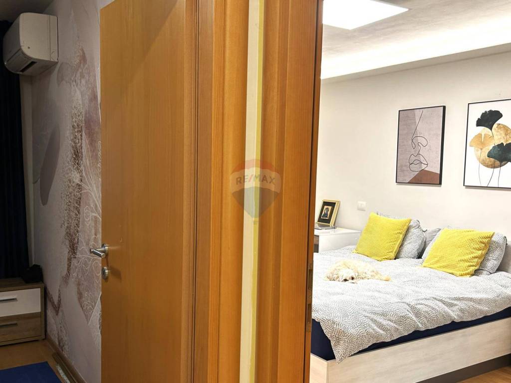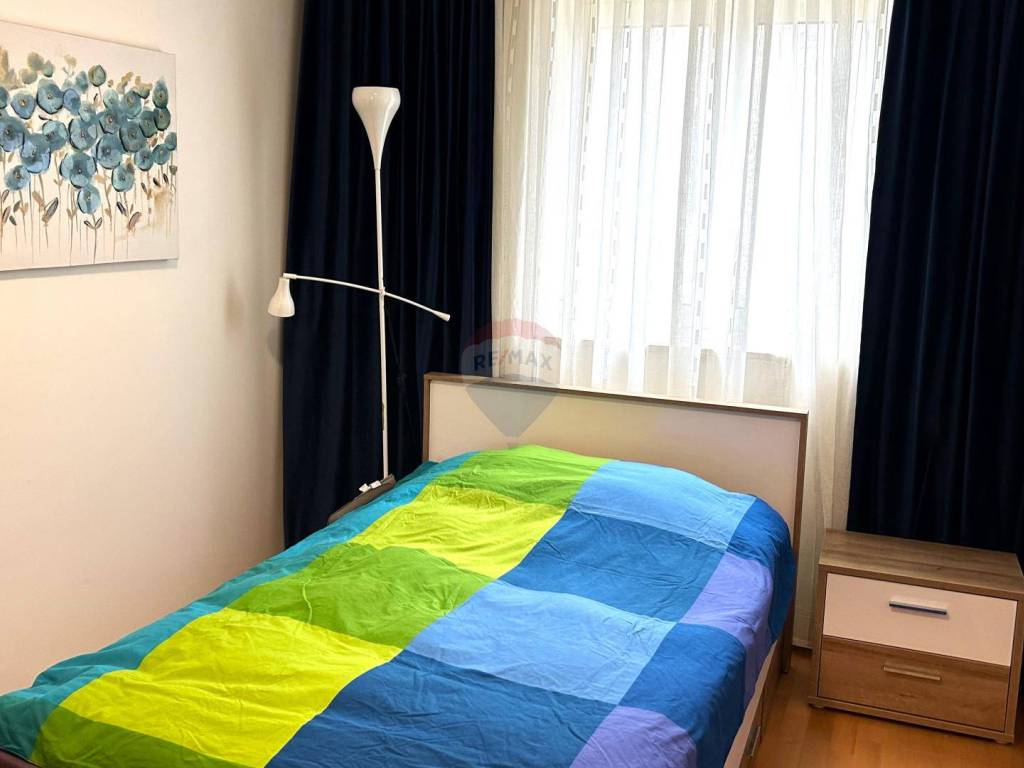 The apartment also features a custom-made kitchen with high-end appliances, two spacious bedrooms, and a bathroom. The total living area of the apartment is 87 m2, and it also includes a garage space of 22.20 m2.