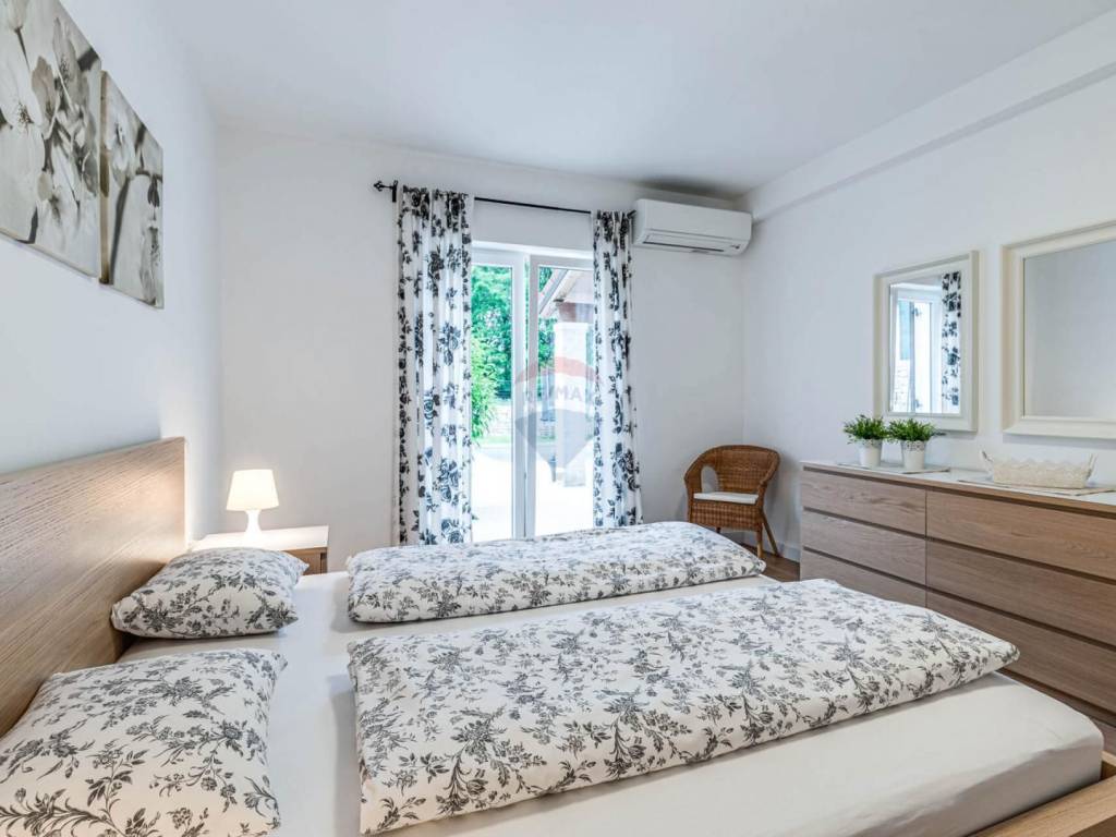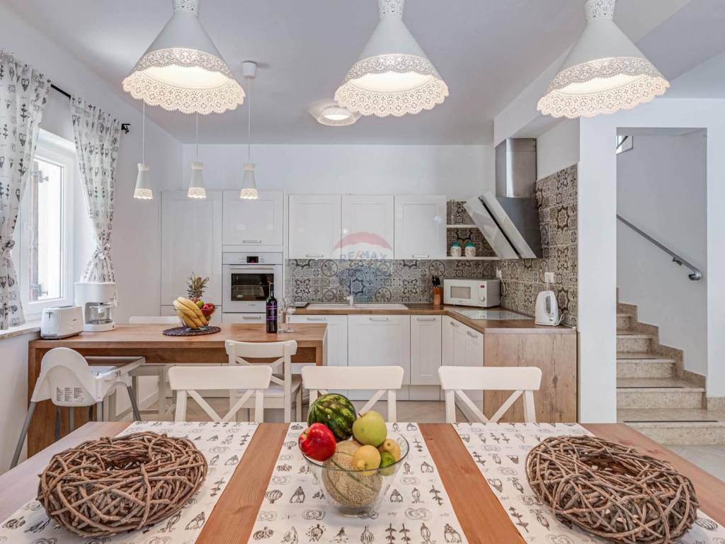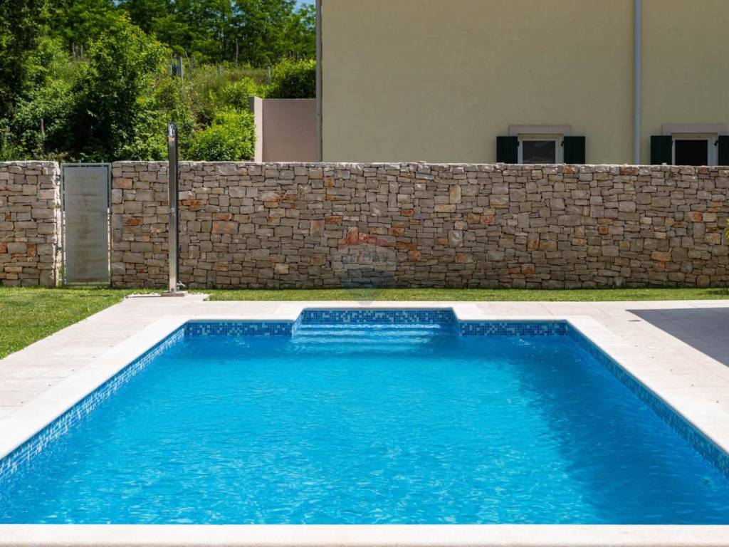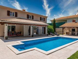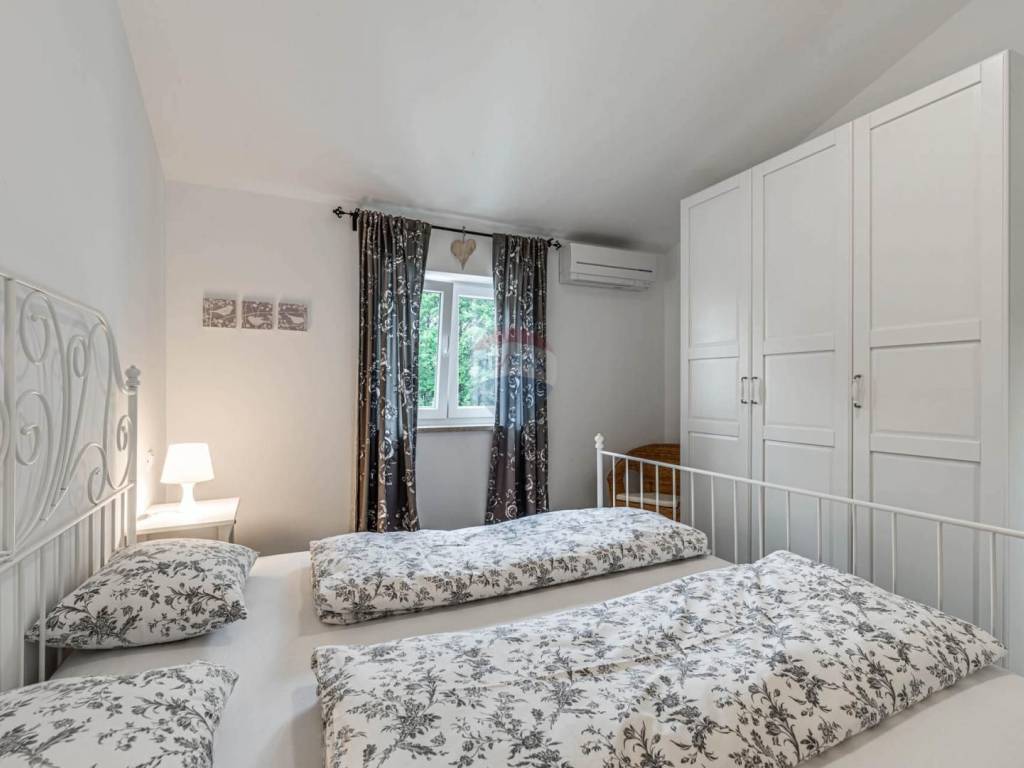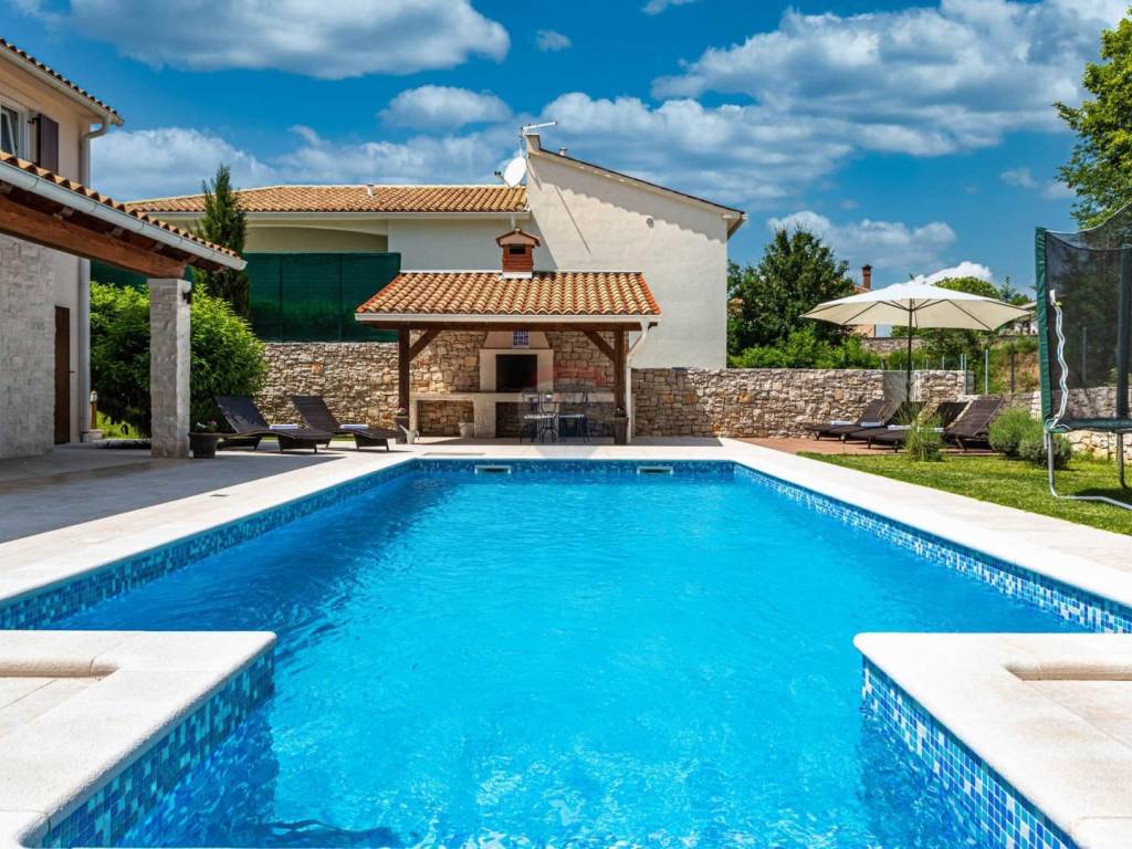 Located in the rural surroundings of Labin, this beautiful, high-quality, classic holiday home with an area of 143 m2 consists of a living room and kitchen, 4 bedrooms and 4 bathrooms, a summer kitchen and a beautifully decorated and fenced yard with a swimming pool. Heating is provided by underfloor heating and inverter air conditioners have also been installed. Parking is provided for several cars.