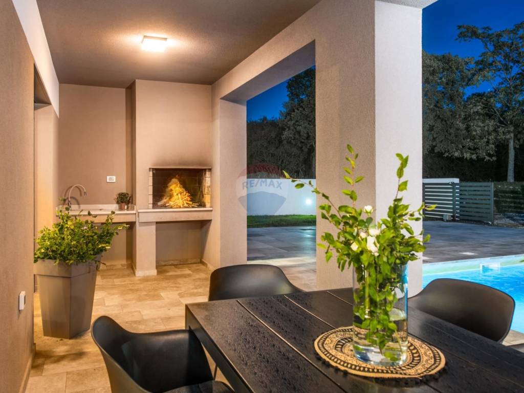 The living room opens onto a summer kitchen with a barbecue and a landscaped yard featuring a 30m² pool with a sunbathing area.