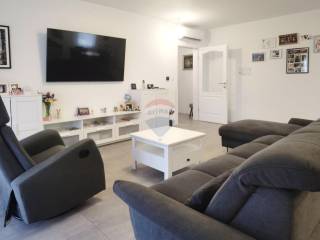 Large glass walls in the living room provide plenty of natural light and lead directly to a spacious covered terrace, perfect for barbecues and enjoying the view of the green surroundings.