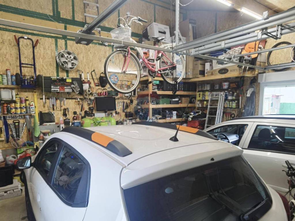In front of the entrance, there is a large garage with two parking spaces.