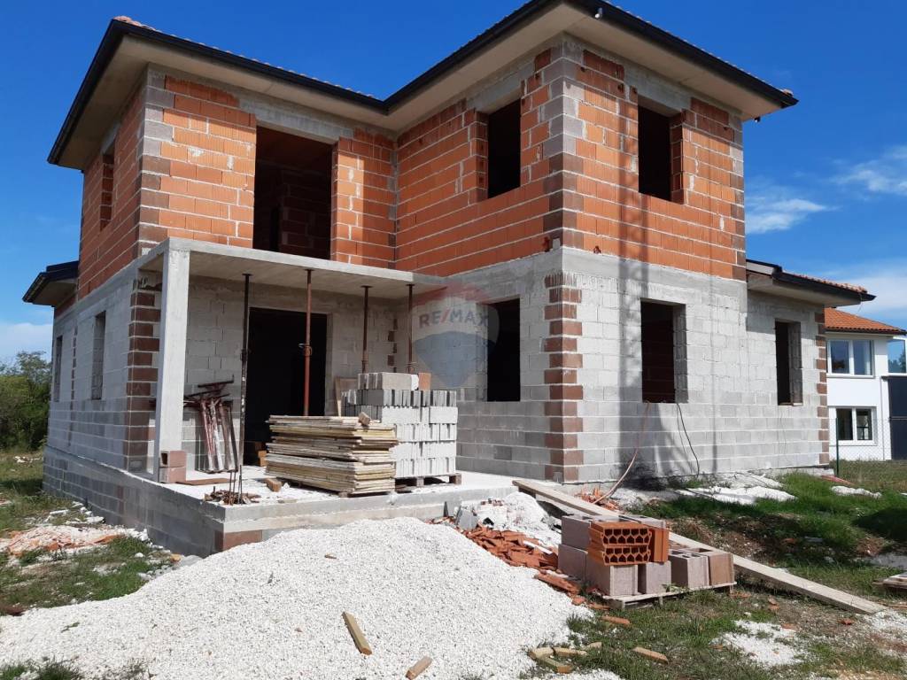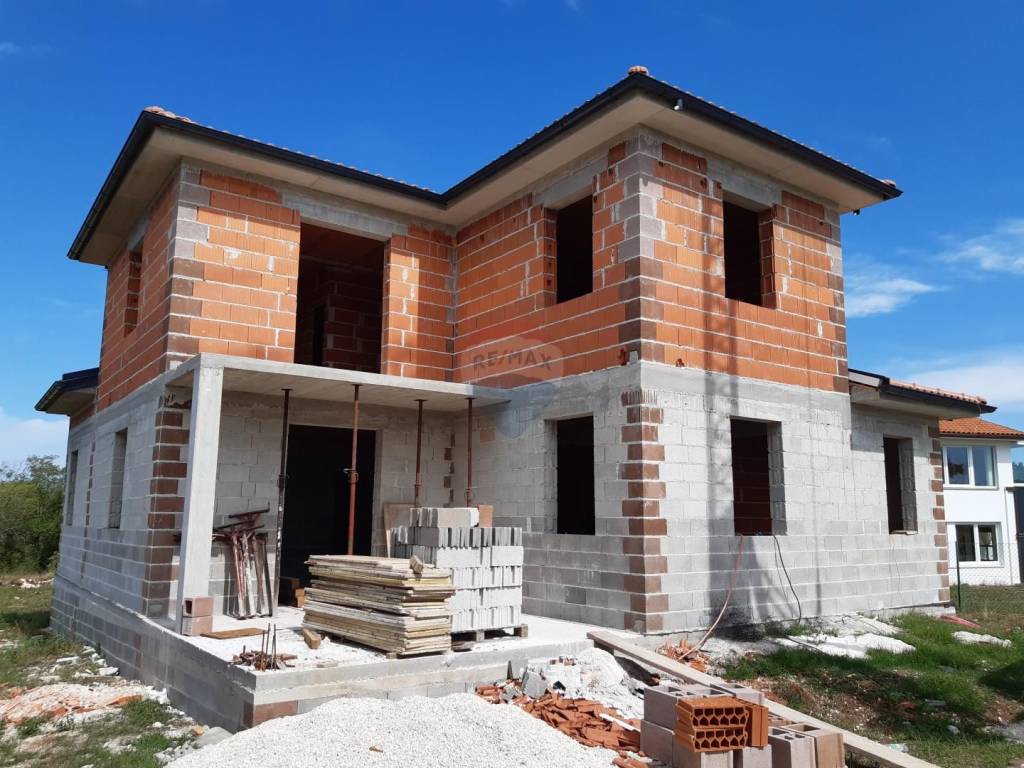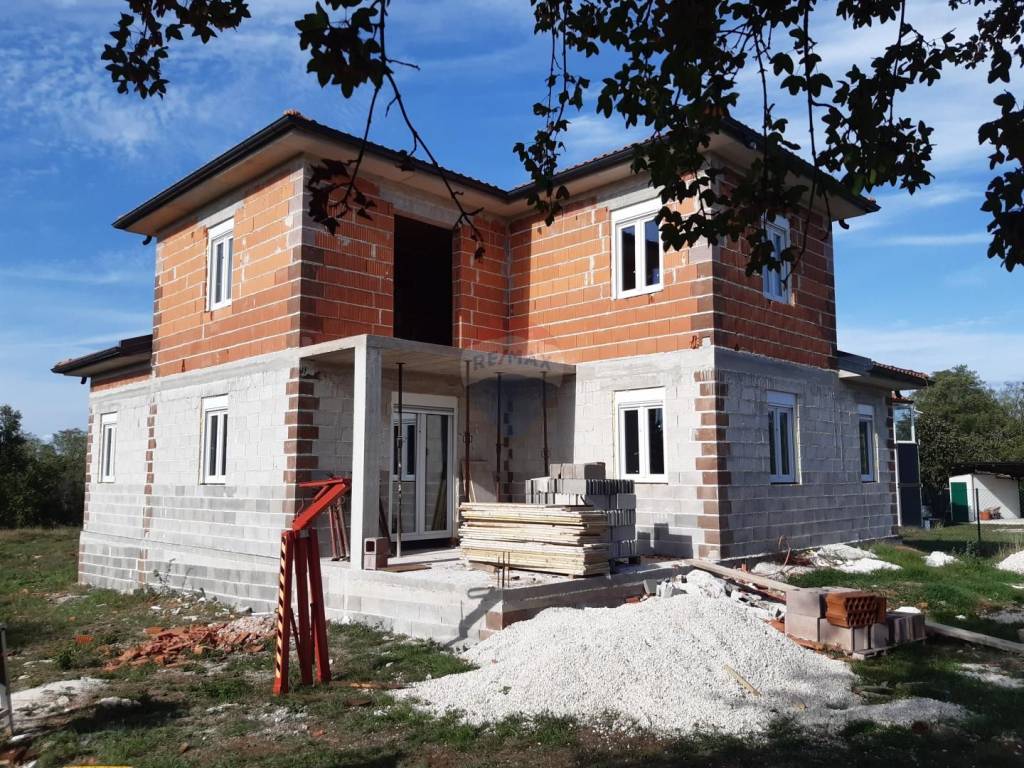 Just a few kilometers from Kanfanar, we are selling this beautiful house under construction. The house is located on a plot of 1116m2. Its total gross area is 369 m2, the floor plan has 203 m2 gross area. It is designed to have an open type kitchen, living room and dining room on the ground floor. Also on the ground floor there are two rooms with bathrooms and toilets, as well as a small storage room and a boiler room. In the continuation, the living room leads to the terrace. Upstairs there are three bedrooms with bathrooms. One room has a terrace. The house was built to a high standard and quality materials were used. The advantage of this house is that it is located in a quiet place surrounded by nature and is the last one in the village. The swimming pool with barbecue is located behind the house. Parking is provided in the garden.