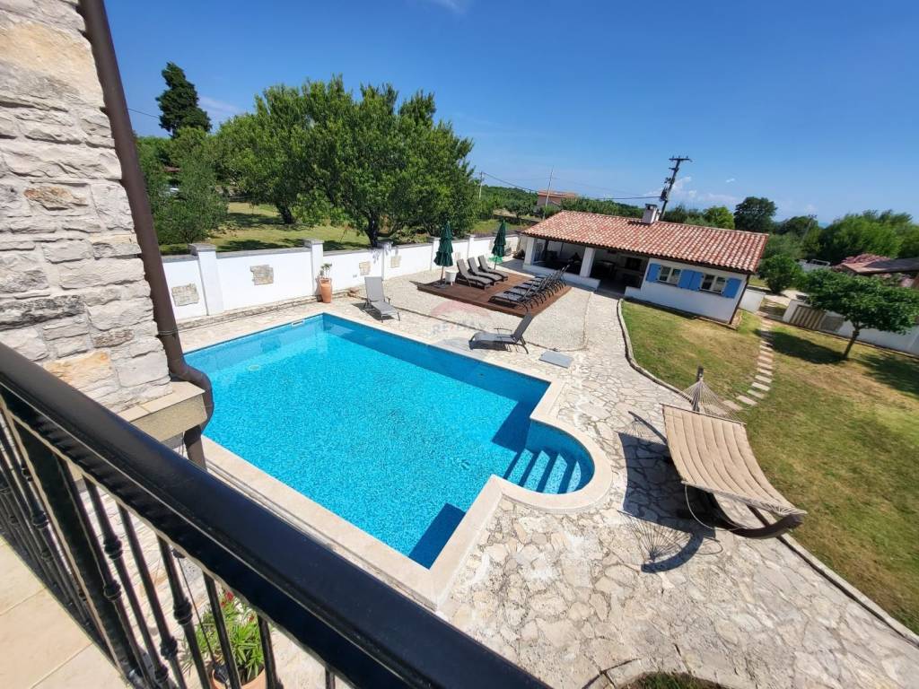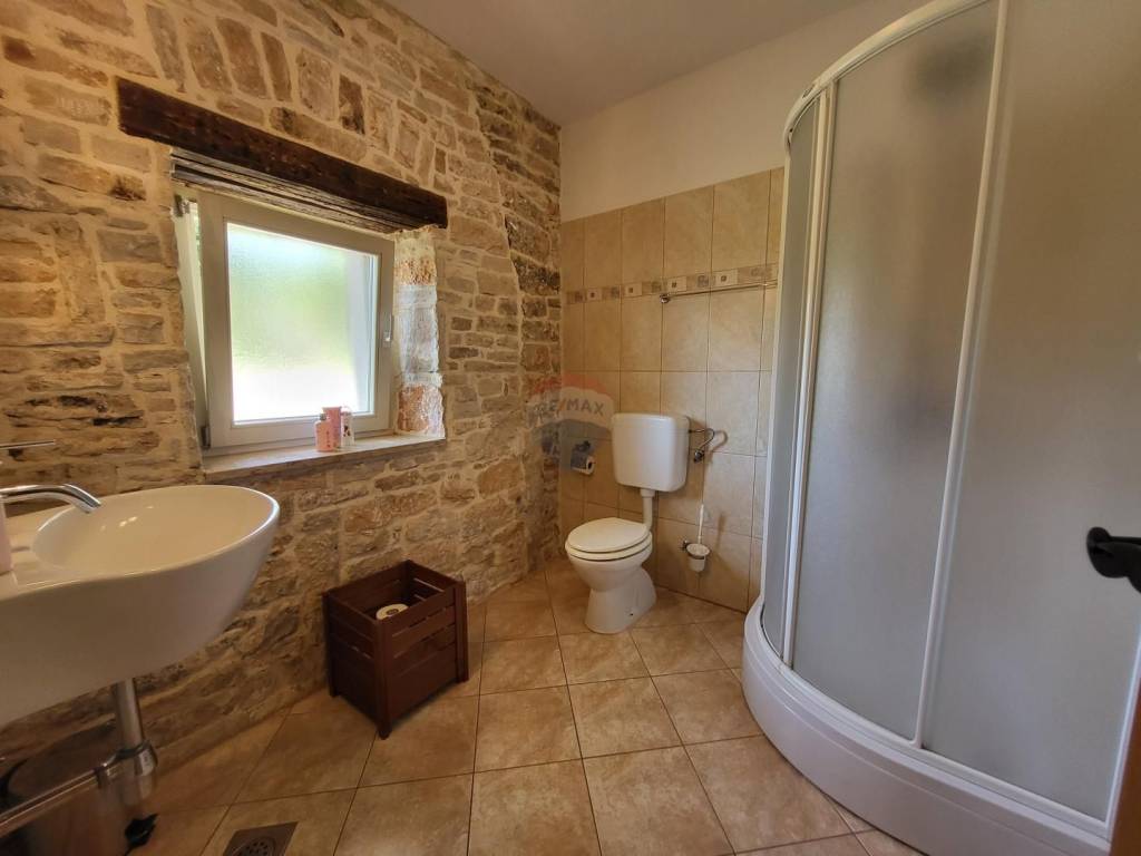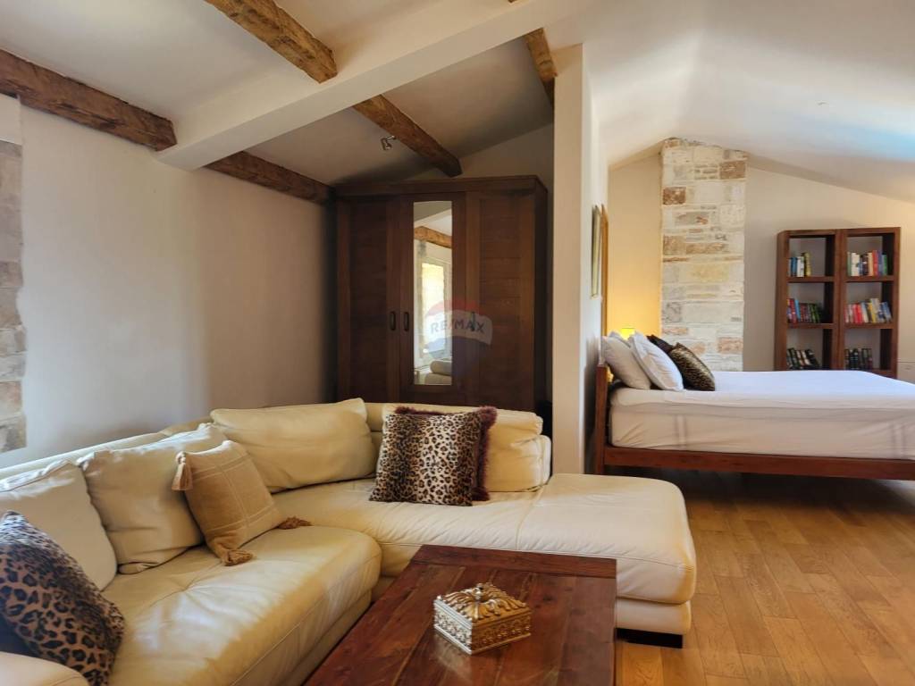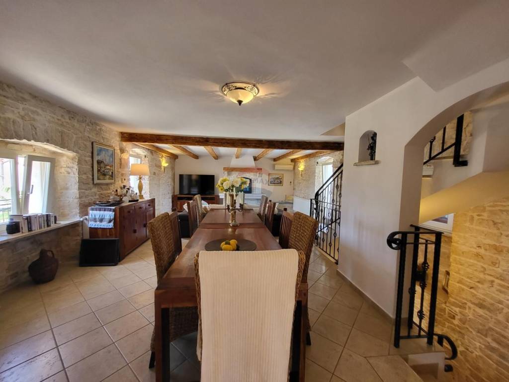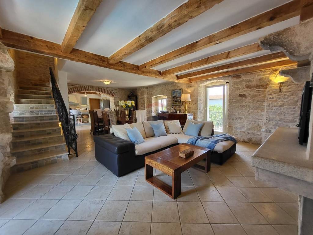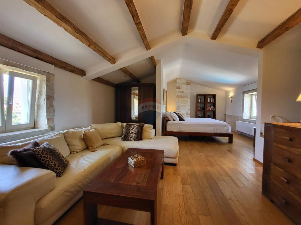 For sale is a beautiful originally Istrian stone house, completely renovated and remodeled a few years ago. The house is located in a small Istrian village, and it is located on the edge of the village on a larger plot of about 1900m2. So the back part, where the swimming pool, sunbathing area, barbecue, terrace and socializing area are located, is completely hidden and offers peace and privacy. The house has been extremely beautifully and qualitatively renovated, attention was paid to the details of which it is full. On the ground floor there is an entrance hall and 3 bedrooms with bathrooms. There is also an exit to the back of the yard and the pool. Stairs lead to the first floor, where there is a large living room with a functional wood-burning fireplace. There is also a large dining room and kitchen, pantry and bathroom. On the last floor there is a large master bedroom, with its own open space living room and bathroom. In the yard there is a large swimming pool, sunbathing area, garden house, barbecue and jacuzzi.