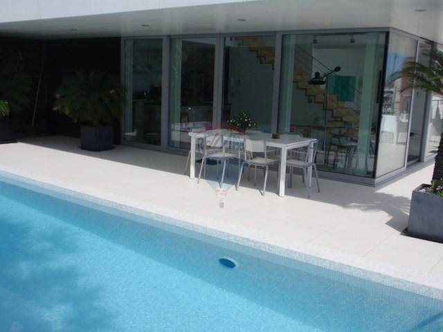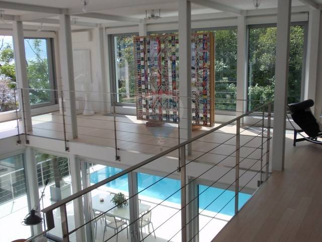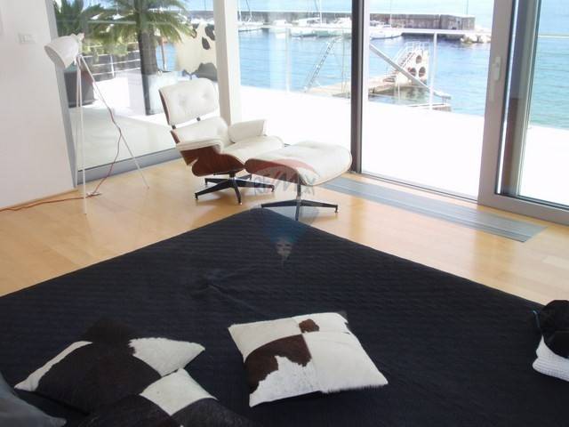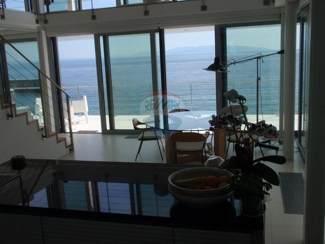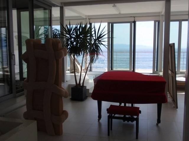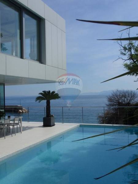 This highly attractive house of modern architecture is situated above the sea with 500 m2 of total area. This extraordinary real estate has an outdoor swimming pool size of 40m2 with heated sea water and spacious terrace. The villa is designed primarily by true hedonists who yearn for a large spaces. It has 3 bedrooms (each with own bathroom) and three-story space is internally connected to the elevator. Basement has almost 200 m2 of open space that can be easily customized to fit your needs, whether for residential, business or recreational purpose. On the ground floor is a kitchen, large living room and master bed room with bathroom. On the first floor is also a living room and two bedrooms with bathrooms. The garden is not too large but richly decorated with various of exotic plants. Parking lot has enough space for 3-4 cars.