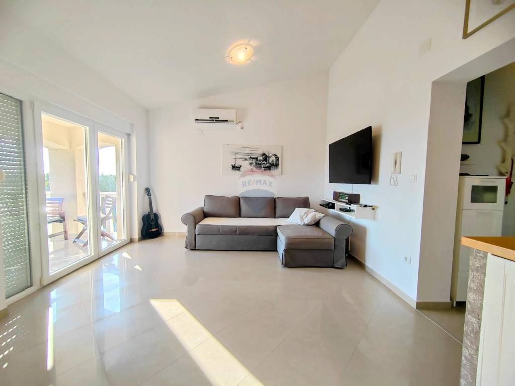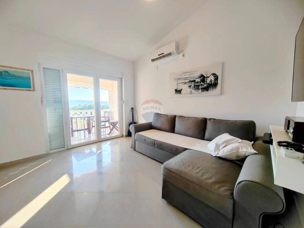 For sale is a beautifully furnished apartment located on the first floor of a building in a peaceful area surrounded by greenery, just 550 metres from the sea. The apartment features two spacious bedrooms, a bathroom, a kitchen with a dining area, and a living room with direct access to a south-facing balcony offering stunning sea views. The property includes one private parking space, while the swimming pool and sunbathing area are available for shared use by all residents. The apartment is air-conditioned, fully equipped, and ready to move into, making it an ideal choice both for a relaxing holiday and for year-round living.