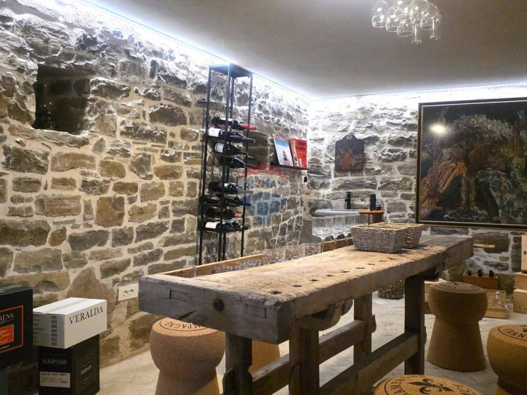 The villa is sold fully equipped and furnished, including all designer furniture and premium appliances, and is completely ready for immediate move-in without any additional investment. It extends over approximately 180 square meters of net living area, with every interior space carefully designed to offer maximum comfort and aesthetic sophistication. The ground floor features a spacious kitchen with a dining area whose large window offers a unique view directly into the pool, creating a rare architectural effect that visually connects the exterior with the interior of the home. The bright living room is enhanced by an elegant designer fireplace. There is also a large bedroom with a gallery and a separate, generously designed guest apartment with its own private entrance. Additionally, the house includes a traditional wine cellar ideal for gatherings, two modern bathrooms with showers and toilets, one separate WC and a large storage area.