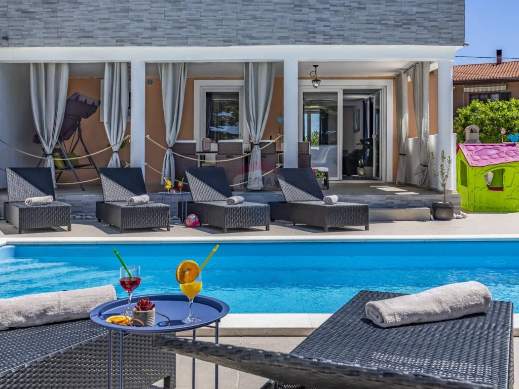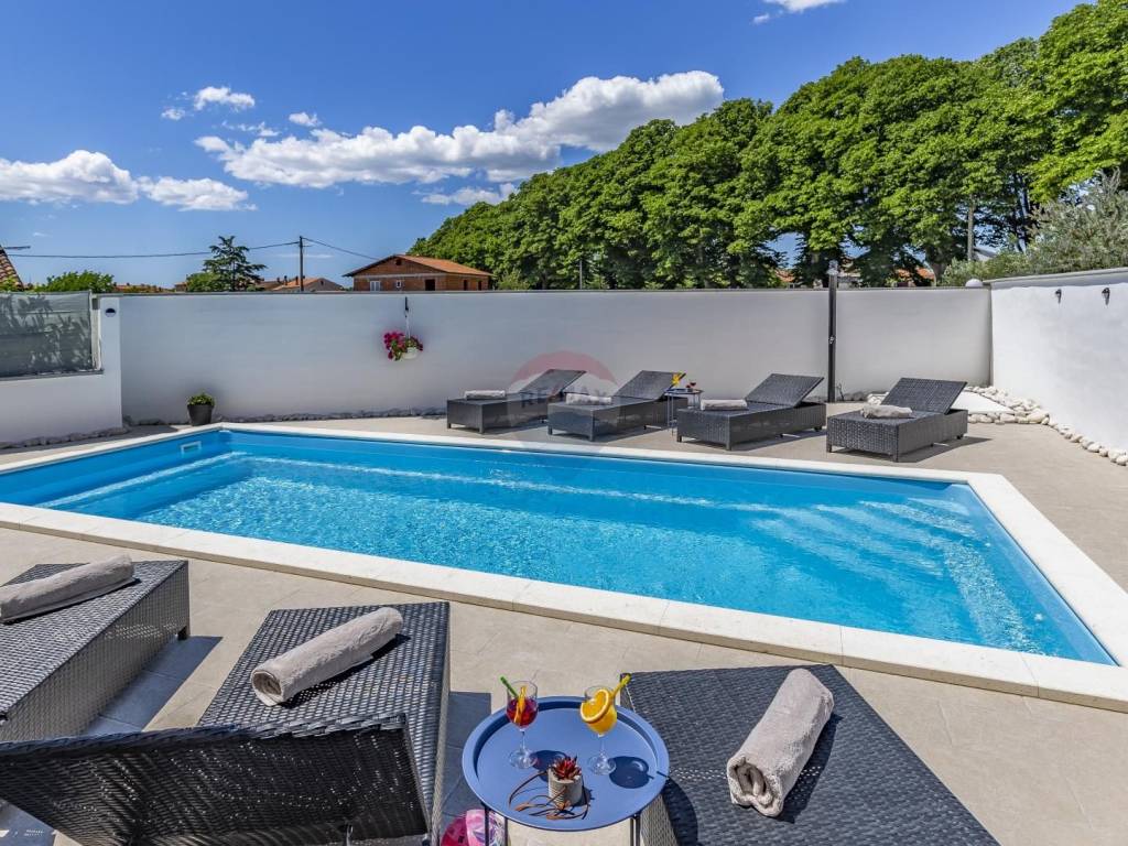 It is located on a beautiful garden bordered by a wall, where there is a swimming pool with a size of 32 m2.