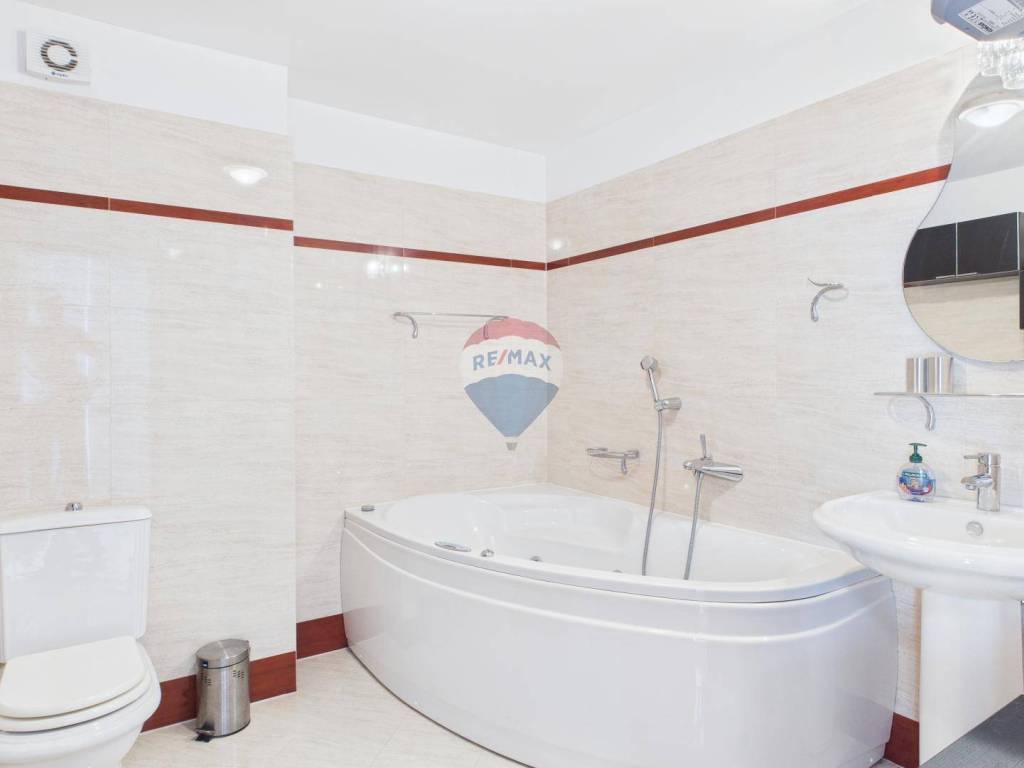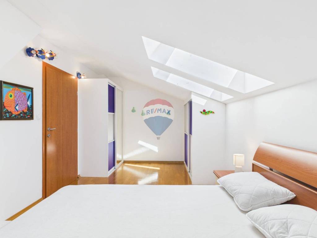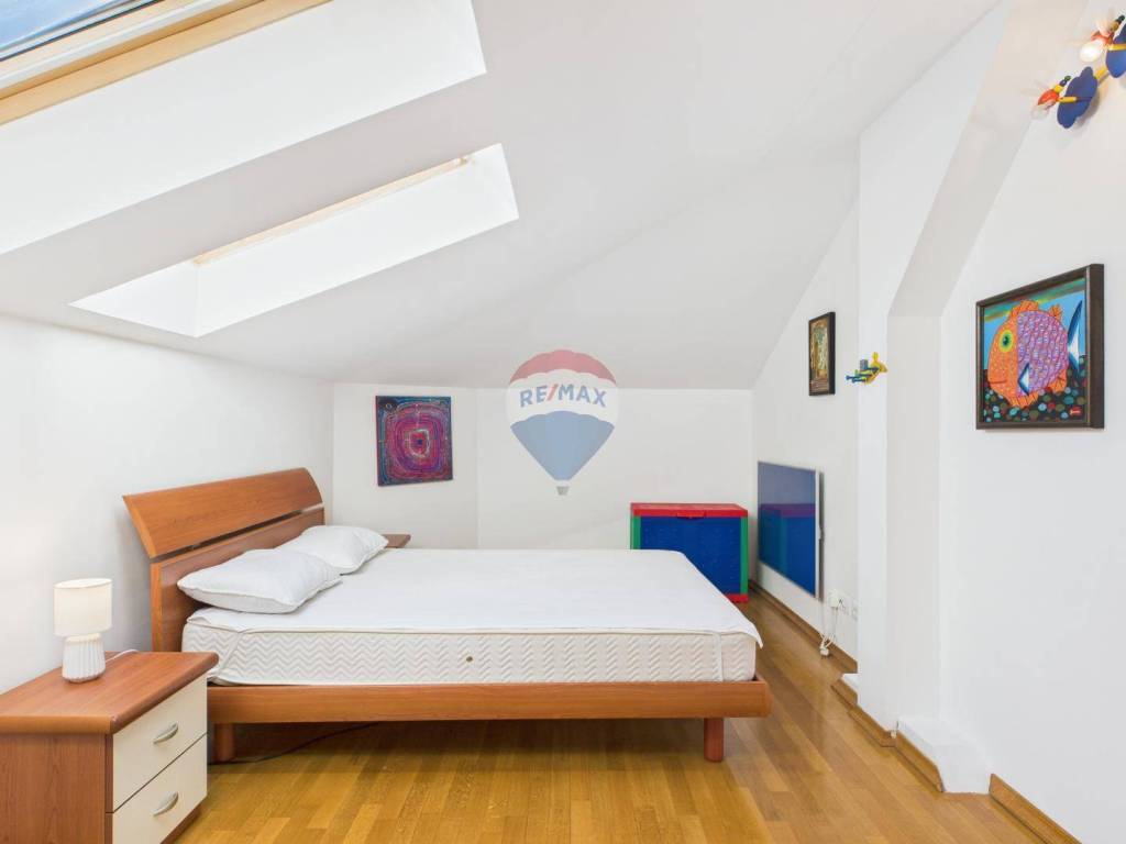 The apartment consists of a spacious living room connected to the dining area and a modern, fully equipped kitchen, a total of four bedrooms, two bathrooms, and a storage room. On the lower floor are two bedrooms and two bathrooms, one of which features a massage bathtub, while the upper floor includes two additional bedrooms.