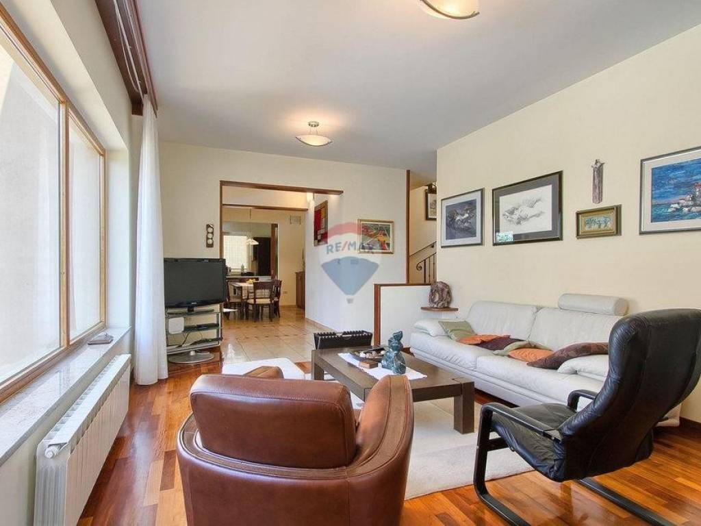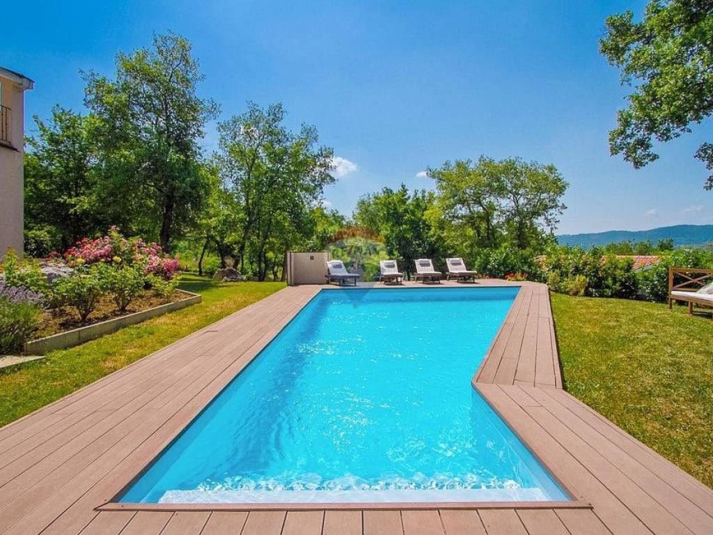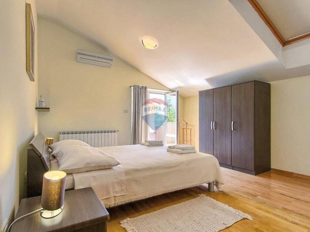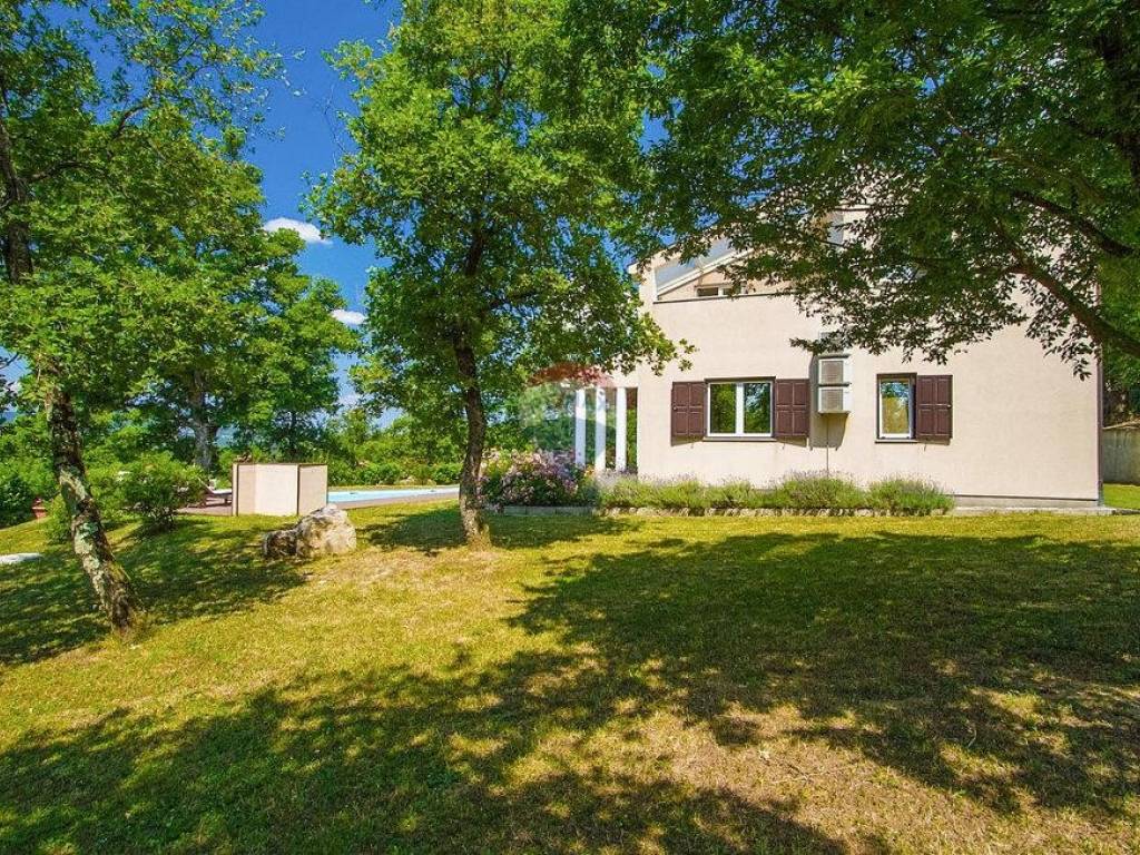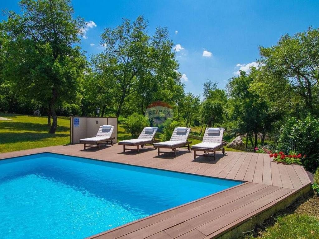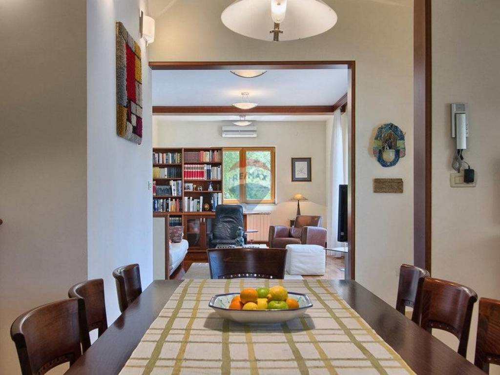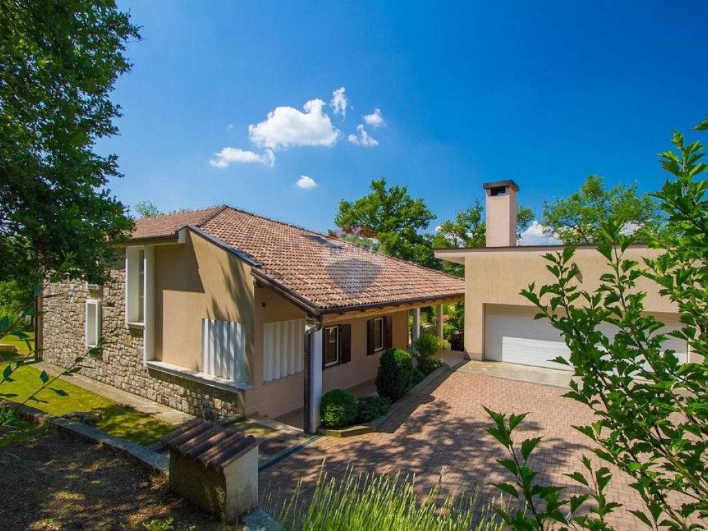 Next to the house is a garage of 36 m2 and a tavern of 30 m2 with a fireplace and a boiler room. The open-concept ground floor of 110 m2 consists of an entrance, dining room, living room, kitchen, utility room, toilet, bedroom with wardrobe and bathroom. On the first floor of 72 m2, there are two bedrooms with bathrooms, a wardrobe, a loggia, a study and a storage room. If necessary, the study can become a 4th bedroom. The house is built with very high-quality materials. The heating is oil-fired and the house is fully air-conditioned. The yard is excellently landscaped, with Mediterranean plants and the house is located in a real small oak forest. The pool is 40m2 in size and modern in shape, also heated.