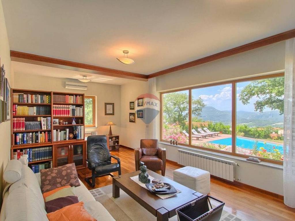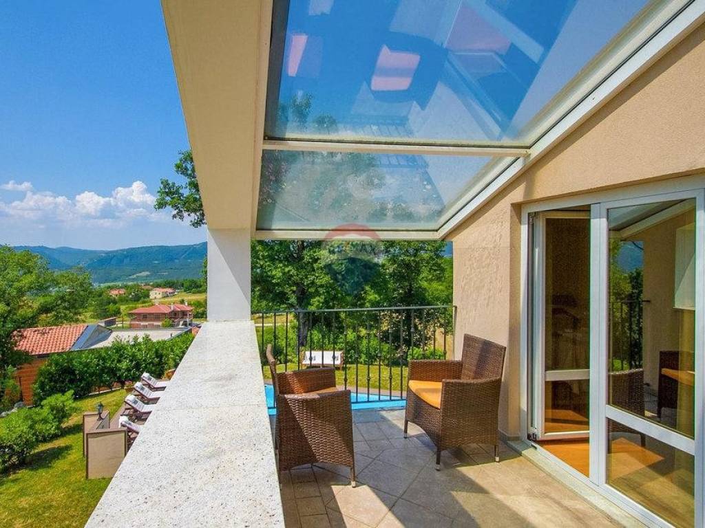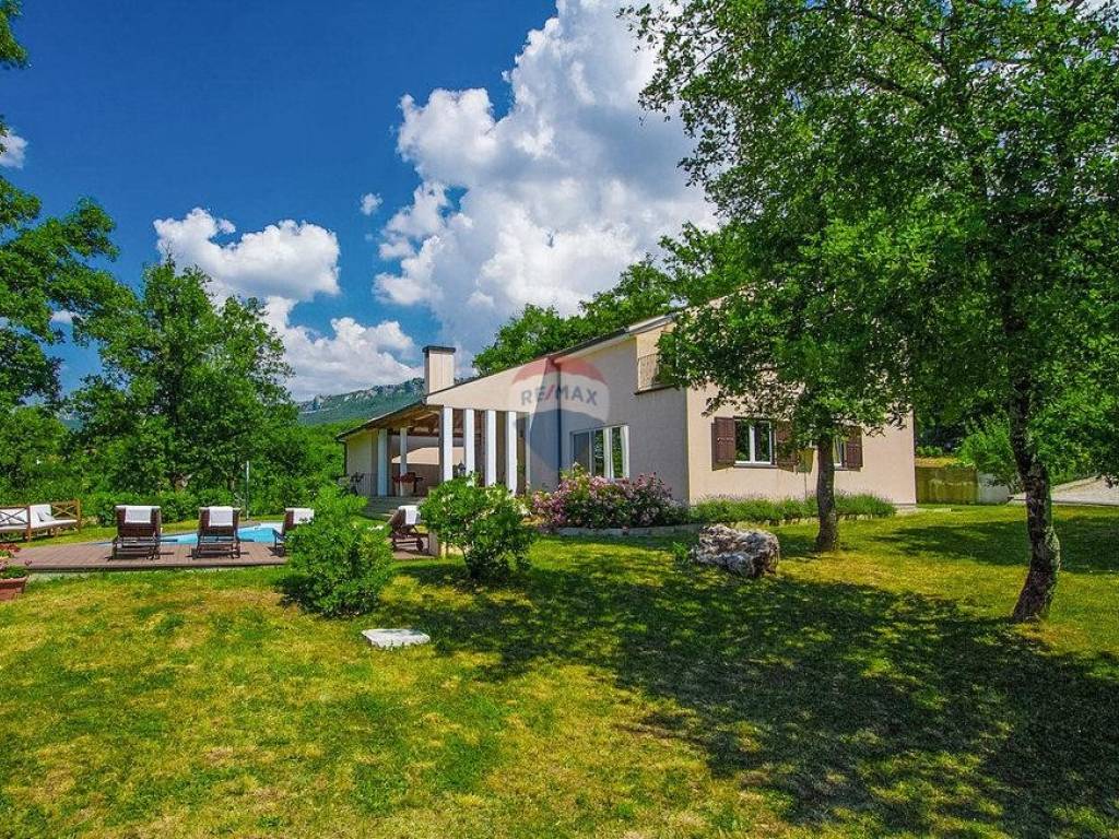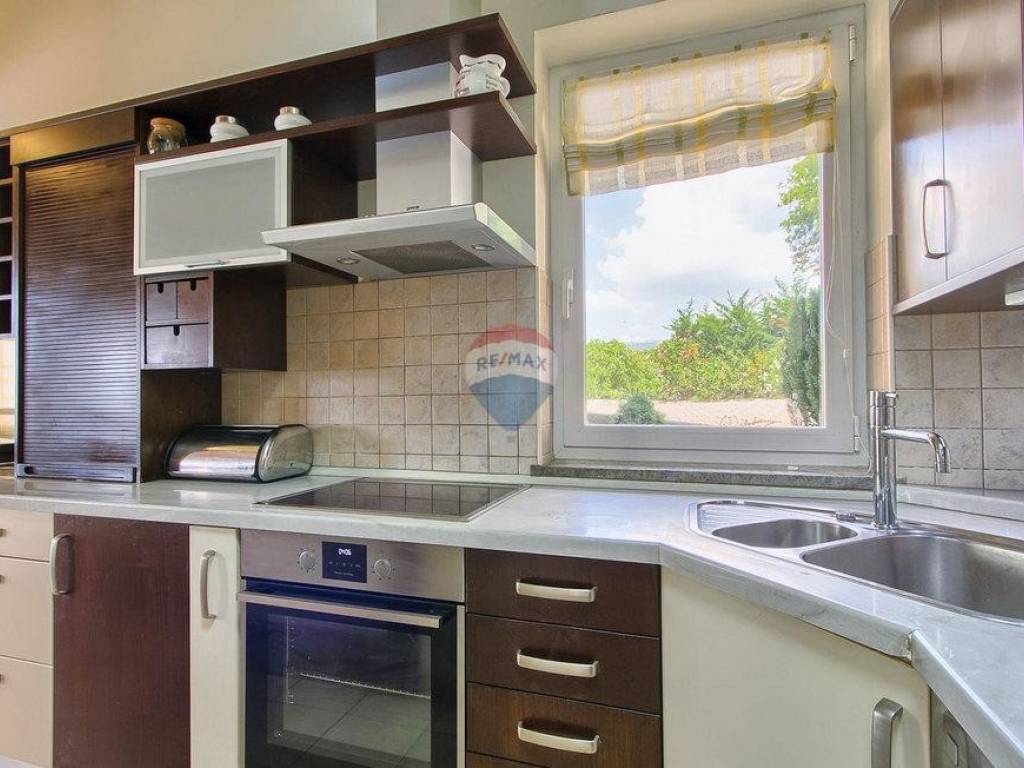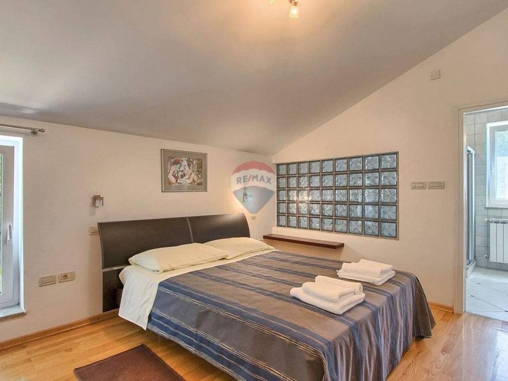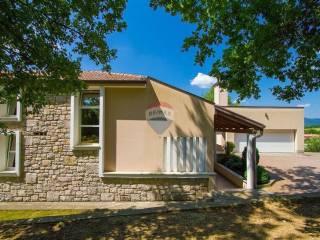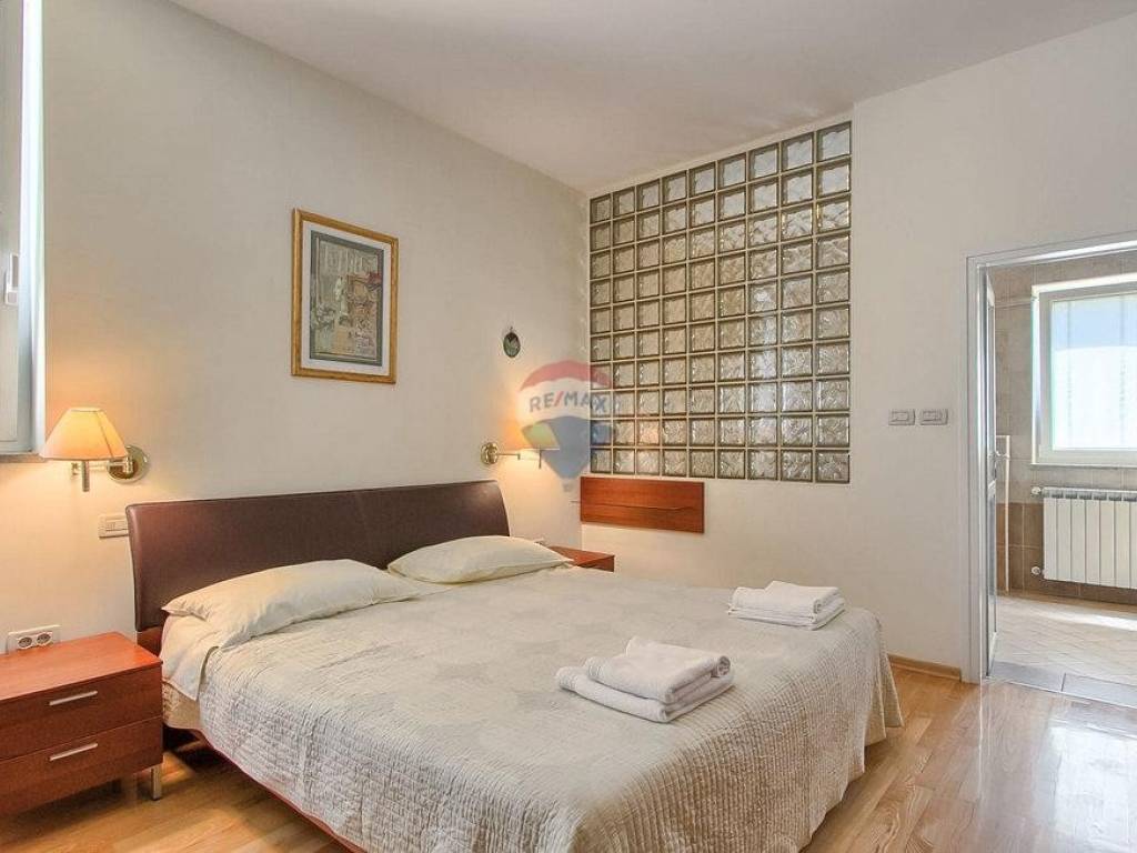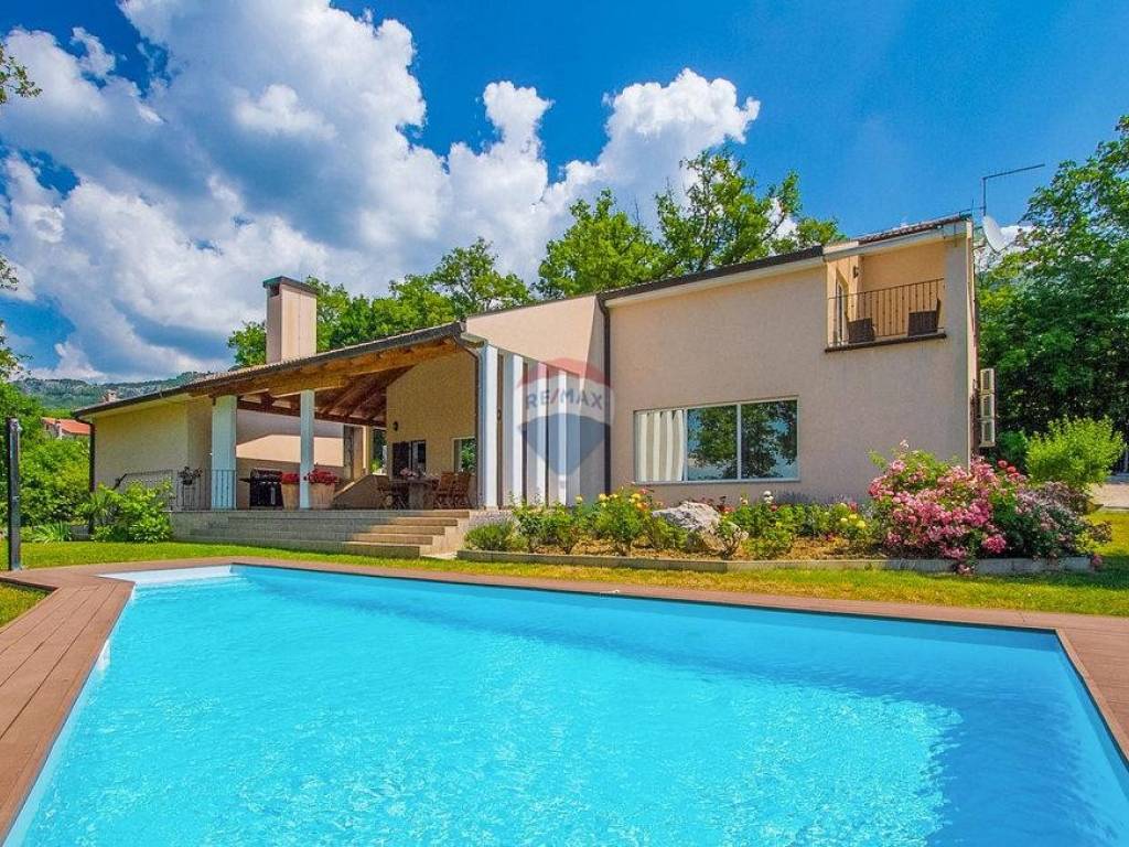 Next to the house is a garage of 36 m2 and a tavern of 30 m2 with a fireplace and a boiler room. The open-concept ground floor of 110 m2 consists of an entrance, dining room, living room, kitchen, utility room, toilet, bedroom with wardrobe and bathroom. On the first floor of 72 m2, there are two bedrooms with bathrooms, a wardrobe, a loggia, a study and a storage room. If necessary, the study can become a 4th bedroom. The house is built with very high-quality materials. The heating is oil-fired and the house is fully air-conditioned. The yard is excellently landscaped, with Mediterranean plants and the house is located in a real small oak forest. The pool is 40m2 in size and modern in shape, also heated.