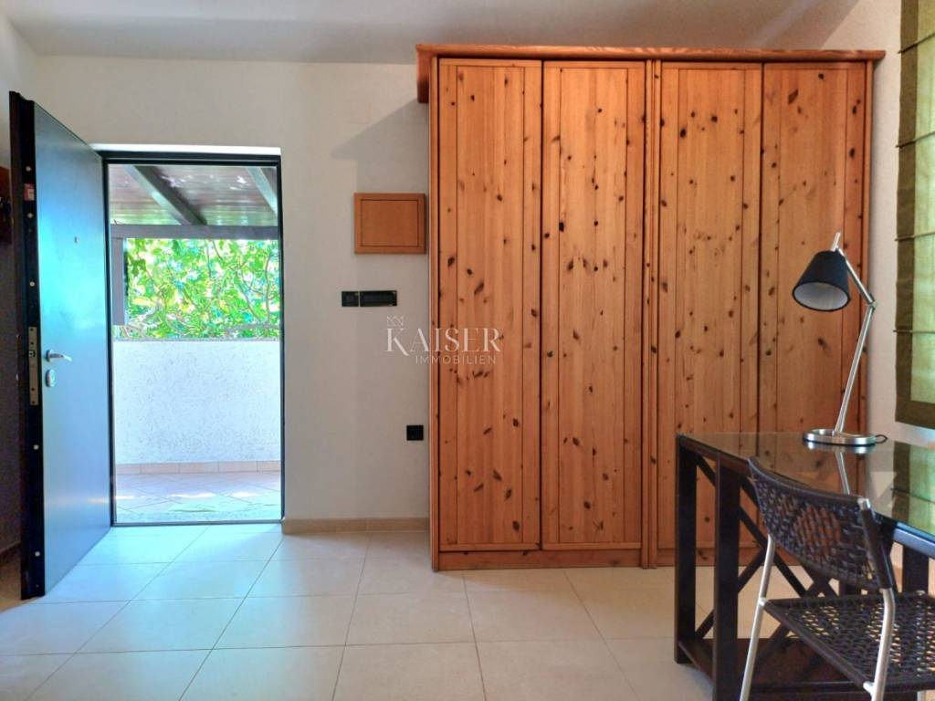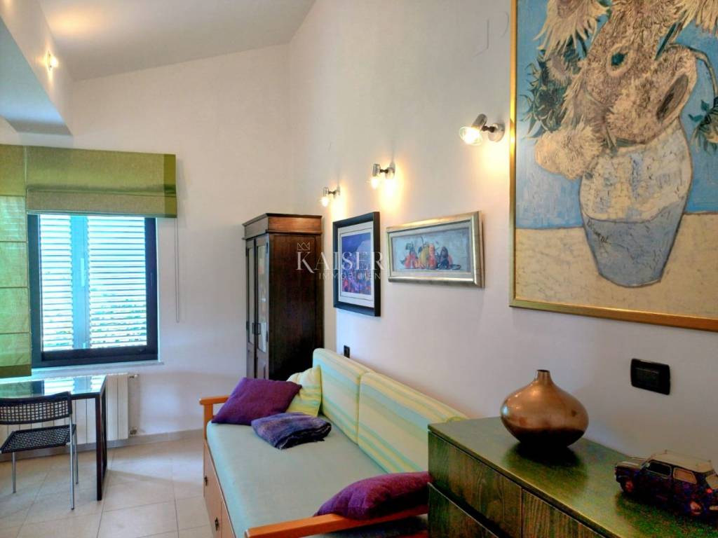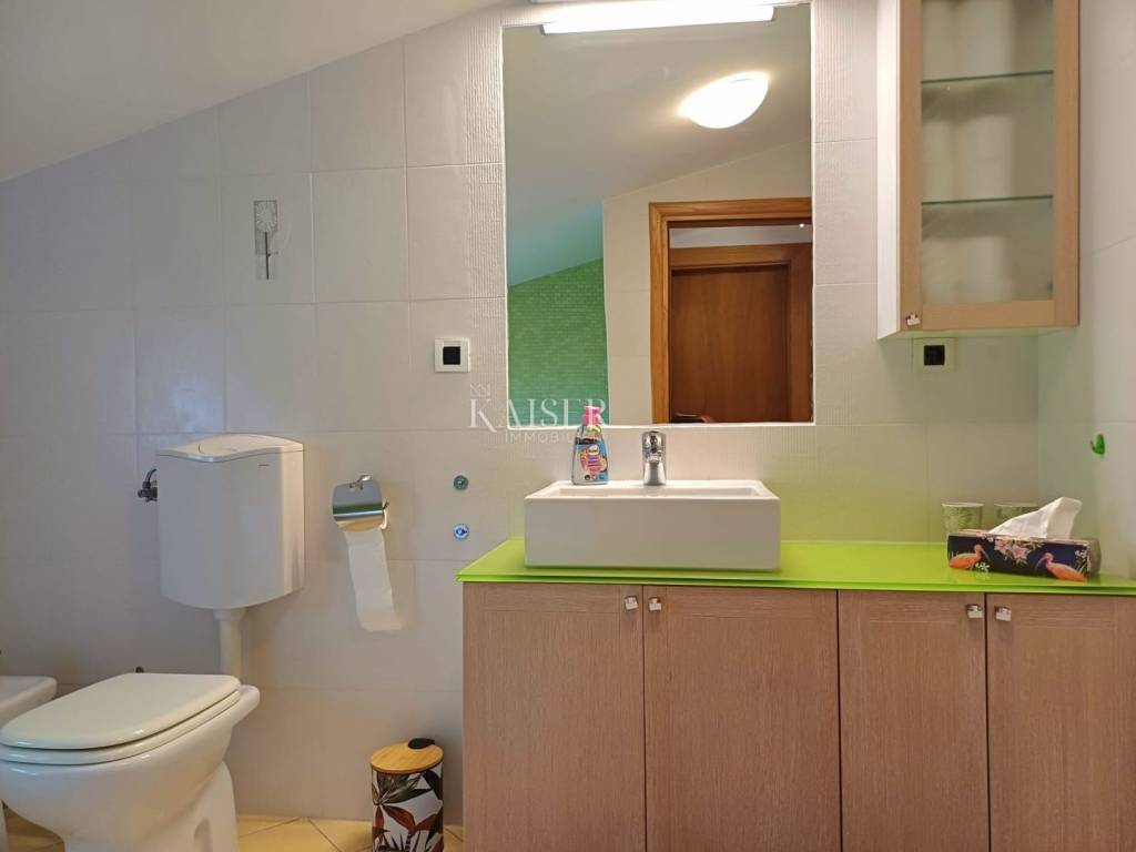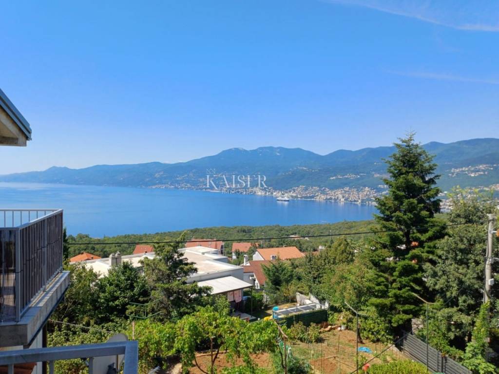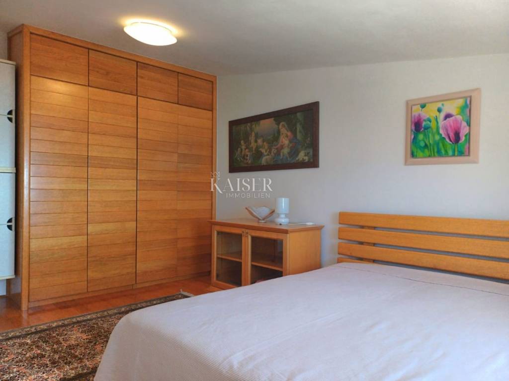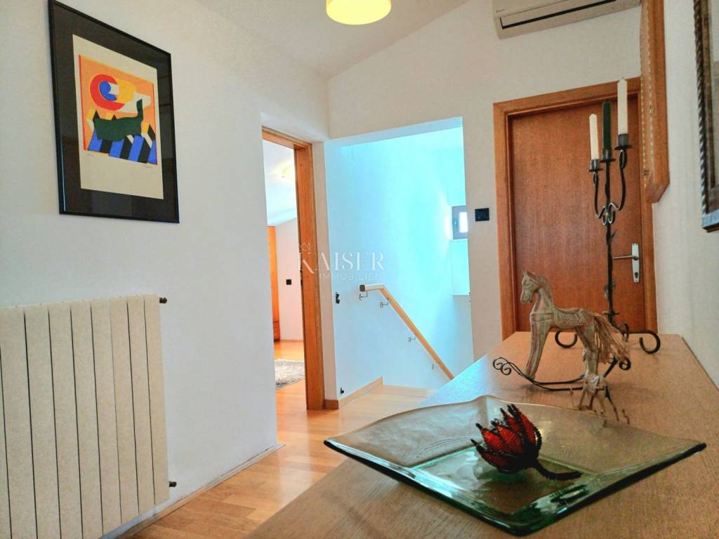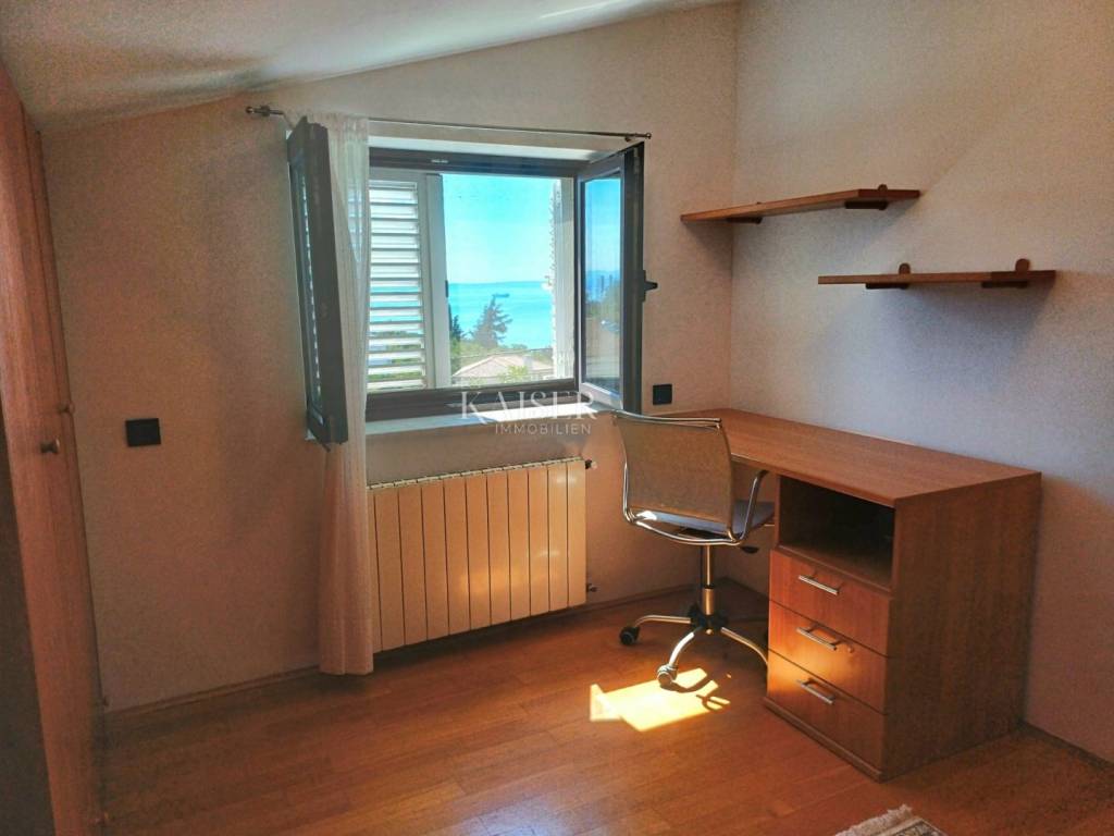 Kaiser-Immobilien Opatija presents a two-story apartment for rent in Martinkovac, area 130m2. The apartment is located in a quiet location, close to all facilities. The first floor consists of an entrance hall, which is designed as a study and a bathroom. the internal stairs lead to the first floor, which consists of a spacious living room connected to the dining room and kitchen, a hallway, three bedrooms and a spacious bathroom. From the living room there is a balcony with a wonderful view of the sea and the Opatija Riviera. A part of the garden with a barbecue is also available. The parking lot is closed, with an automatic gate. It is located in a quiet area, surrounded by greenery, and in the immediate vicinity is a shopping center, post office, sports hall, school, kindergarten, public transport and all other facilities. It is rented long-term. For additional information, contact the agent +385 99 673 1852