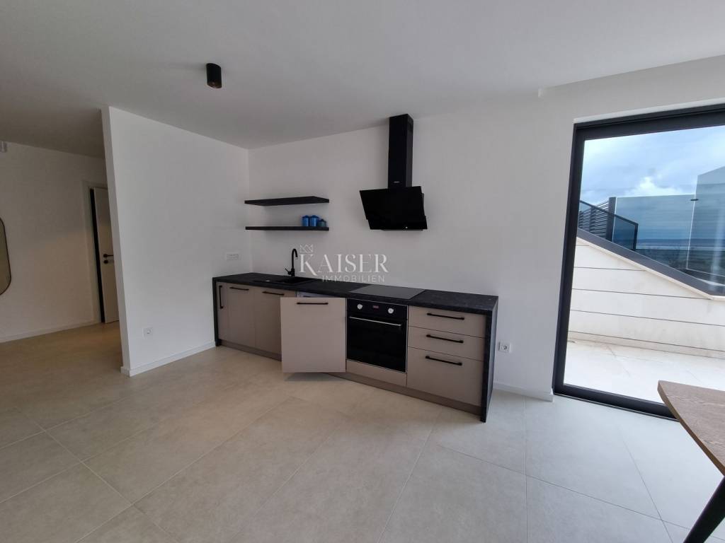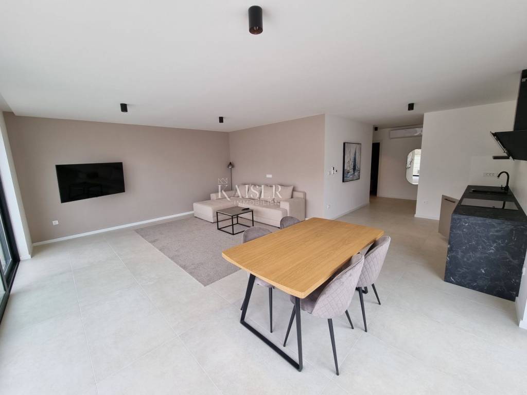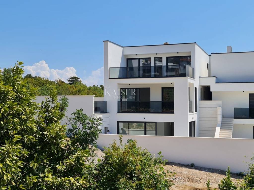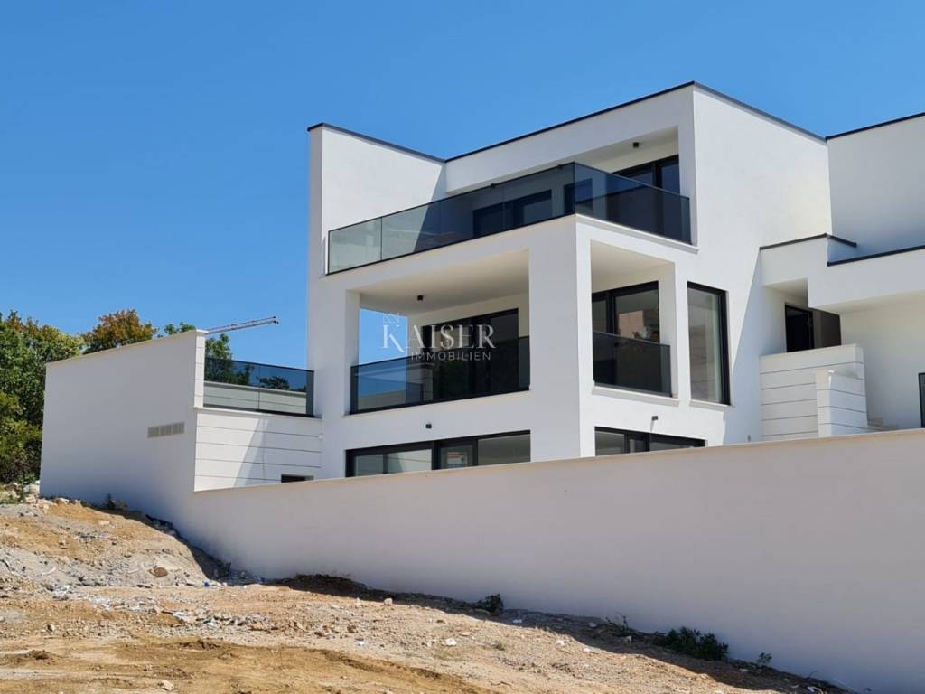 Kaiser Immobilien presents a wonderful luxury apartment in Crikvenica with a panoramic view of the sea, the island of Krk, Učka and Velebit. Description of the apartment: The apartment consists of a living room and a kitchen according to the concept of open space, a hallway, two bedrooms, each of which has its own bathroom, and a separate small toilet. The rooms lead out to a separate terrace behind the house with an area of 34 m2, of which 9 m2 is in the garden. At the front of the apartment there is a large terrace with a total area of 85 m2, of which 20.6 m2 is for the pool. The large terrace offers a wonderful panoramic view. From the large terrace you can enter the external storage room of 14 m2, while in the garage there is a smaller storage room of 4.56 m2. An elevator leads from the garage to the front door of the apartment. The door is anti-burglary, which can be unlocked with a key or smart fingerprint system. The price of the apartment includes an outdoor parking space for a car and a motorcycle, as well as a garage parking space, as well as a storage room. Each apartment has its own swimming pool with surroundings, and additional storage is available for the apartment. Technical characteristics: The building is built in a combination of concrete and brick blocks - Wienerberger Izo profi 25, which contains 15 cm of stone wool for the purpose of thermal insulation. The complete basement is in a reinforced concrete construction, and is thermally insulated with XPS-styrofoam 10 cm thick, and the waterproofing is done with a Sikaplan G 15 PVC membrane. The windows and doors are made of aluminum, Schuco AWS 65. The thermal insulation is solved with the Rofix facade system, with a thickness of 5 cm to 15 cm, depending on the part of the building, and the roof surface has 20 cm of styrofoam and a Sikaplan TPO membrane. All external vertical surfaces of the fence walls are covered partly with Brac stone and partly with Istrian Kanfanar. The grounds of the courtyard and terrace are covered with ceramics, as are the swimming pools. Each pool has a waterfall and preparation for water heating. The parking spaces are covered with Semmerlock concrete blocks. The interior of the apartment, i.e. the floor coverings, are wooden. Bathrooms and toilets are fully furnished. The ceilings of the apartments are covered with the Knauf system and additional thermal insulation. The apartment is heated with floor heating on a heat pump, and cooling with an air conditioning system, in each room separately. The complete system is manufactured by Vaillant. The facility is equipped with an alarm and video surveillance. Heating, cooling, starting blinds can be done via the smart system. Distance from the apartment: Rijeka Airport - 20 km Pula Airport - 1412 km Zagreb Airport - 176 km Ljubljana - 147 km Munich - 548 km Vienna/Vienna - 523 km Prague - 846 km Shop - 800 m Beach - 800 - 1500 m Restaurant - 200 - 1000 m Agency commission for the customer is 3% + VAT. The commission covers all services related to the purchase and is paid only in the case of real estate purchase, at the conclusion of the first legal act. For more information or to arrange a viewing, contact our agent.