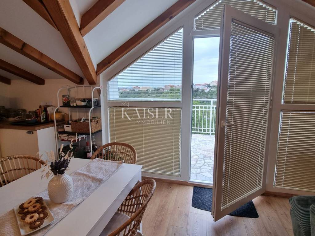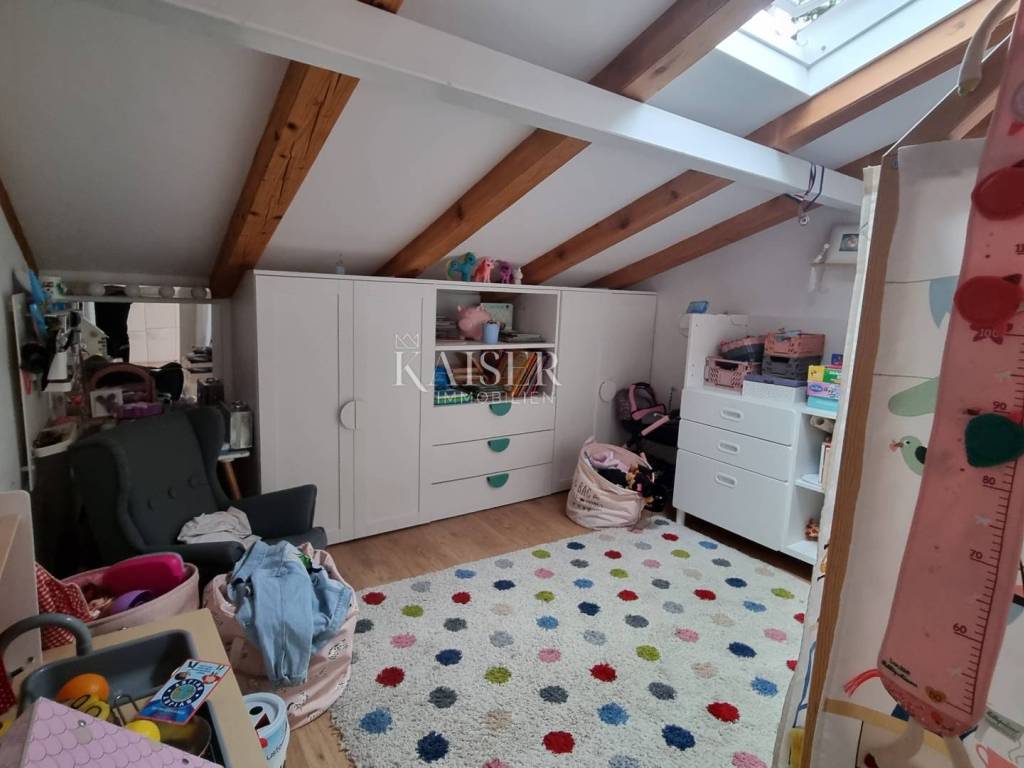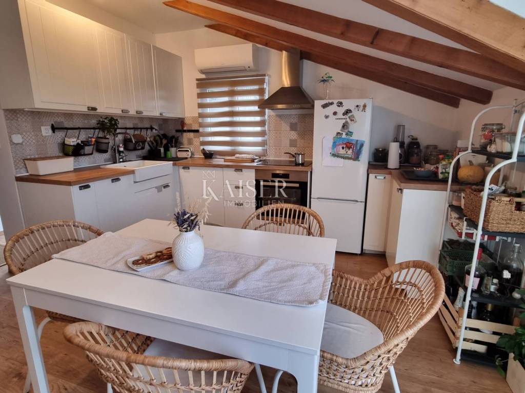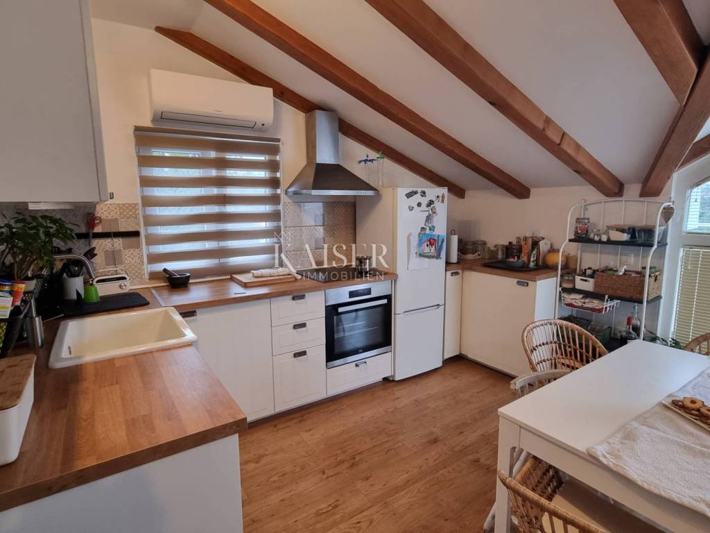 Kaiser Immobilien presents a wonderful apartment in Novi Vinodolski, only 500 meters from the sea. The apartment is located in the attic of a residential building with a total of 5 apartments and has a total area of 101.39 m2. The apartment is fully equipped with electricity, water, drainage, external insulation and facade, and roofing. Two Velux skylights with a 15-year warranty were installed, Styrodur, wool, paneling and Knauf were used for insulation. The apartment consists of: Living room and kitchen - 31.67m2 Room - 12.90m2 Room - 12.63m2 Corridor - 7.24m2 Bathroom - 9.10m2 Terrace - 23.05m2 Entrance stairs - 4.80m2 The apartment is heated and cooled on two Daikin air conditioners that can heat a total of 120m2 of space. The apartment is sold fully furnished, and it also has one parking space and a common area in the garden where there is a fireplace and a garden house for socializing, as well as a children's area. The location of the apartment is close to all amenities, 500m from the sea, 30m from the shop, and 300m from the city center.