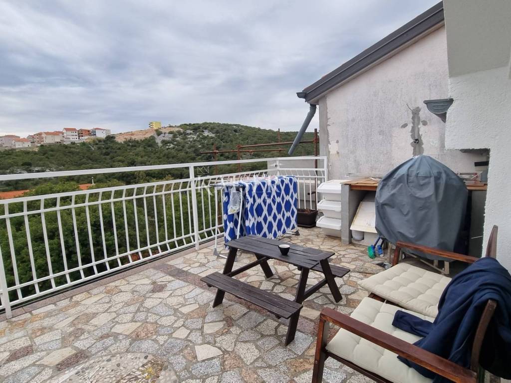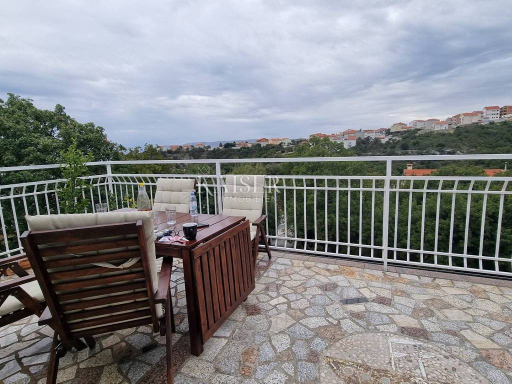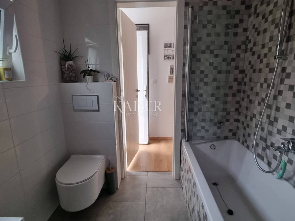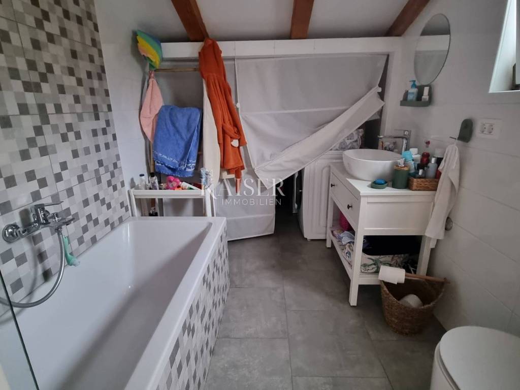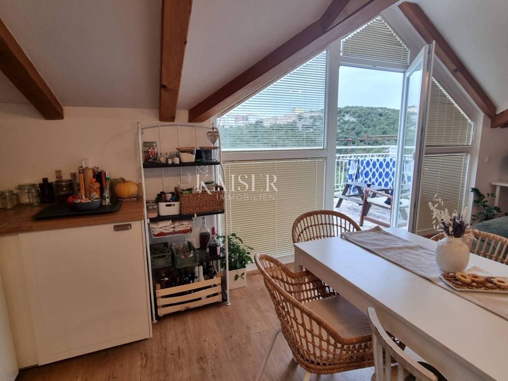 Kaiser Immobilien presents a wonderful apartment in Novi Vinodolski, only 500 meters from the sea. The apartment is located in the attic of a residential building with a total of 5 apartments and has a total area of 101.39 m2. The apartment is fully equipped with electricity, water, drainage, external insulation and facade, and roofing. Two Velux skylights with a 15-year warranty were installed, Styrodur, wool, paneling and Knauf were used for insulation. The apartment consists of: Living room and kitchen - 31.67m2 Room - 12.90m2 Room - 12.63m2 Corridor - 7.24m2 Bathroom - 9.10m2 Terrace - 23.05m2 Entrance stairs - 4.80m2 The apartment is heated and cooled on two Daikin air conditioners that can heat a total of 120m2 of space. The apartment is sold fully furnished, and it also has one parking space and a common area in the garden where there is a fireplace and a garden house for socializing, as well as a children's area. The location of the apartment is close to all amenities, 500m from the sea, 30m from the shop, and 300m from the city center.